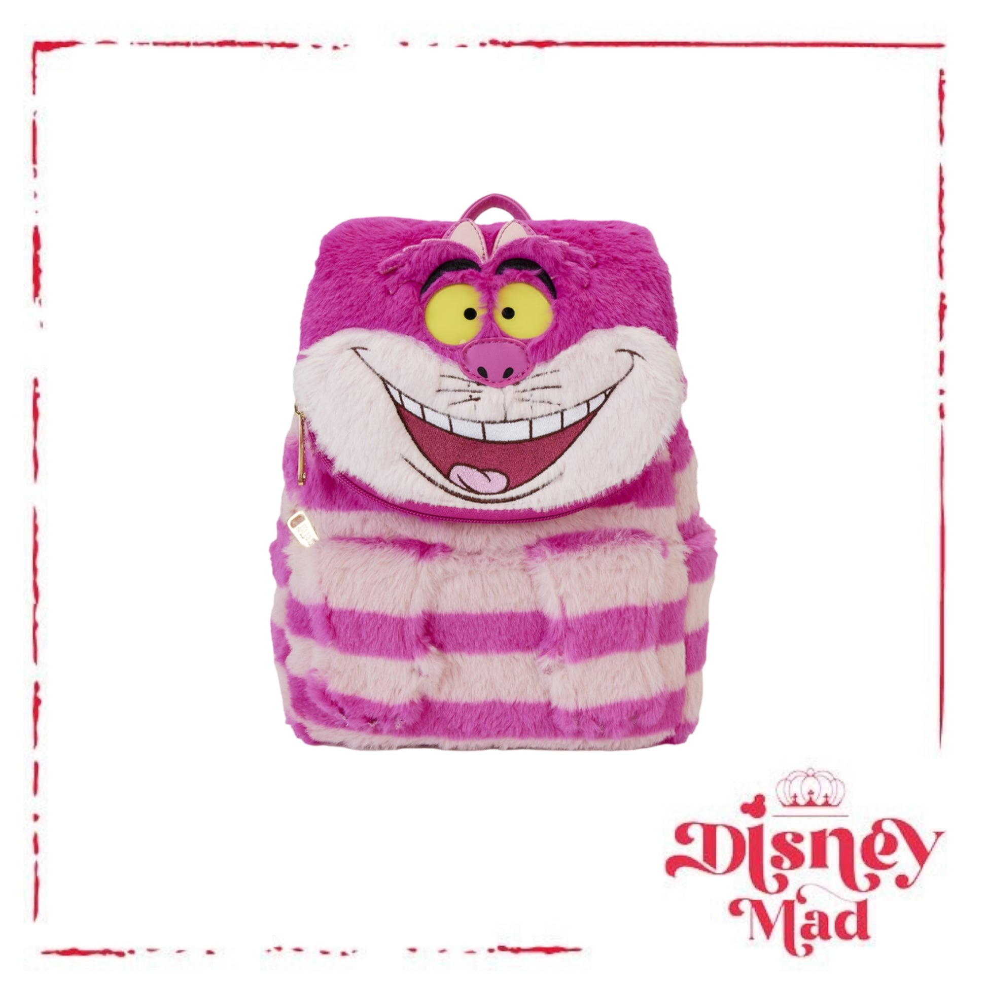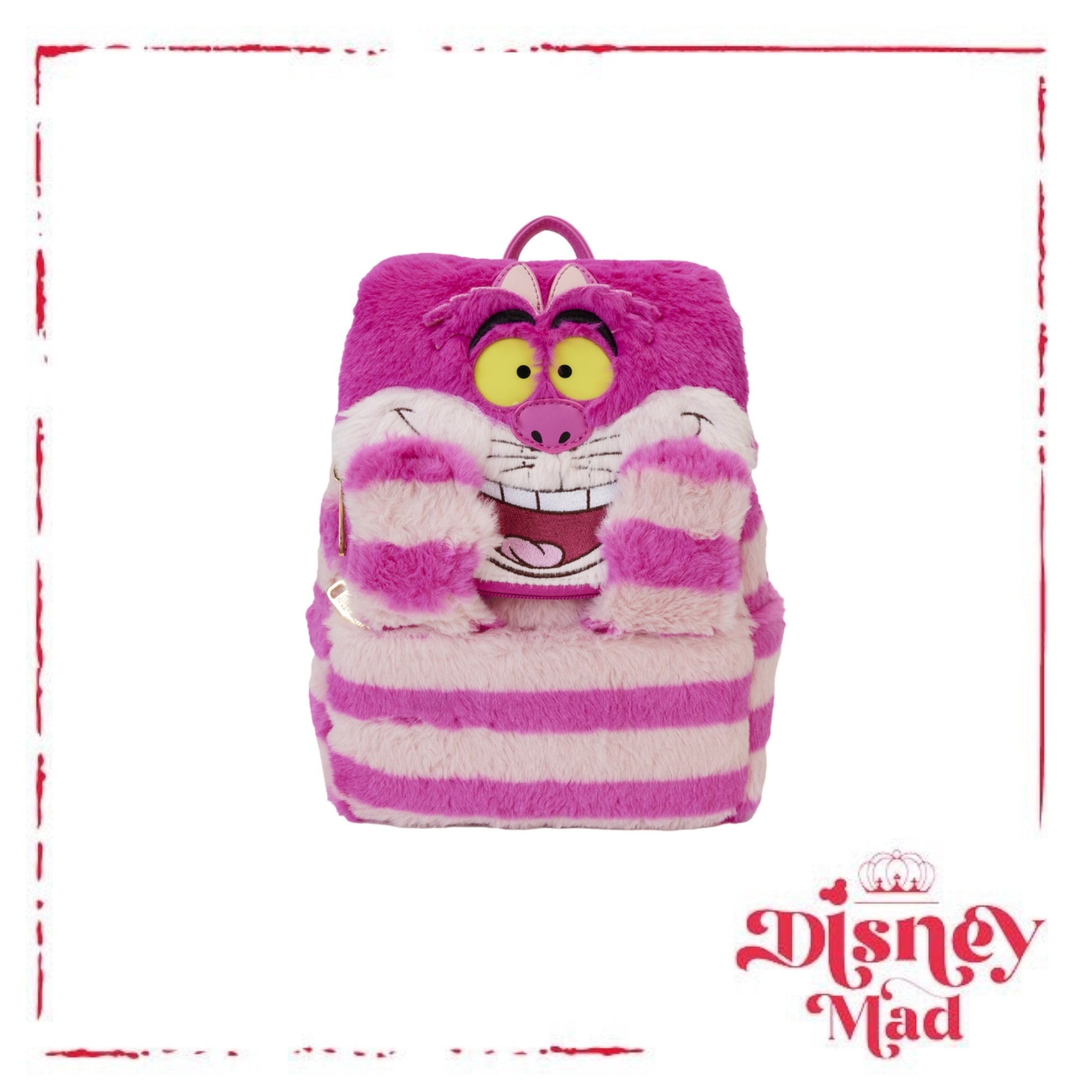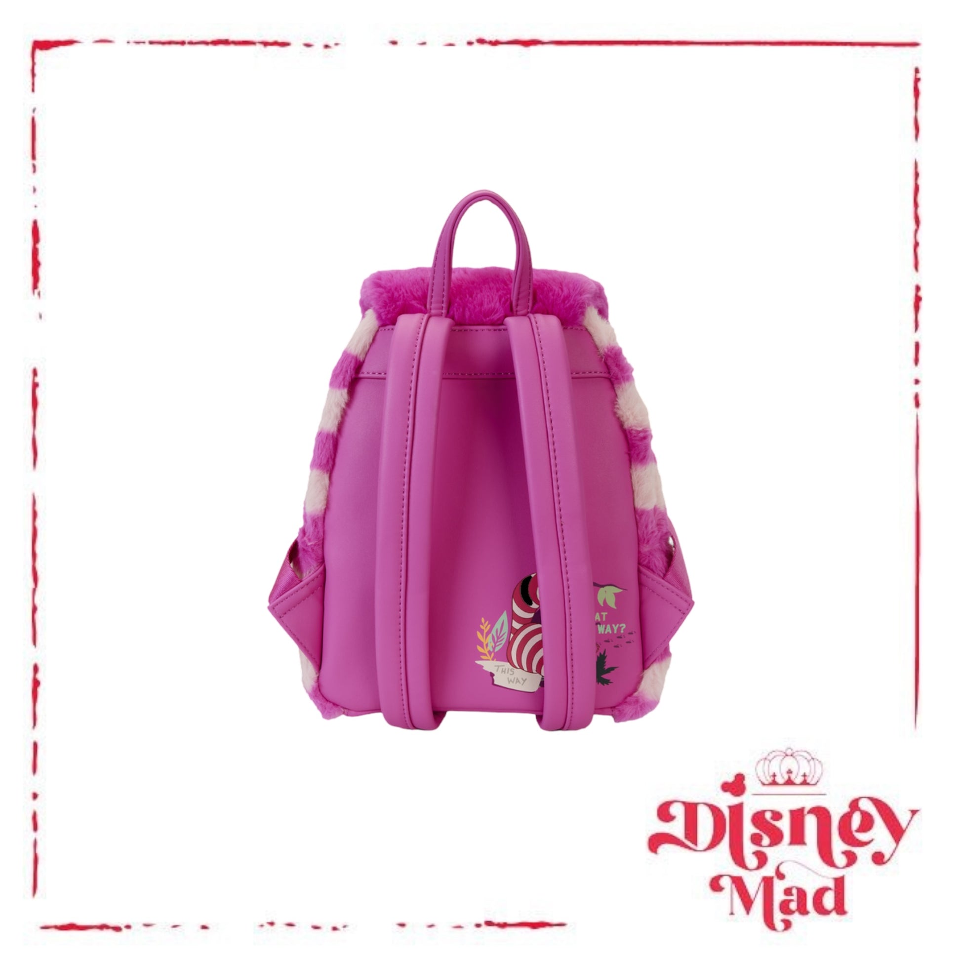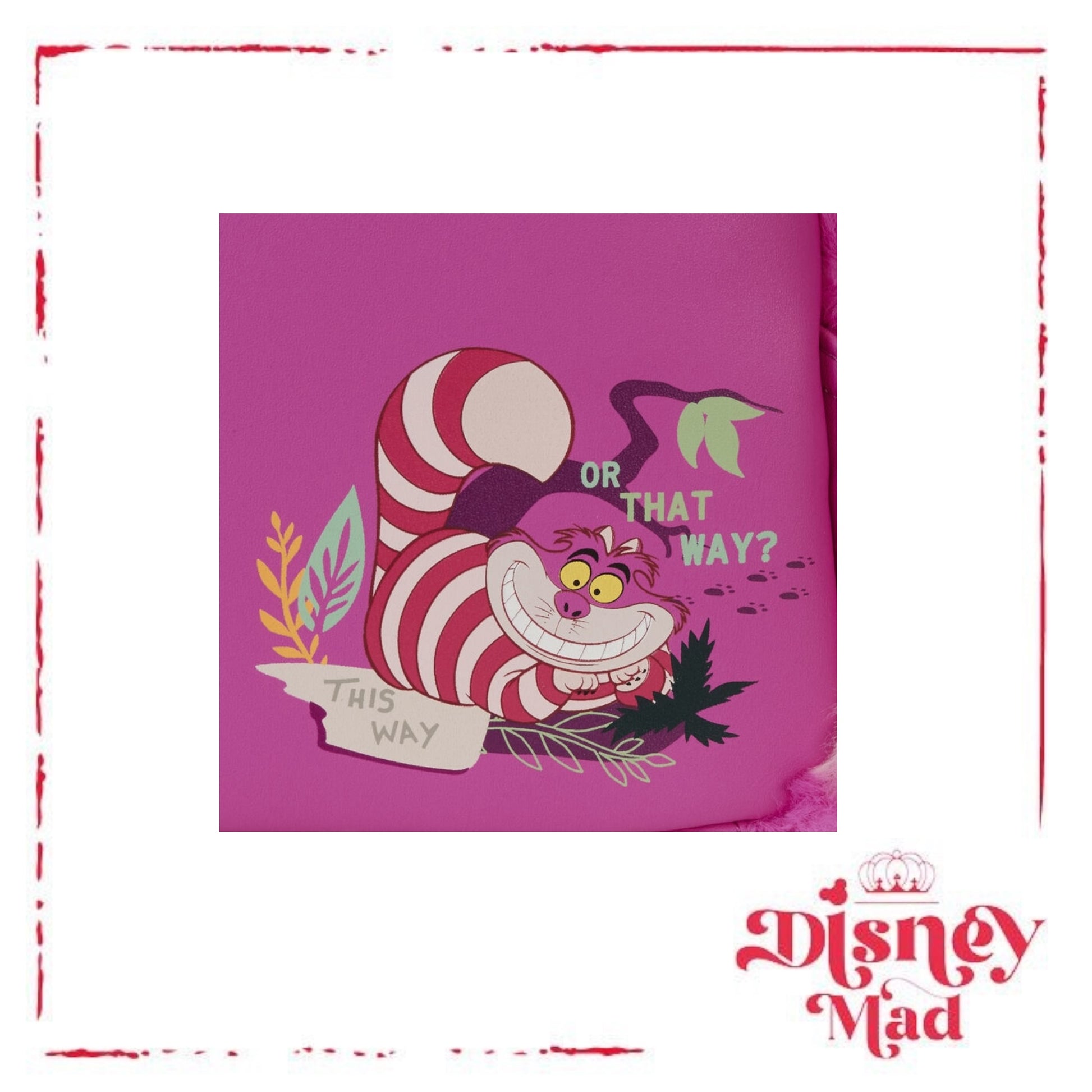 Loungefly Disney Alice in WonderlandCheshire Cat Plush Pocket Mini Backpack. This delightful accessory is covered in soft plush material in the Cheshire Cat’s colors and stripes. On the front, the Cheshire Cat’s face appears in embroidered, applique, and plush detail. And in the dark, his eyes light up! A zipper pocket, just below his chin, is the perfect place for securing smaller items during your journeys. There’s also another convenient hidden zipper compartment behind his applique paws, which snap in place with buttons. Plush details continue on the side pockets and the top, and on the back, the Cheshire Cat makes an encore appearance as a delightful print, pointing to the signs “this way” and “that way.” Have a wonder of adventures with this stylish accessory.