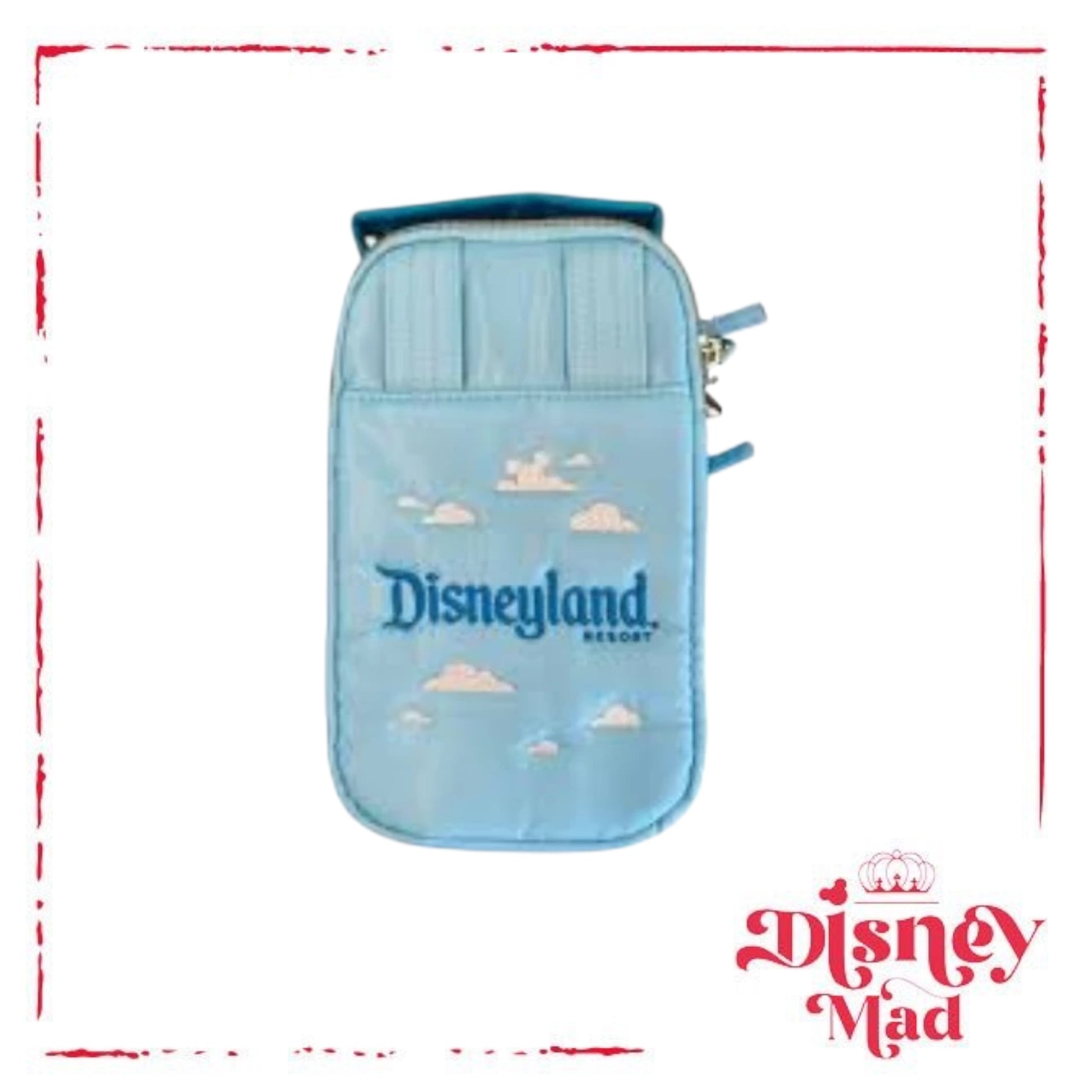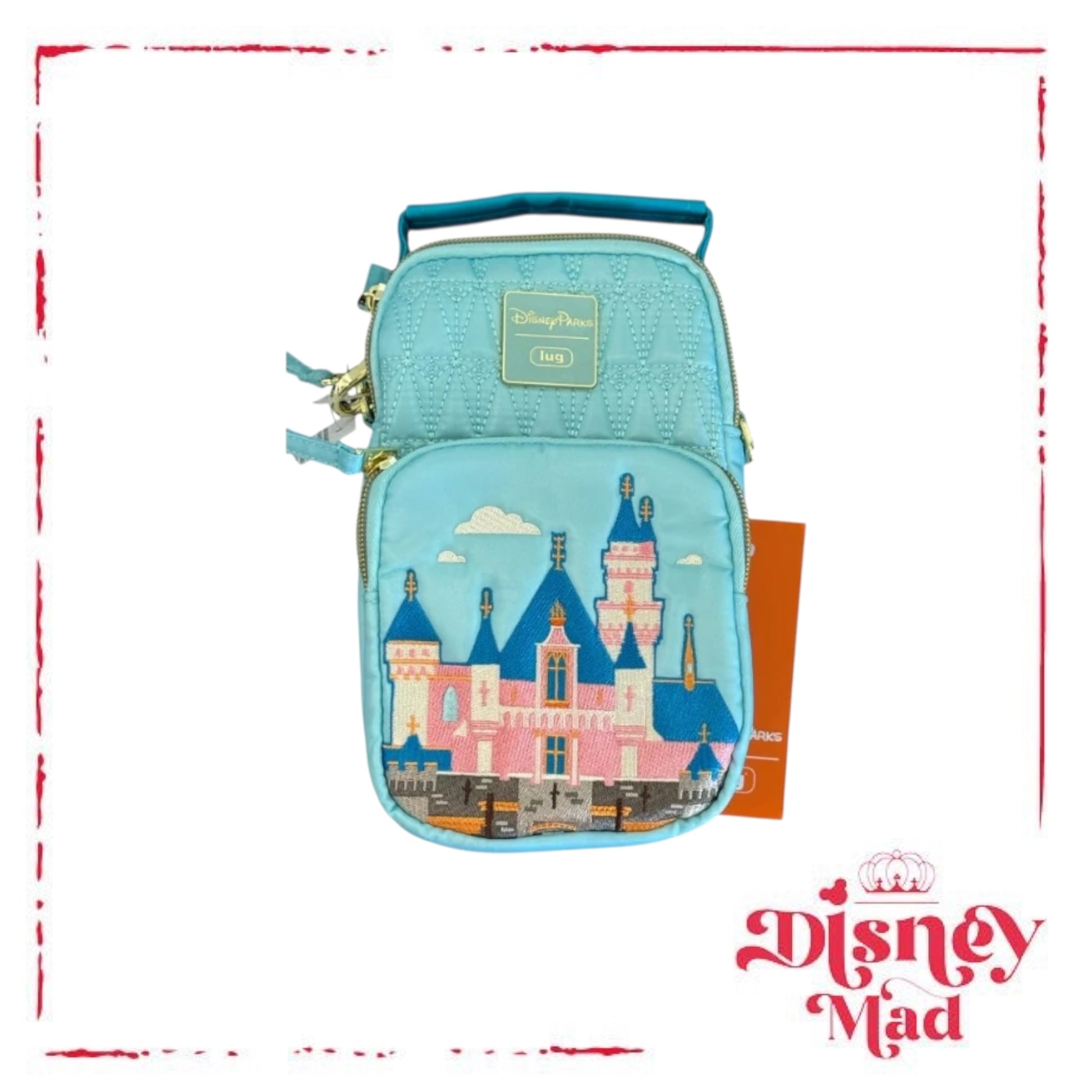 The Lug bag is a light blue crossbody purse that features Sleeping Beauty Castle.The top of the bag displays pennant-shaped stitching with the Disney Parks | Lug plaque at the center. The top of the bag contains a darker blue carry handle and a zip closure.The back of the bag features an embroidered Disneyland Resort logo in blue text surrounded by clouds and a hidden Mickey is depicted in one of them. The bag contains two loops to attach to a belt.