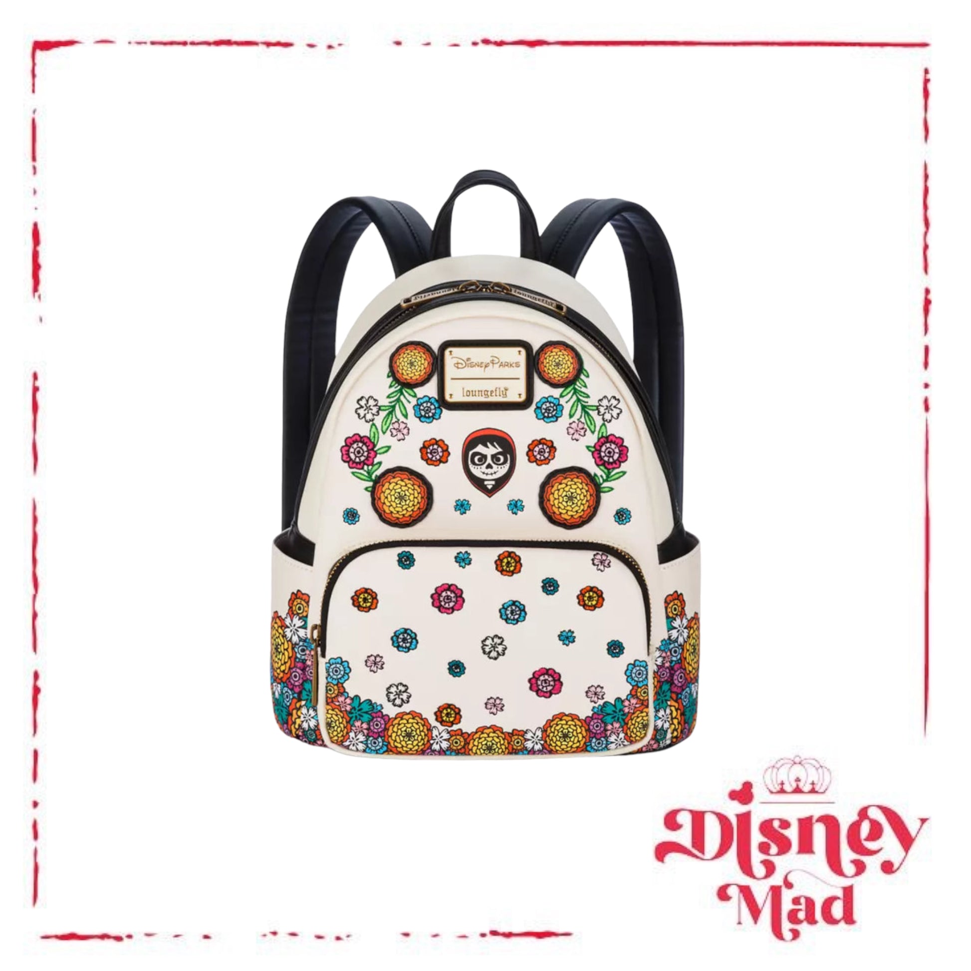 A stylish carryall in any realm, this Coco Loungefly mini backpack features screen art of adorable Miguel surrounded by a mix of embroidered, appliqué and screen art flowers. The interior is lined with an allover pattern featuring colorful icons inspired by the Disney and Pixar film. Classic Loungefly styling includes a double zippered main compartment, a front zippered pocket and side slip pockets. Part of the Coco Collection, it's ideal for the season but it's perfect for any dia of the year.
