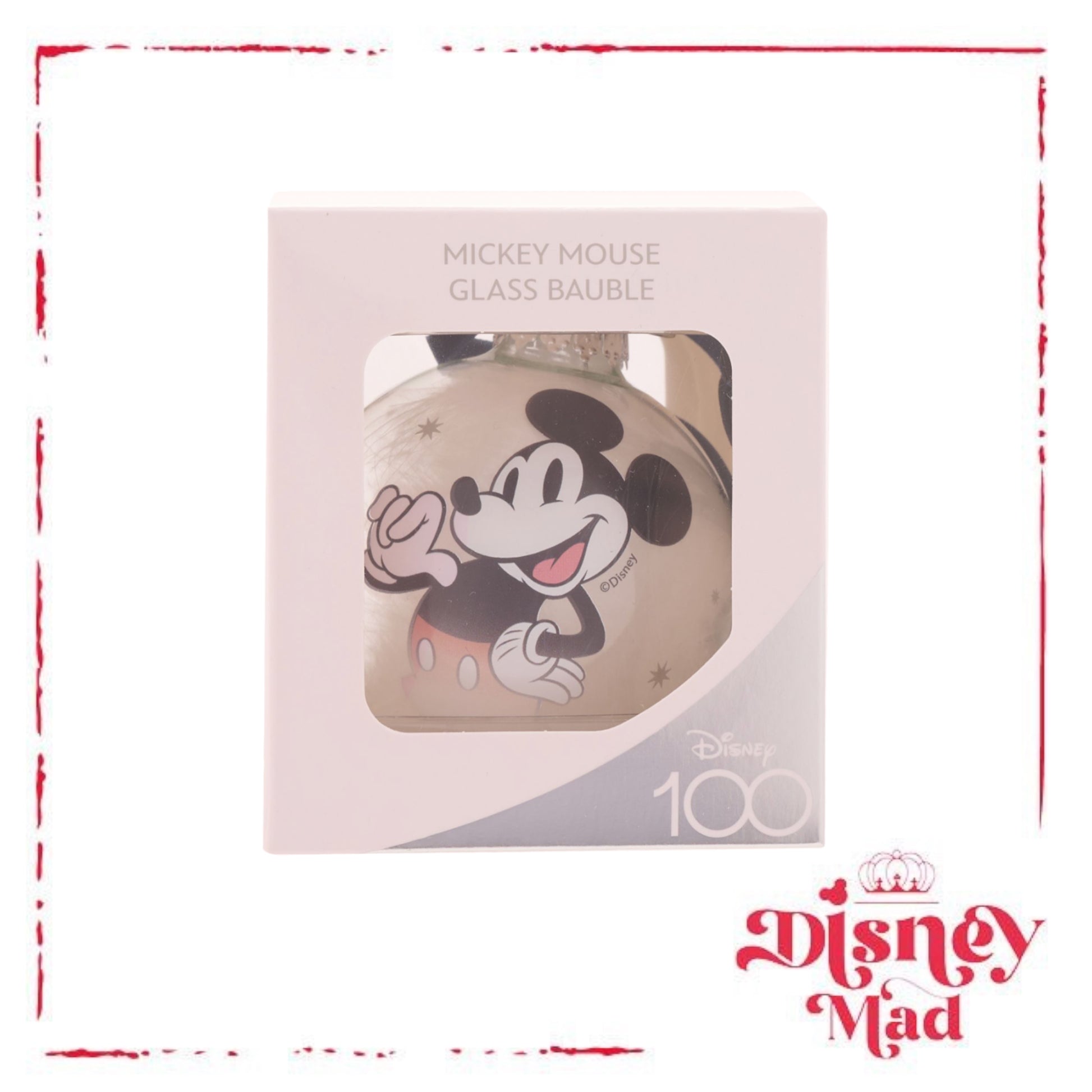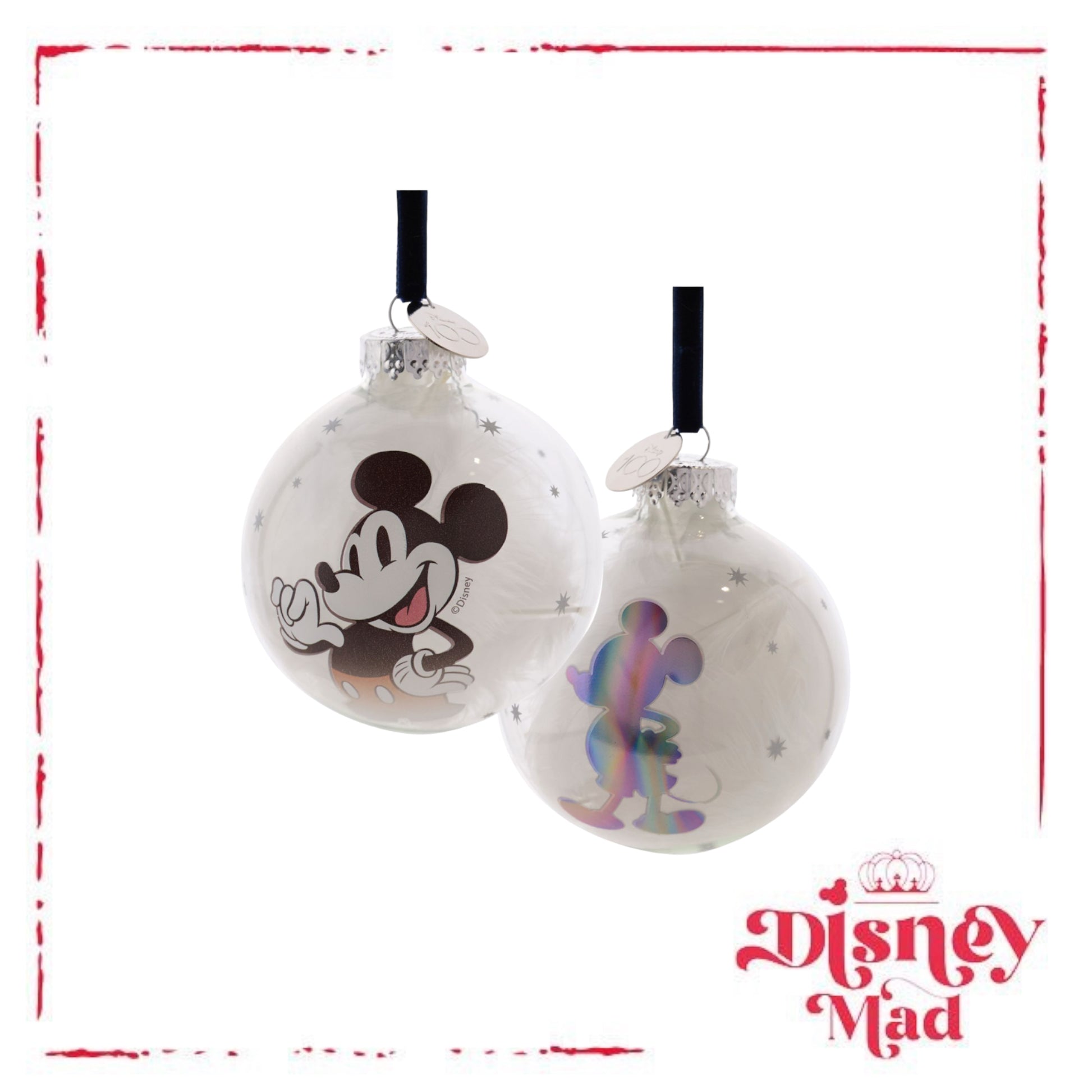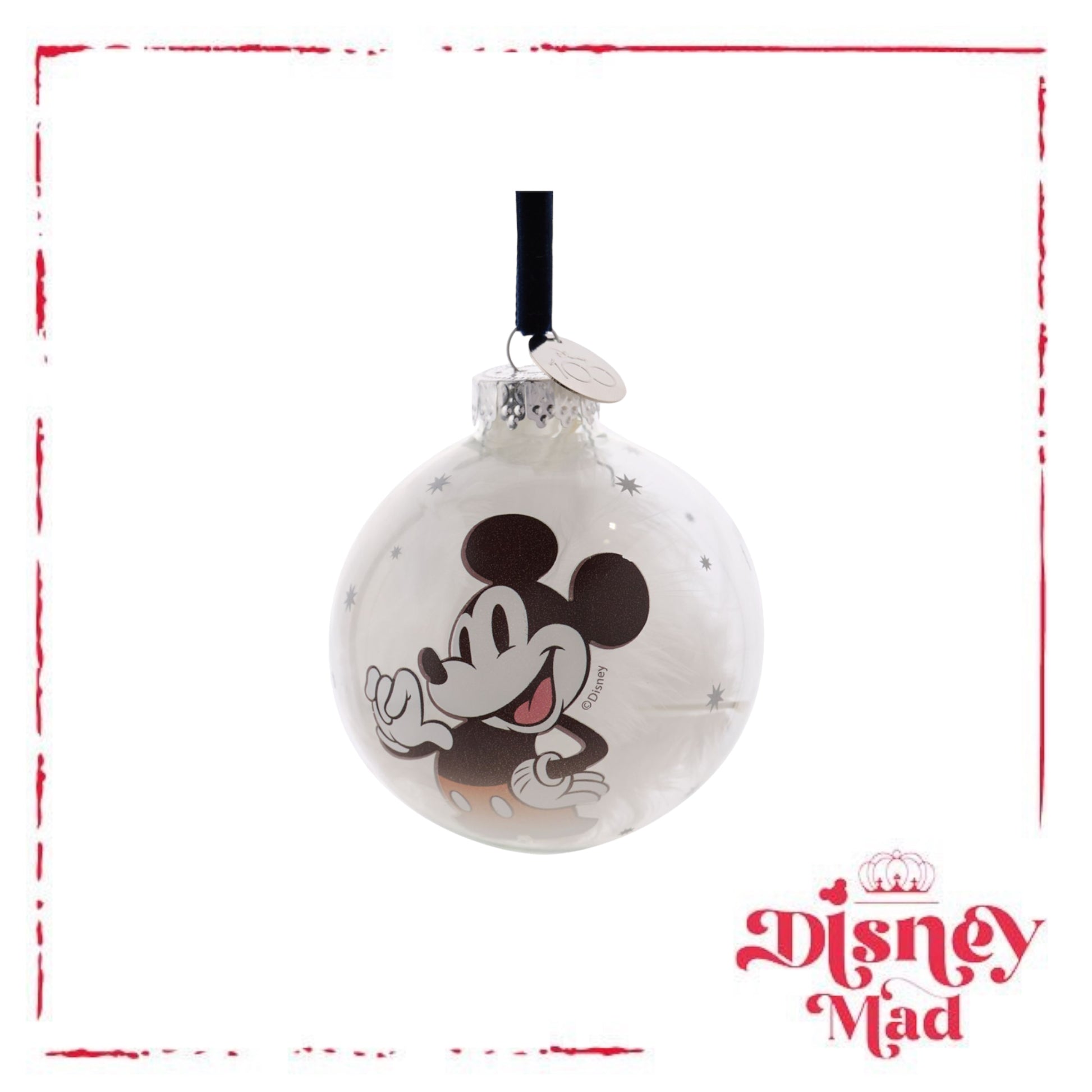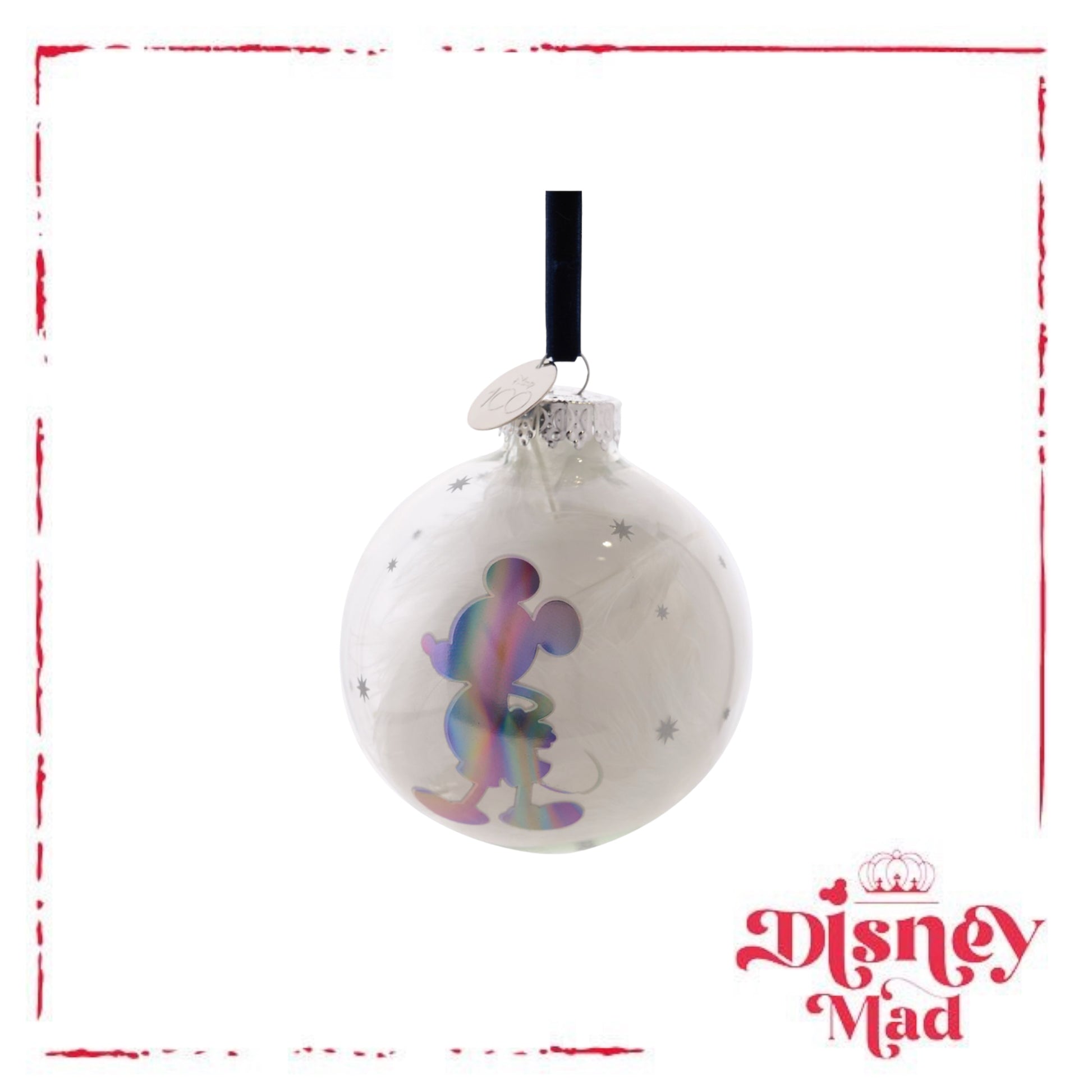A Mickey Mouse glass bauble from Disney 100 by DISNEY®. This limited edition tree decoration captures the true magic of Disney on its centenary and can be enjoyed by fans of all ages at Christmas. The clear glass bauble showcases a printed image of Mickey Mouse, complete with reverse silhouette image, and filled with bright white feathers. It is finished by a silver topper, upon which the blue velvet ‘Disney 100’ hanger is attached alongside a matching silver metal charm. Bauble is packaged in a generic open box.