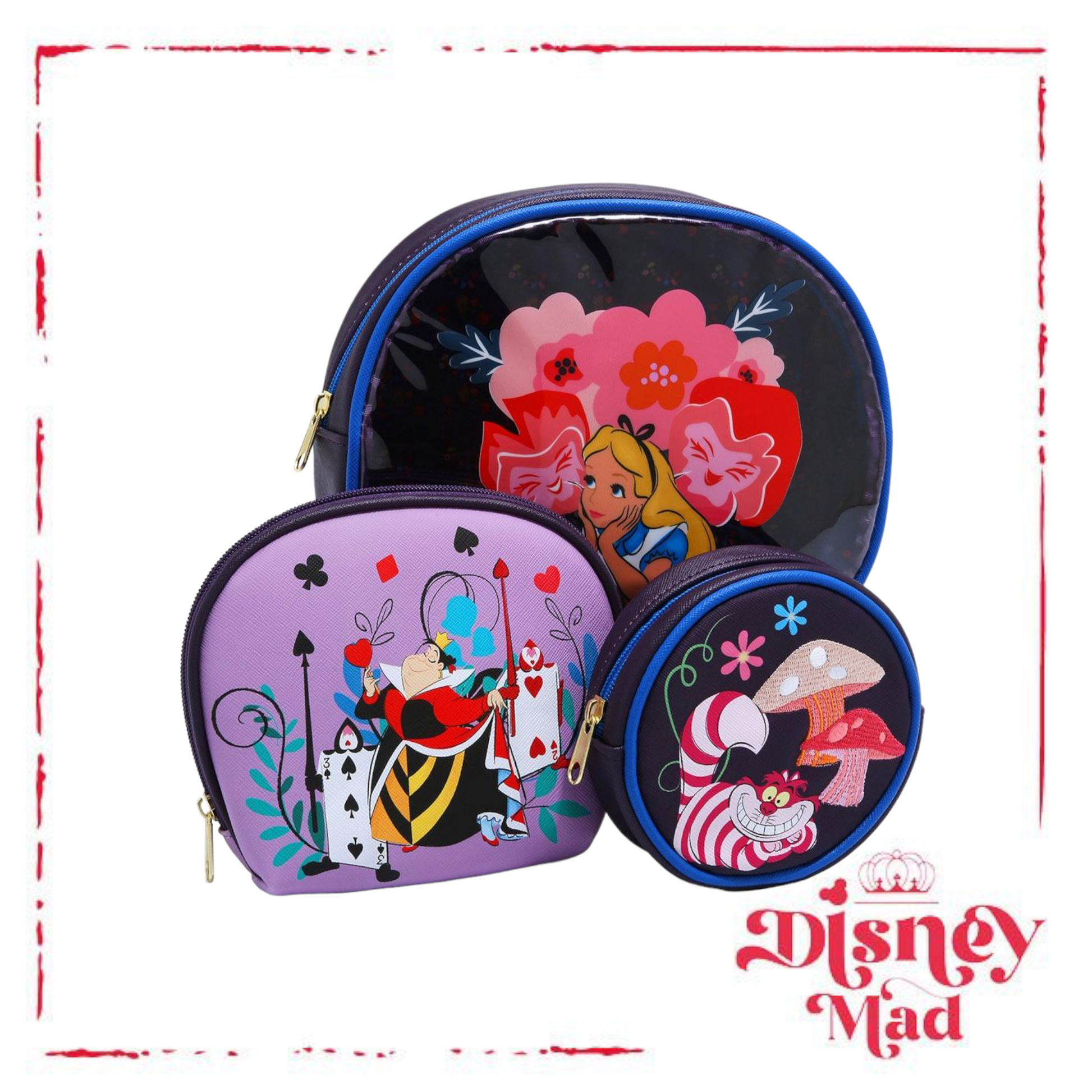 Let your imagination run wild for your next makeup look! You'll feel like you're still dreaming during your morning routine when Alice, the Cheshire Cat, the Queen of Hearts, and the talking flowers from Alice in Wonderland join you on this cosmetic bag set. With plenty of room to store brushes, makeup, and bathroom essentials, this set includes three zippered pouches with graphic and embroidered imagery from the Disney classic.