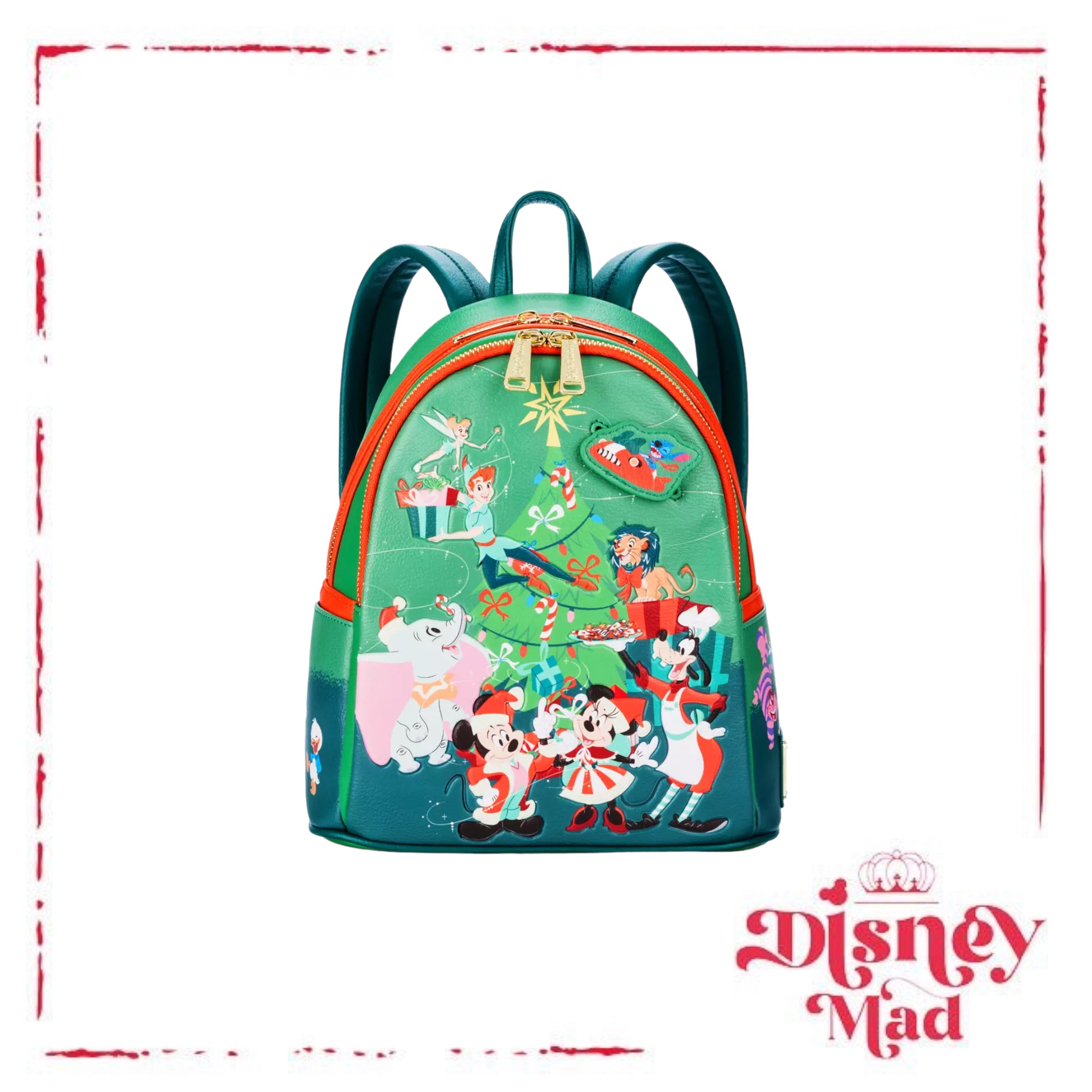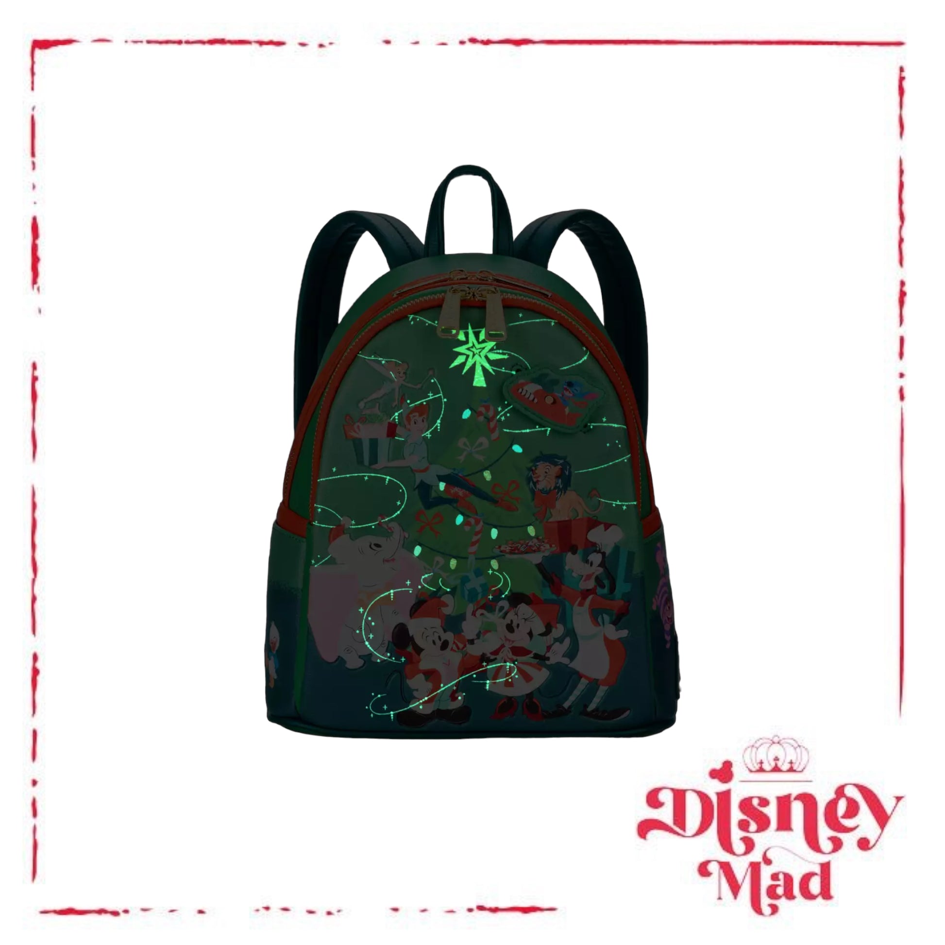 A wonderful world of classic Disney characters gather 'round the Christmas tree to celebrate a happy holiday season with you and this Loungefly mini backpack. Embossed screen art on front with matching pattern on sides and back lets admirers of the animated classics carry their seasonal essentials to wherever the party leads. Tree topper star glows in the dark or under black light.