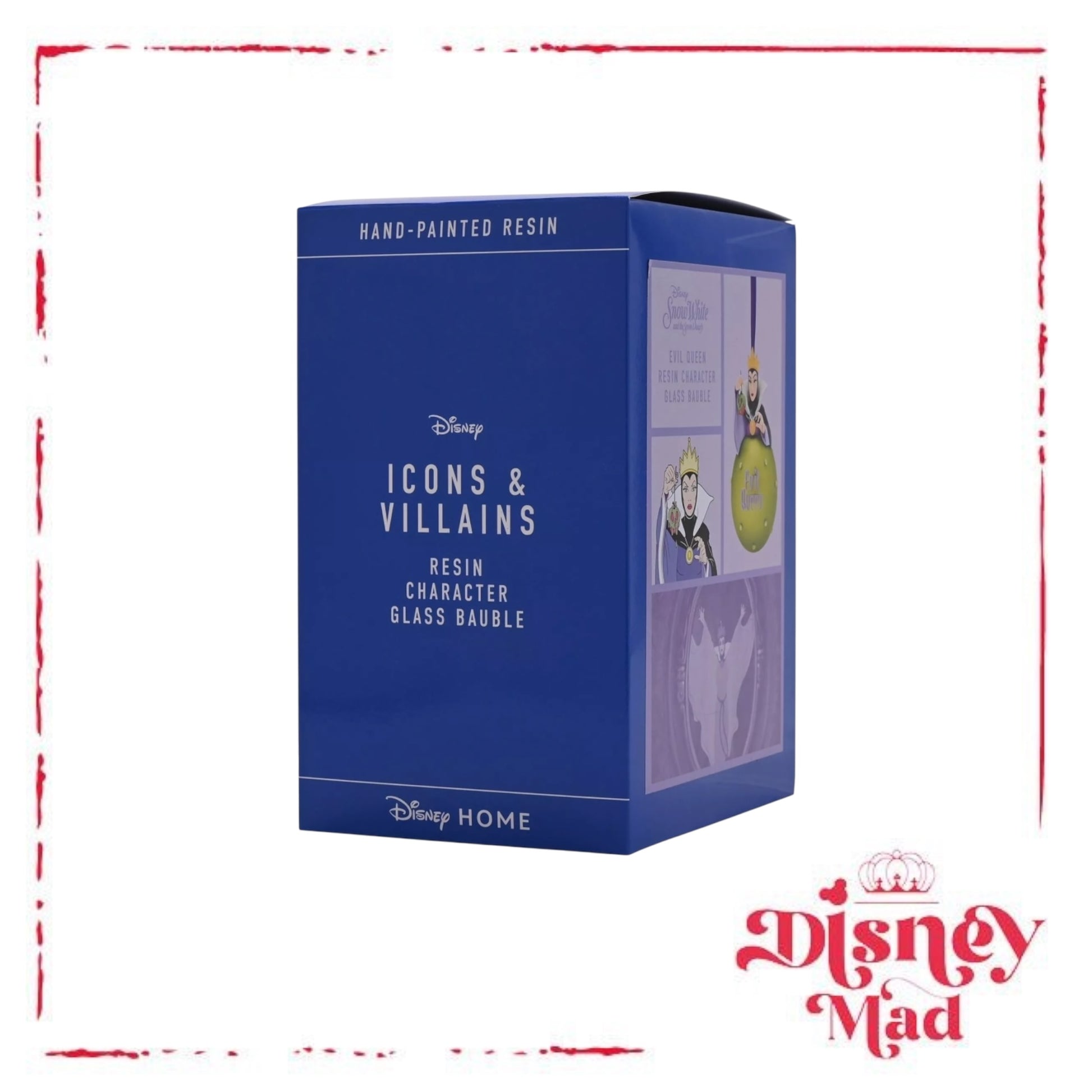This charming Disney Evil Queen glass bauble brings a touch of fairytale magic to home decor. Adorned with the iconic character from Snow White, this ornament makes a wickedly wonderful gift for Disney fans. Crafted from glass with a glazed finish, the bauble depicts the villainous queen's pale face and black cowl in fine detail. A regal purple ribbon allows this tree decoration to be hung with ease. Enable fans to give their Christmas tree a delightfully dark twist with this Evil Queen bauble.