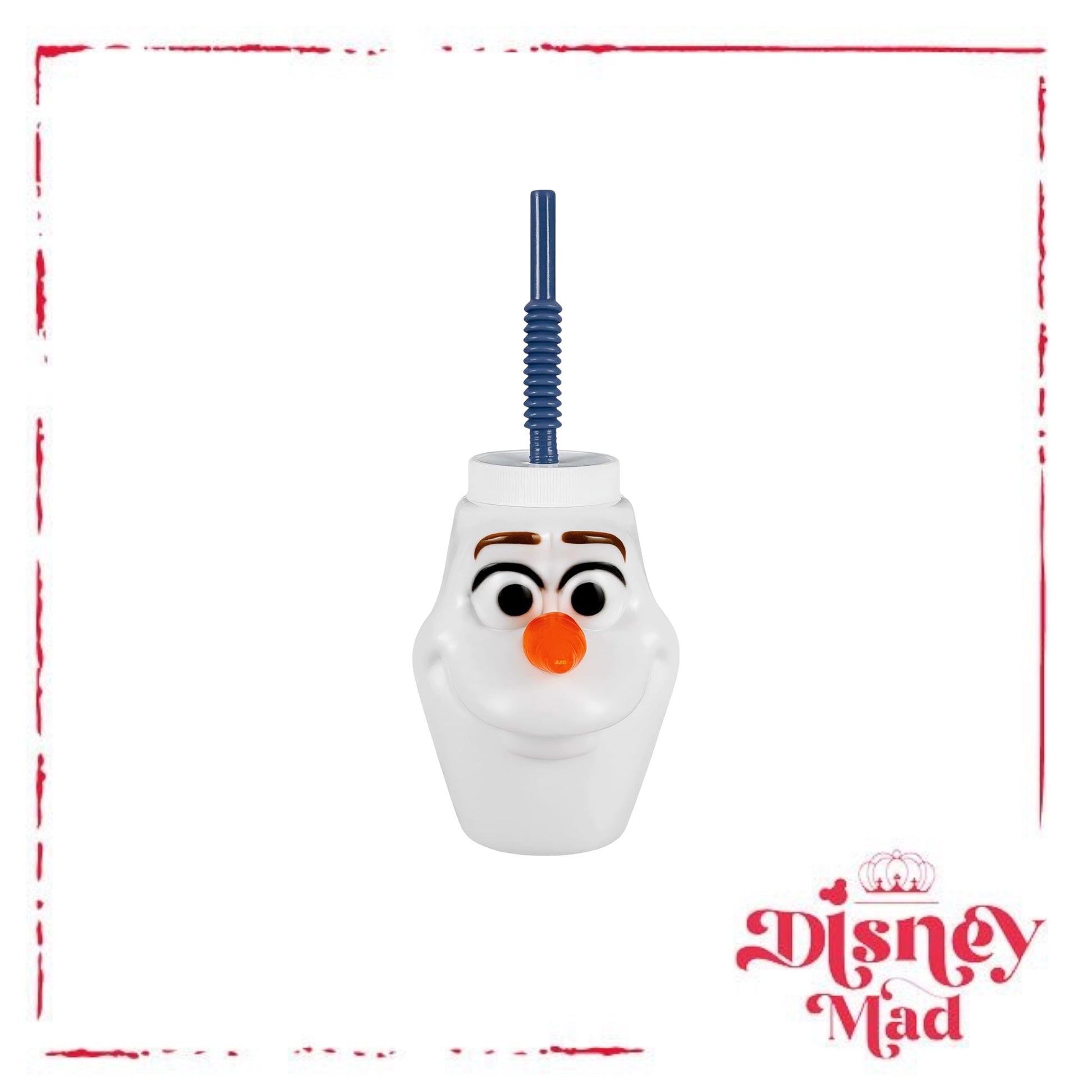 - ADORABLE DESIGN: This Olaf cup with straw is shaped like Olaf's head with a carrot nose and a smiley expression. The wide and smiley mouth allows you to fill it with ice cubes and the blue plastic flexible straw is shaped so it never falls out of the screw-on lid.