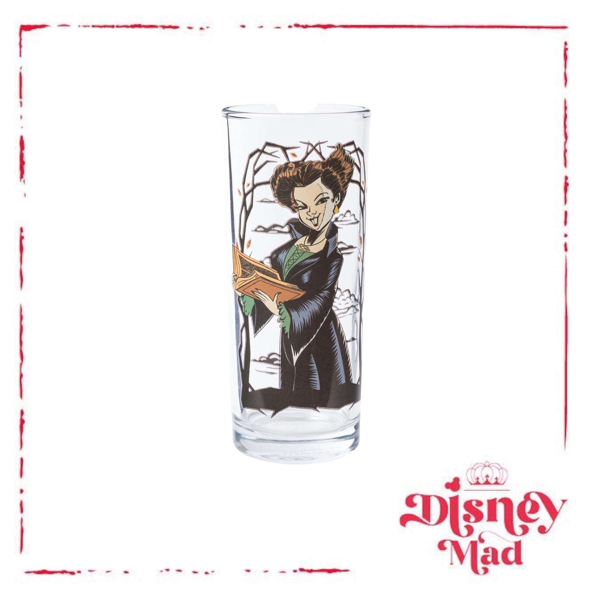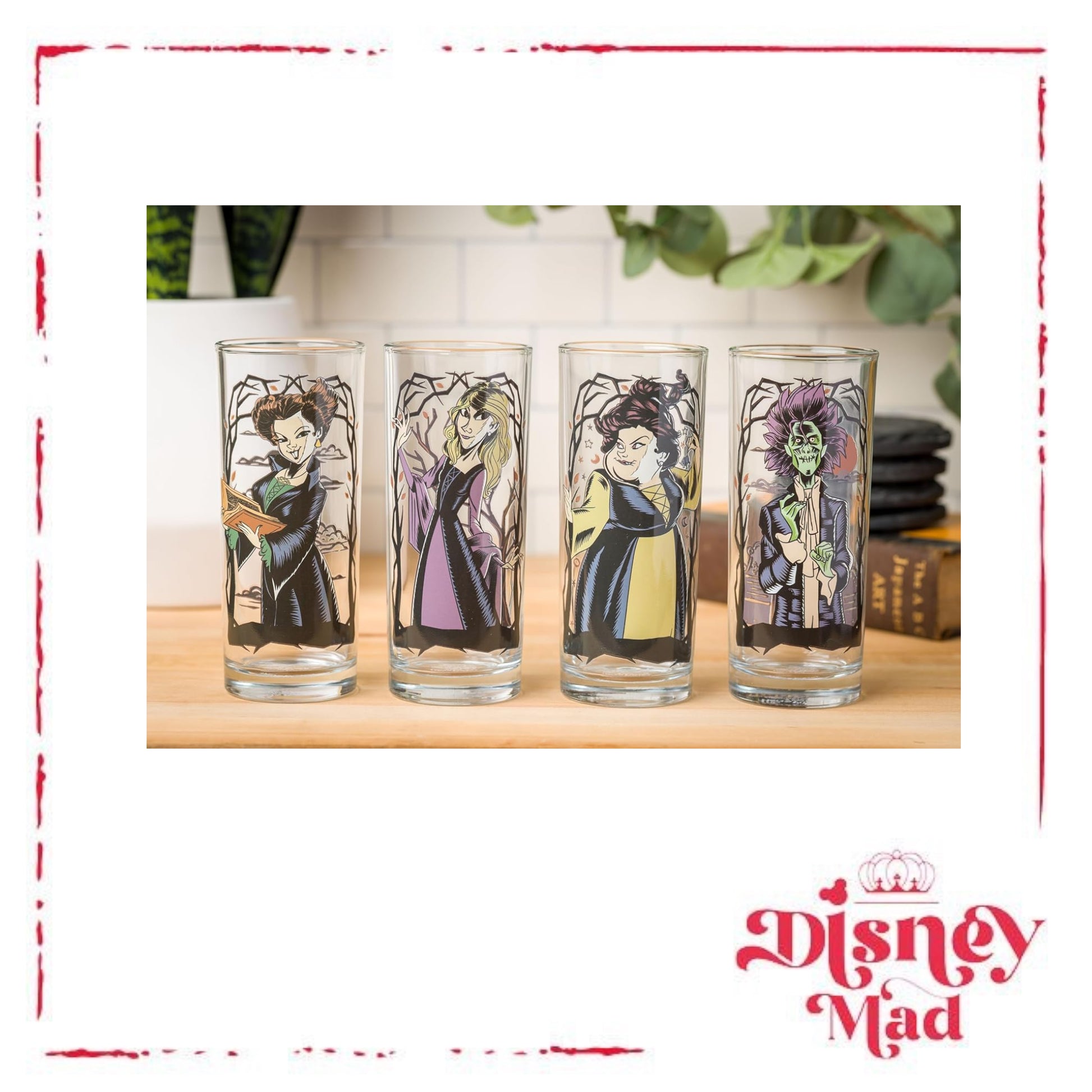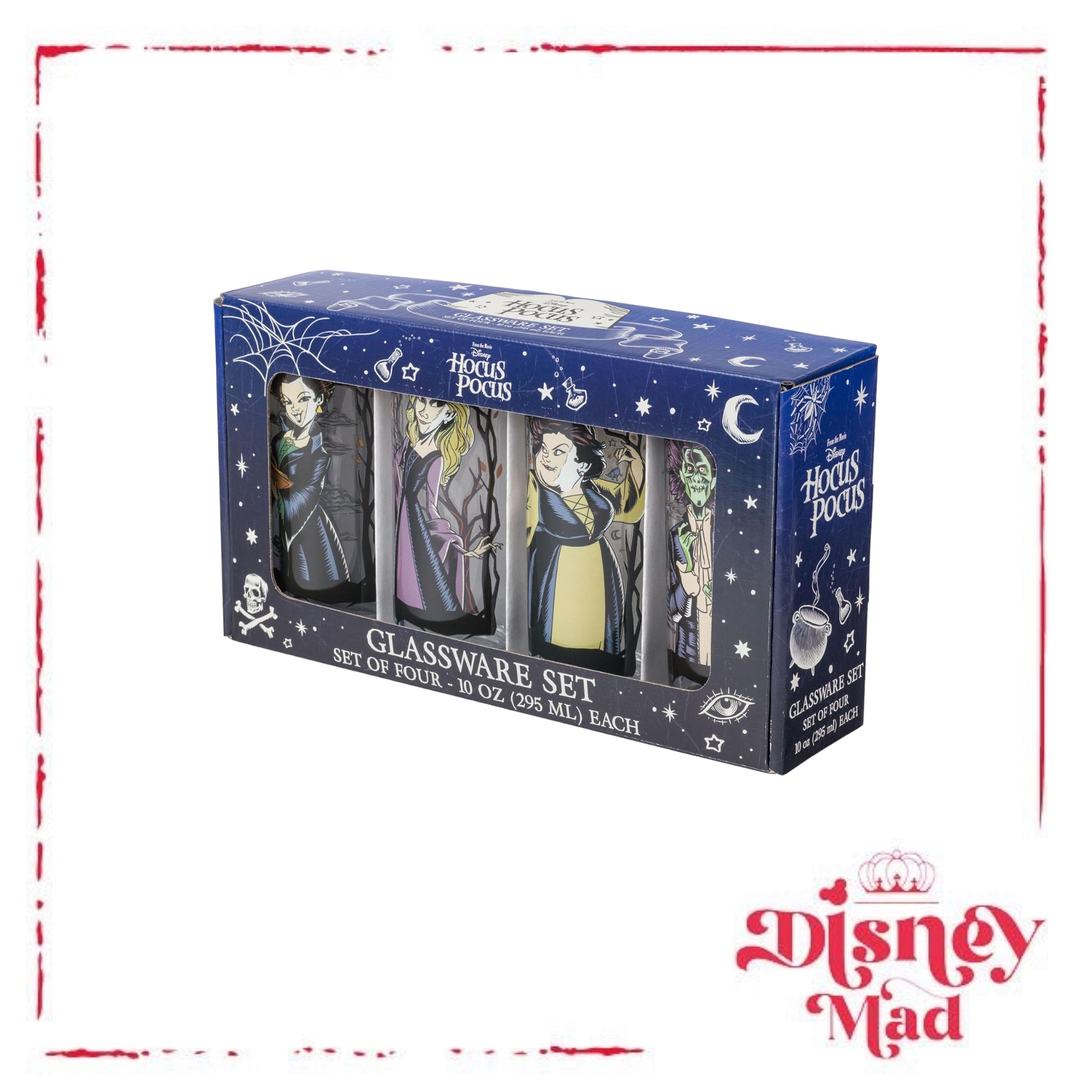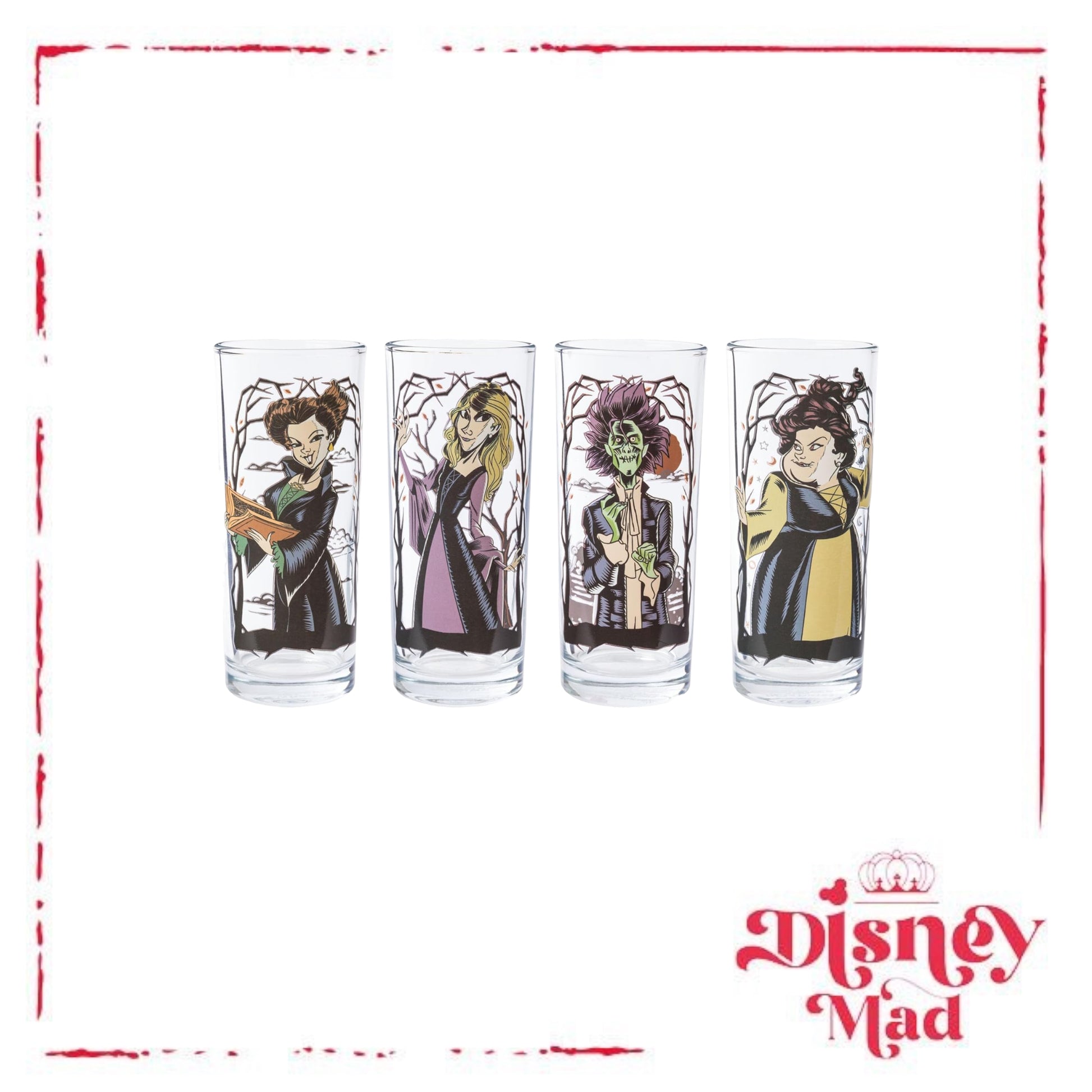 - TUMBLER SET: This 4-pack of glass tumblers holds up to 10 ounces of your favorite beverage and features your favorite witchy characters from Hocus Pocus against twisty Tree Frames.