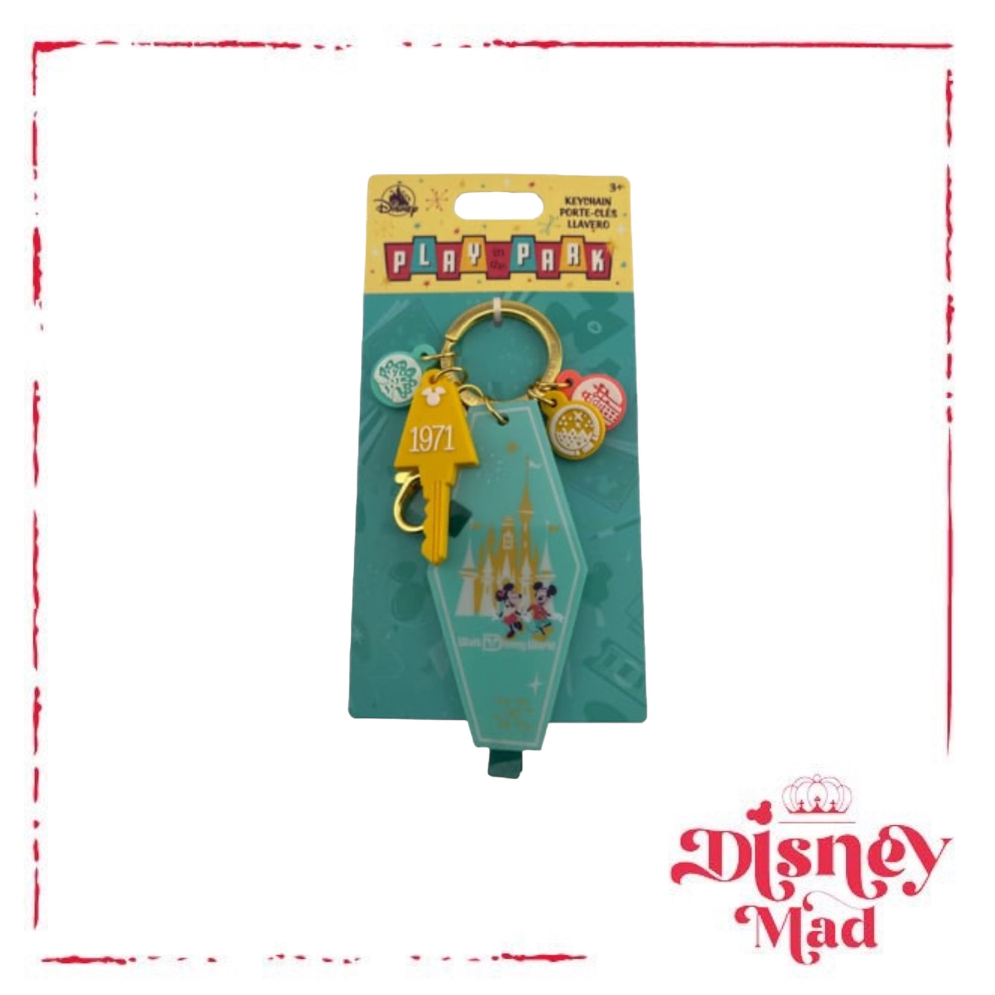This Play in the Park Retro hotel style Keychain is a nice addition to your keyring. Features charms to represent each park along with a Key with 1971 that represents the year they opened.