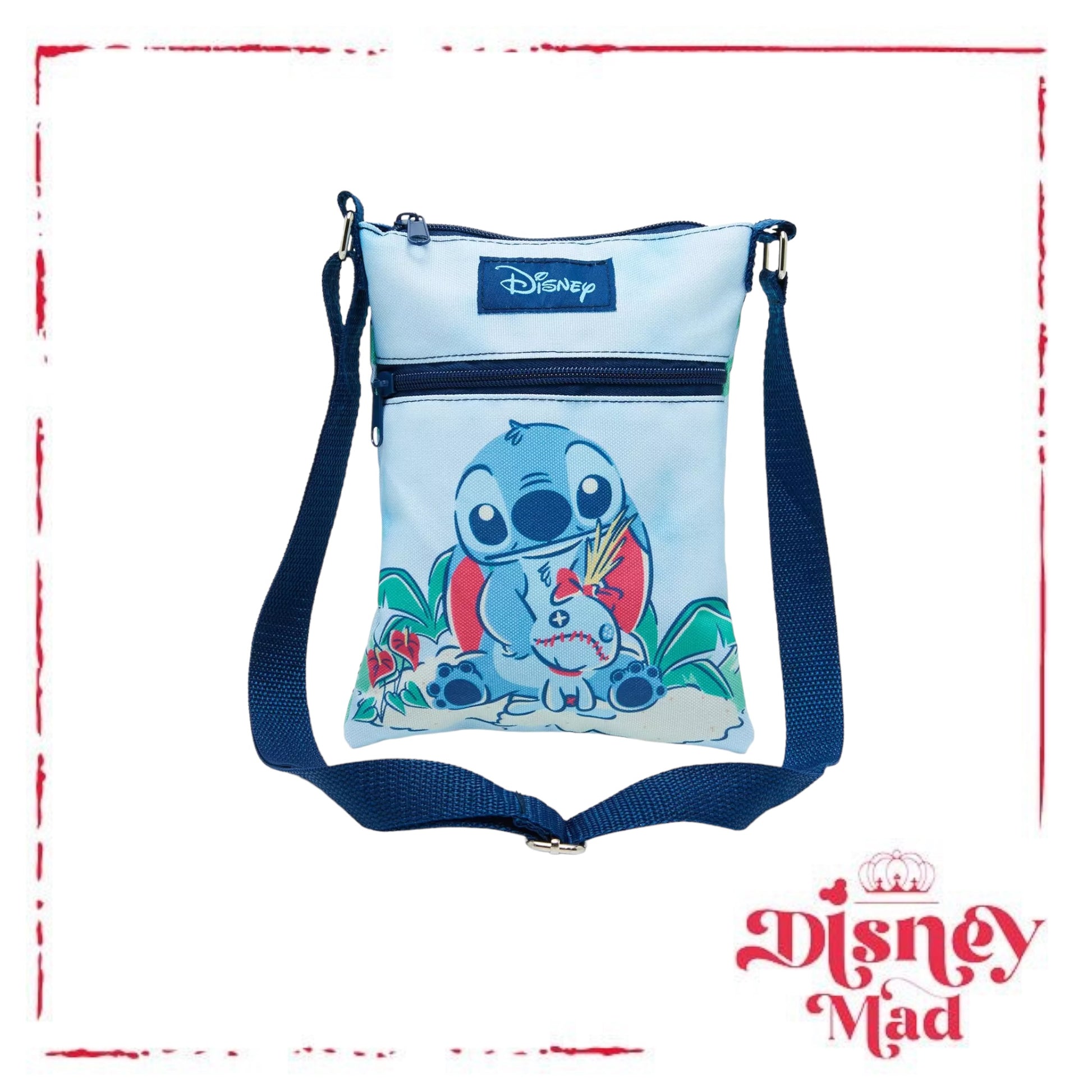 Head out to the beach with this passport crossbody bag featuring an image of Stitch and Scrump with palm trees in the background. Comes with a front zipper pocket, adjustable crossbody strap and top zipper pocket.