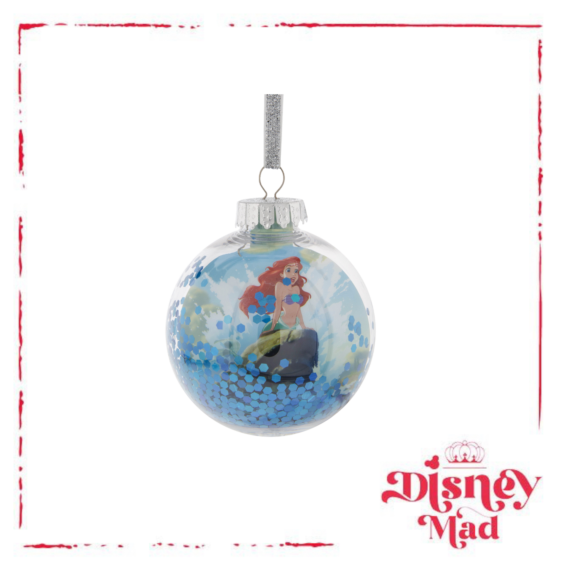 Bring the magic and glamour of the Disney princesses to the festivity with this wonderful 7.5cm aqua marine Little Mermaid sequin bauble. The round glass bauble features an iconic central Ariel print surrounded by beautiful shimmering blue sequins. The bauble includes a silver glitter hanging ribbon. Complete with a branded gift box, this makes a wonderful gift to any Disney lover. Collect the entire set of princesses and make one magical Christmas tree.