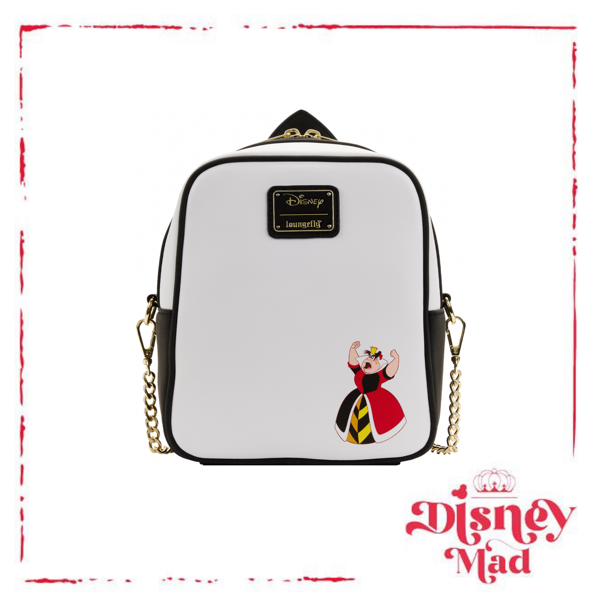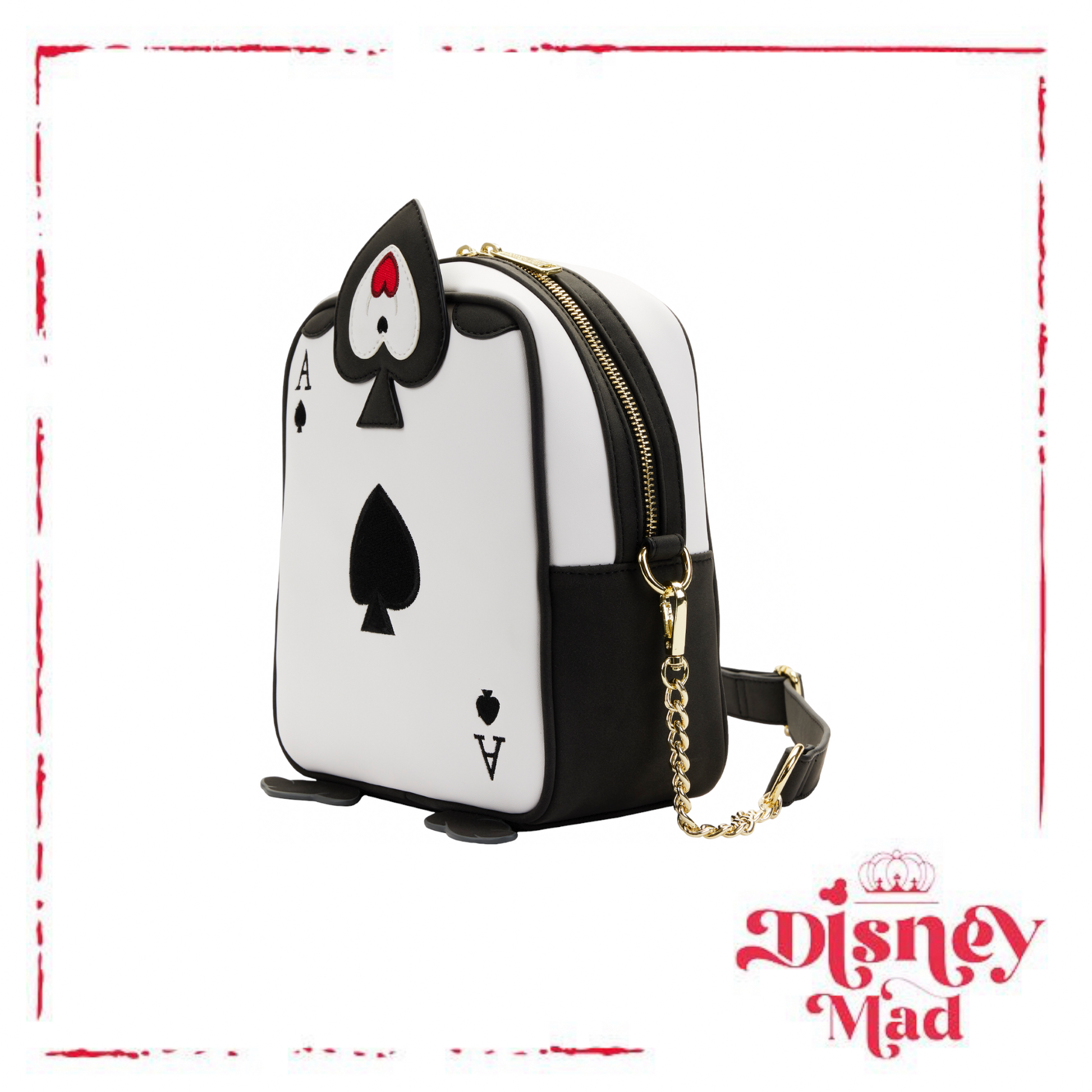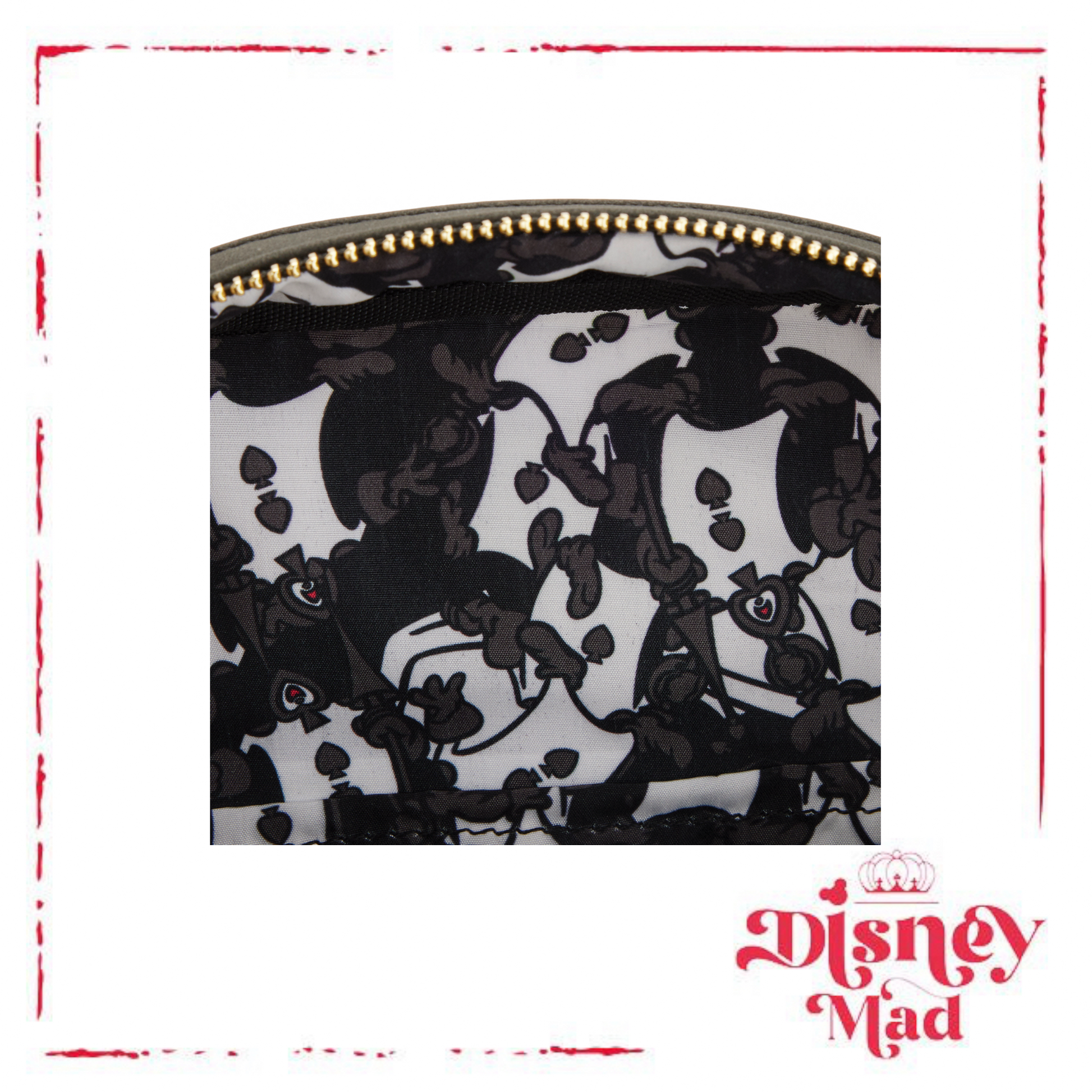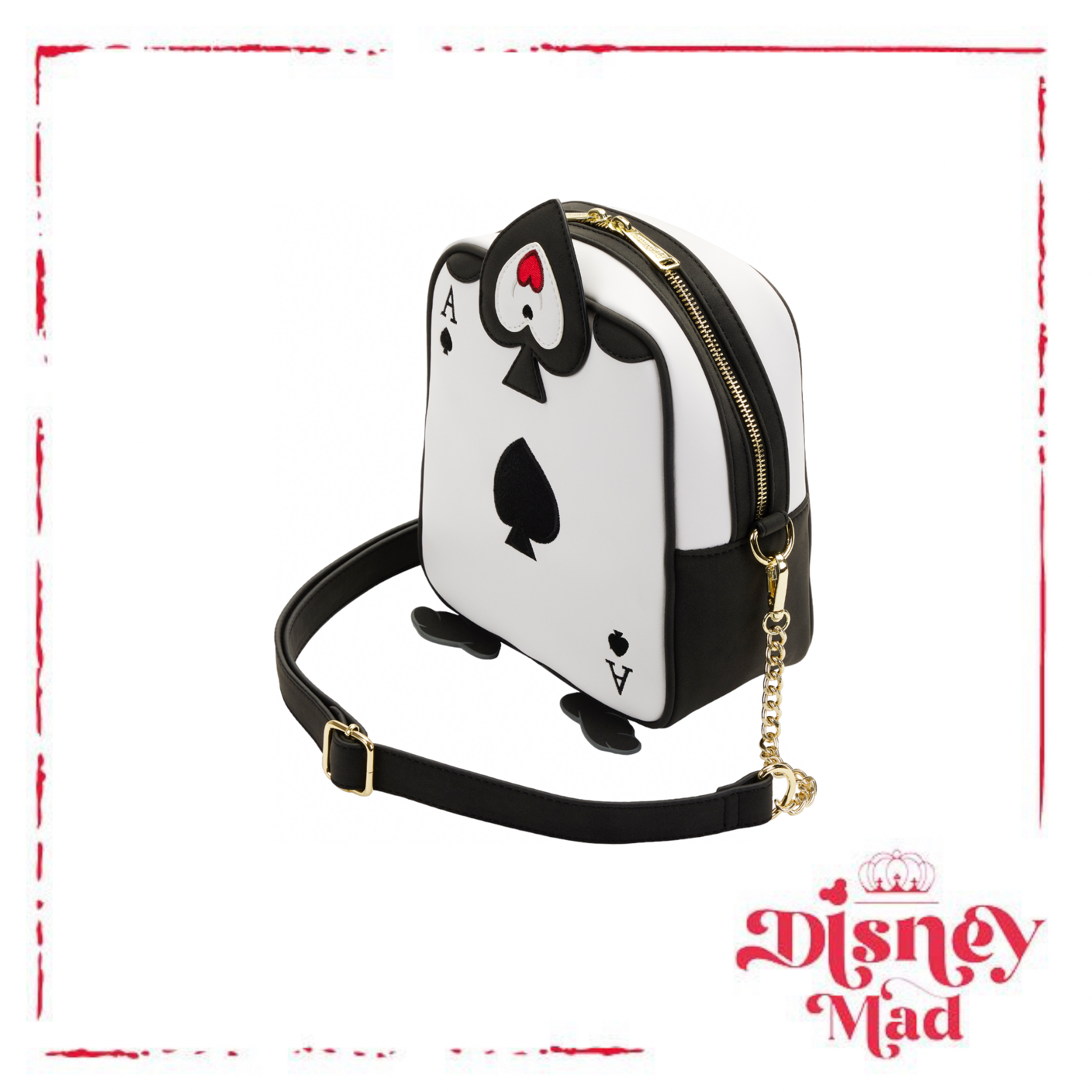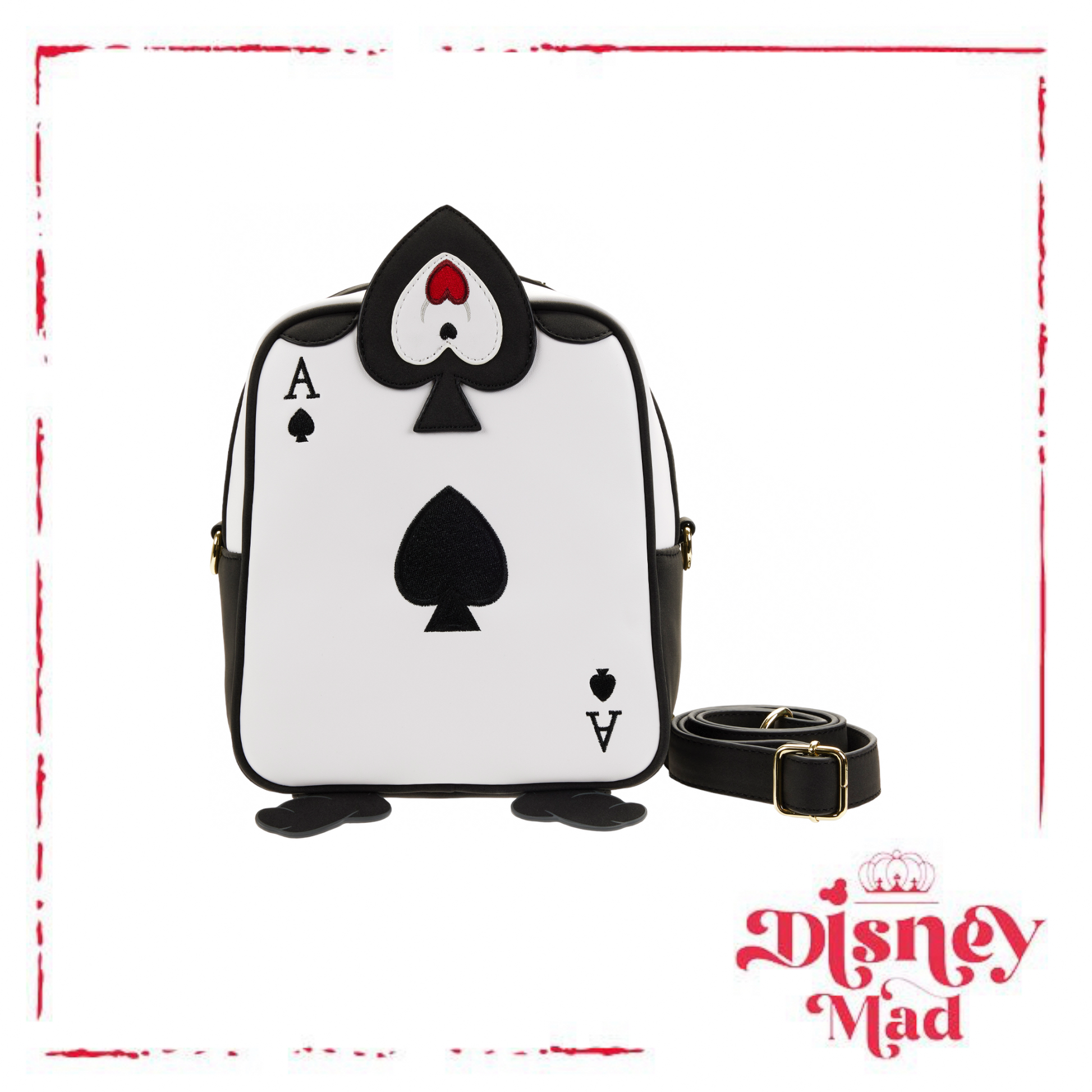 The Loungefly Disney Alice in Wonderland Ace of Spades Crossbody Bag is made of vegan leather (polyurethane). Bag has adjustable shoulder strap (detachable), sturdy metal hardware, appliques, debossed, and printed details. Take note of the coordinating pattern of the inside lining fabric.