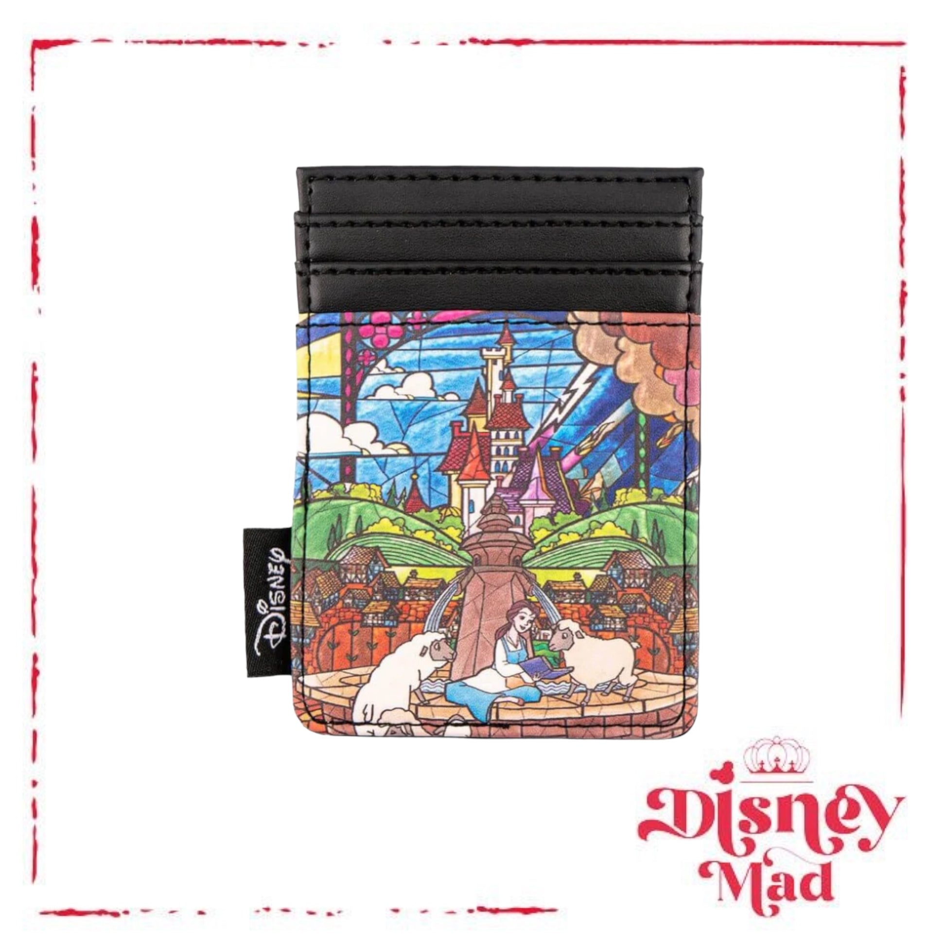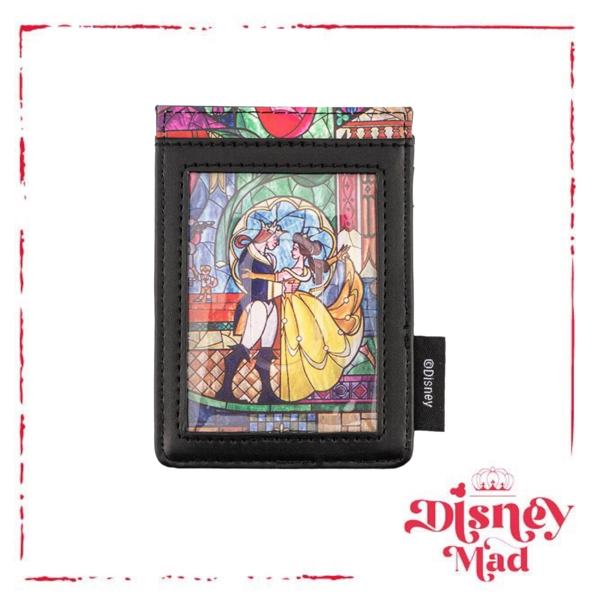 Officially licensed printed Disney card holder wallet by Loungefly, this card holder comes with a design of Princess Belle and the Beast in human form dancing in a stained glass look as seen in the classic Disney animated film. The reverse side features Belle reading her prized book with the Beast's Castle in the background