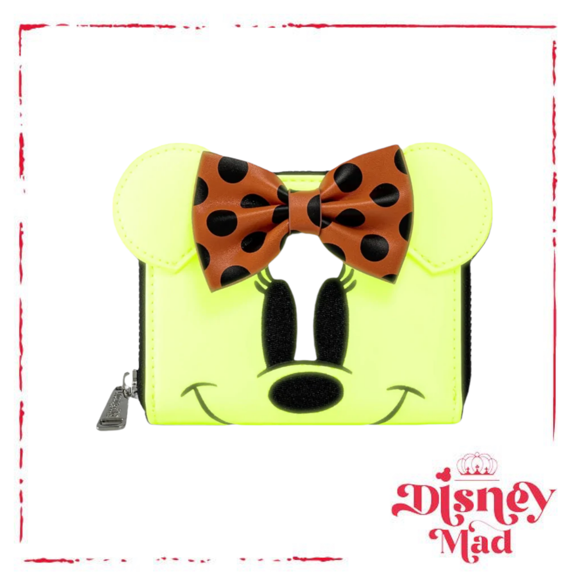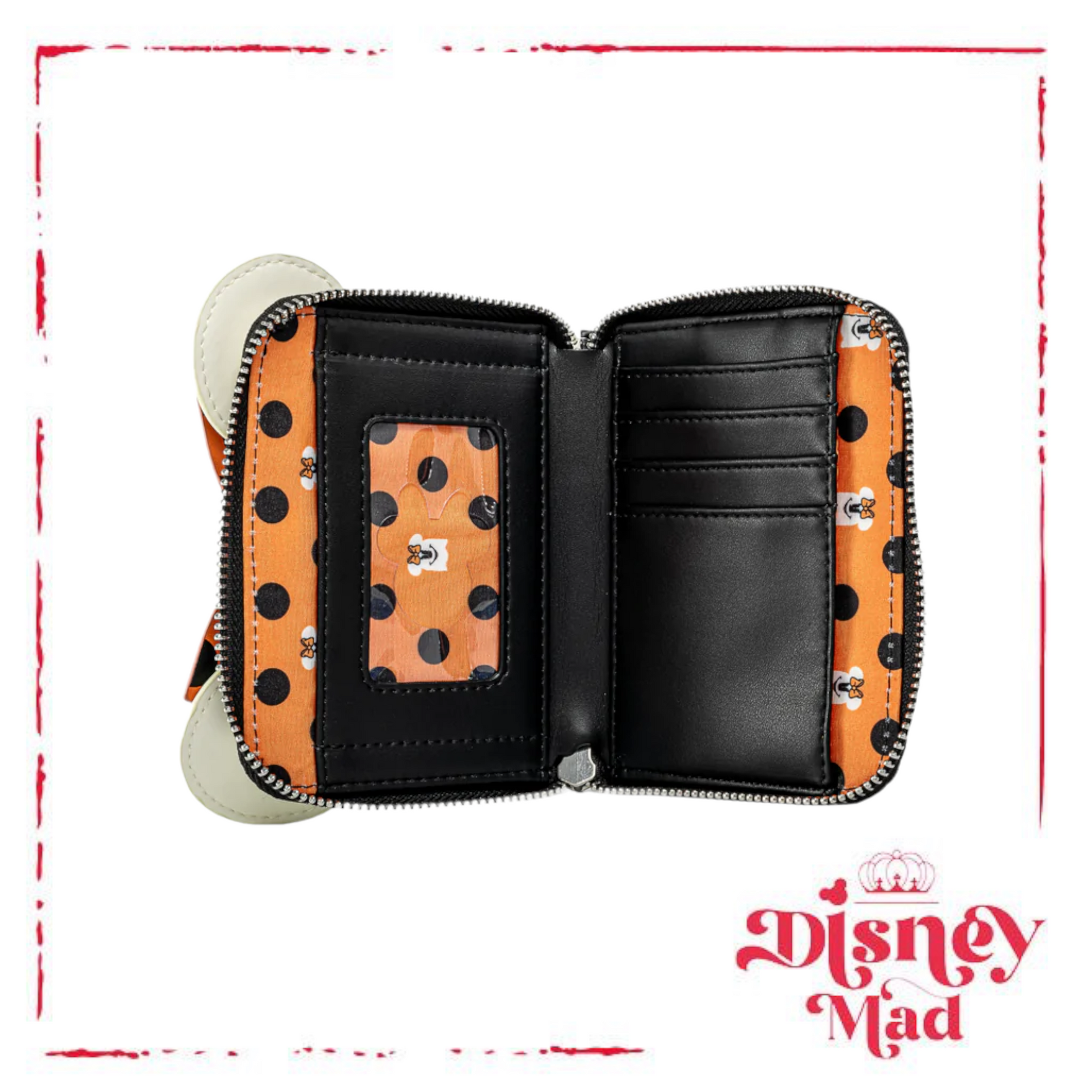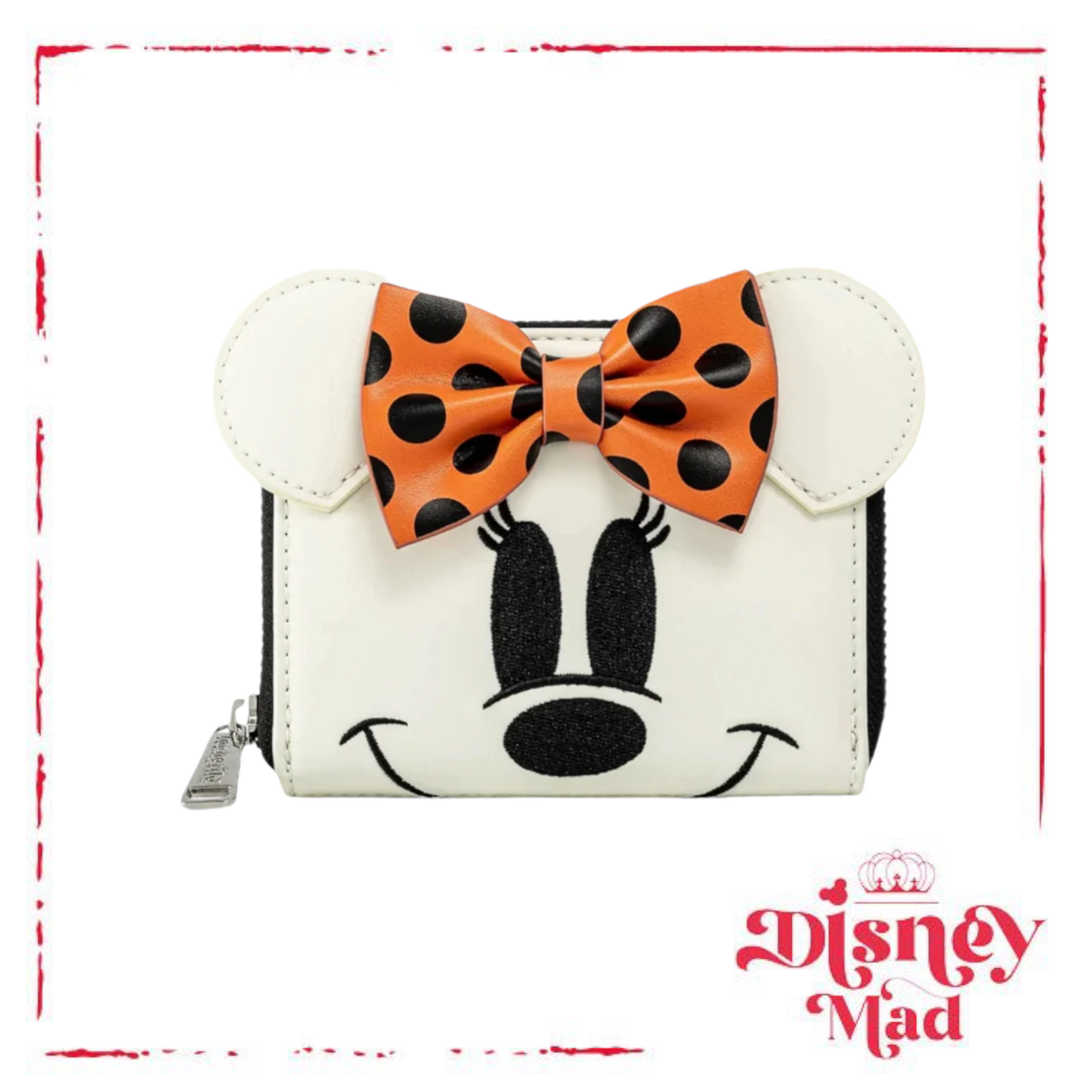 It’s a not so scary design, for an oh so sweet season! The Loungefly Disney Minnie Mouse Ghost Glow in the Dark Cosplay Zip Around Wallet. Oh yeah, you read that correctly. This spectacularly spooky wallet glows in the dark and is the prefect accessory to any Disney Halloween outfit. Minnie Mouse is masquerading as a ghost and is wearing a black and orange polka-dot bow.