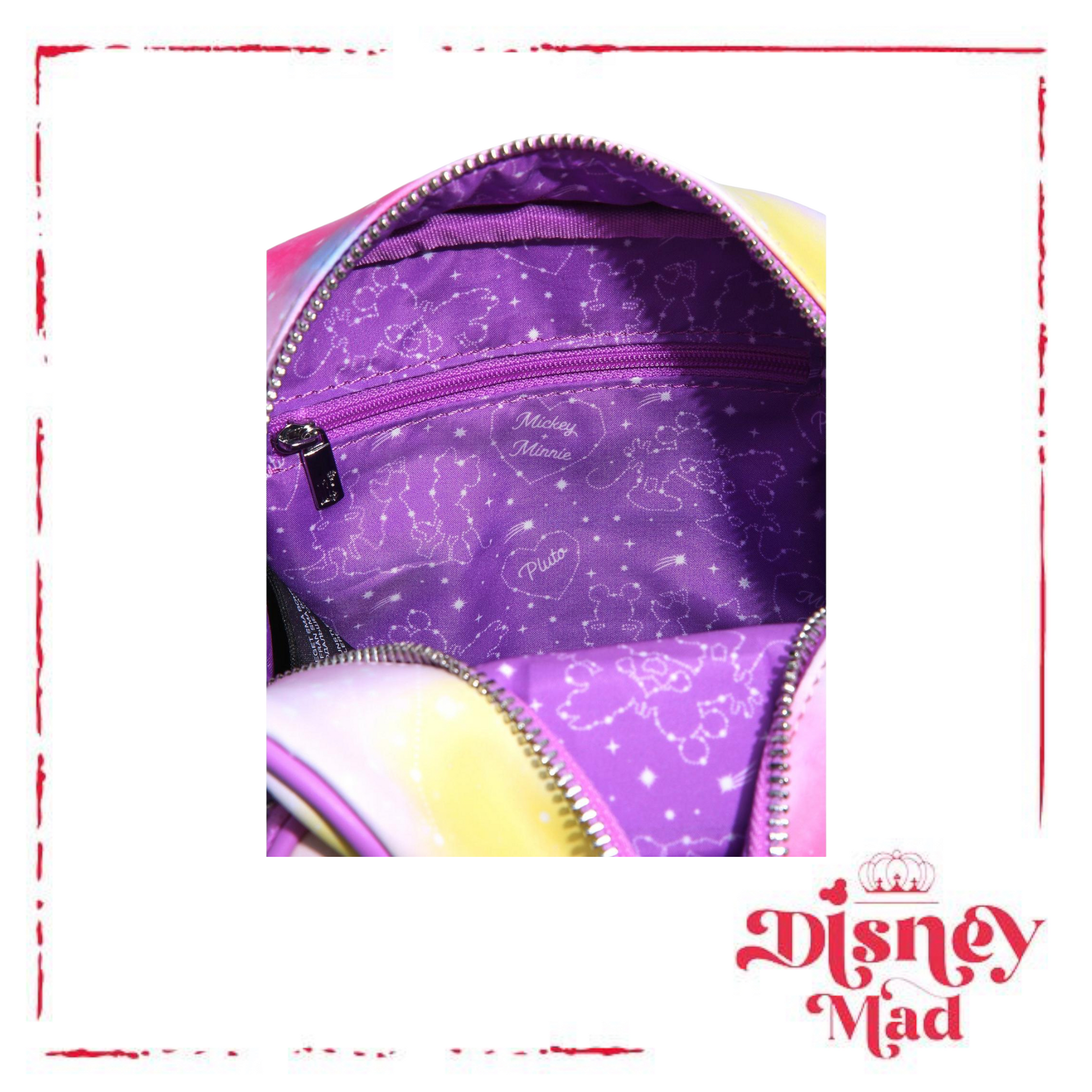 Take your style levels sky high with a little help from Minnie, Mickey, and Pluto! Featured gazing at the embroidered constellations on the front of this Loungefly crossbody bag, the Disney trio stand in front of a colorful and starry sky for one style worth wishing for. Also features silver-toned hardware, an enamel brand badge, an adjustable shoulder strap, and a constellation-inspired interior lining pattern. Look closely and you might see a few Mouse Eared designs and Pluto's bone in the stars!
