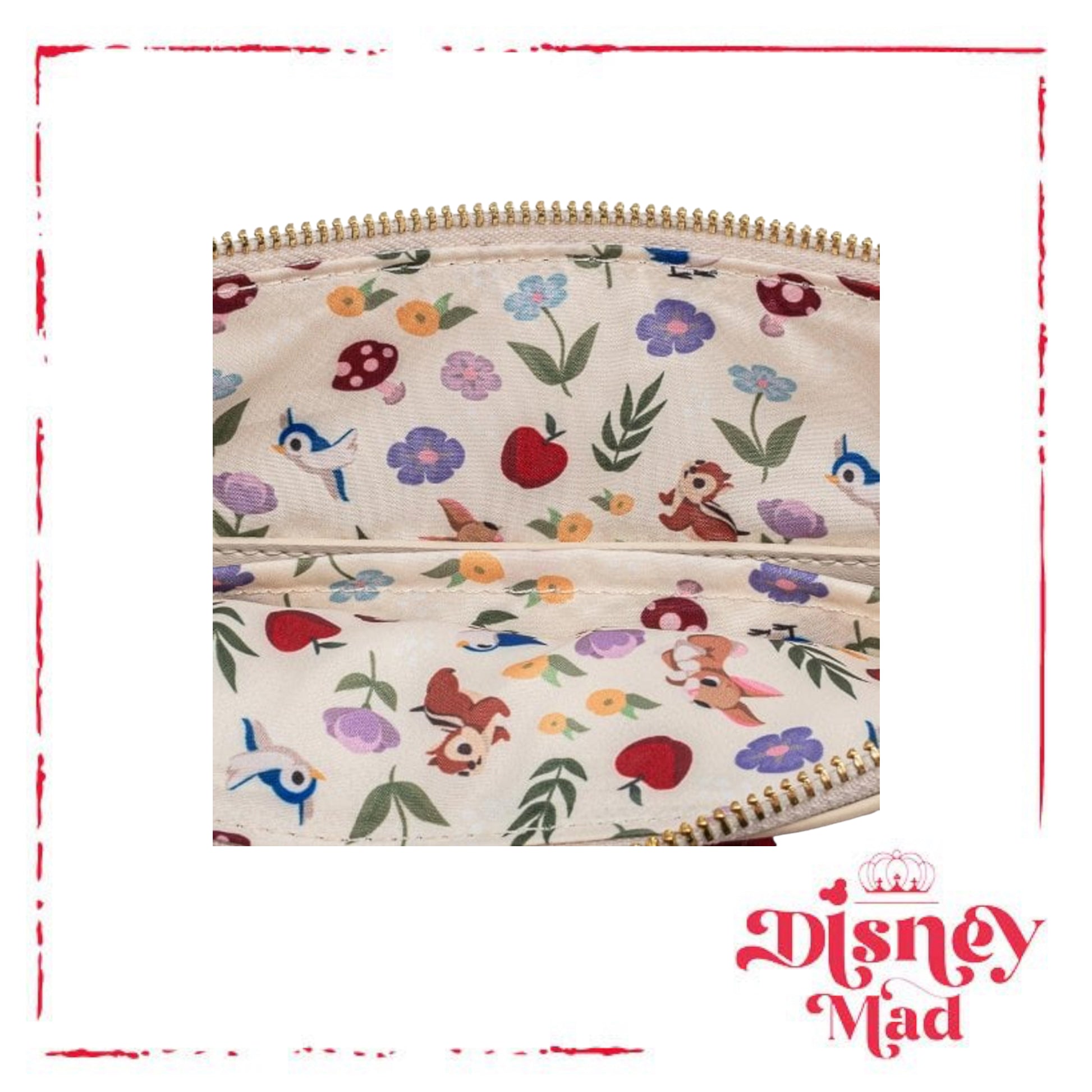 Snow White has escaped the Evil Queen’s malicious reign and found her happily ever after. Bring the serene castle scene into your wardrobe with the Disney Snow White Castle Crossbody. This bag’s print depicts Snow White sitting with her forest friends in the meadow at the bottom of her castle. The back of the purse shows a golden sunset illuminating the castle in the distance. It makes a great complement to a princess-themed outfit or a fun purse for everyday use.