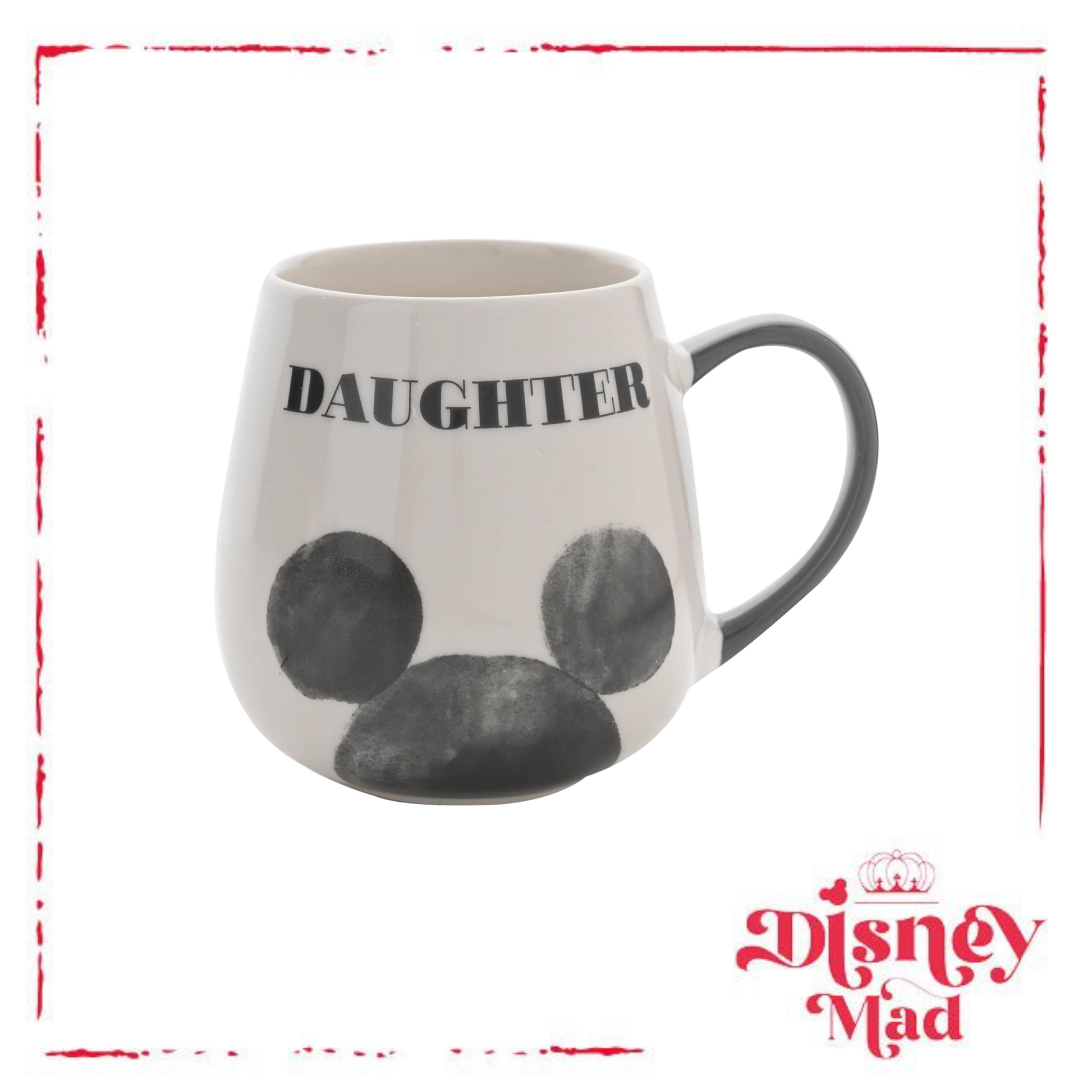A Mickey ‘Daughter’ mug by DISNEY®. This personalised mug is made especially for daughters of all ages who love the magical world of Disney. The large ceramic mug features a black handle and prominent image of Mickey Mouse’s head in the same colour, above which sits its ‘Daughter’ decal in complementary font. The image and decal are duplicated on the reverse side. The mug is packaged in a lidded gift box.
