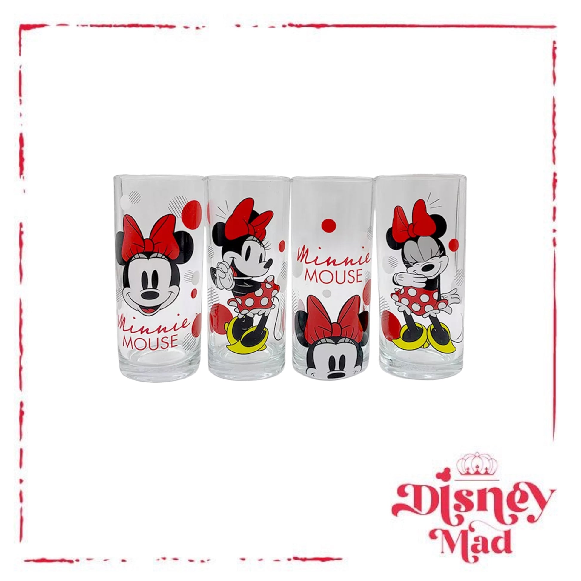 Aw gosh! This dapper Minnie Mouse glass set features the stylish mouse in varying poses, surrounded by lettering of her name, signature bows, and matching red polka dots! Whether you're drinking water, juice, or morning coffee, this set will start your day with Disney flair!