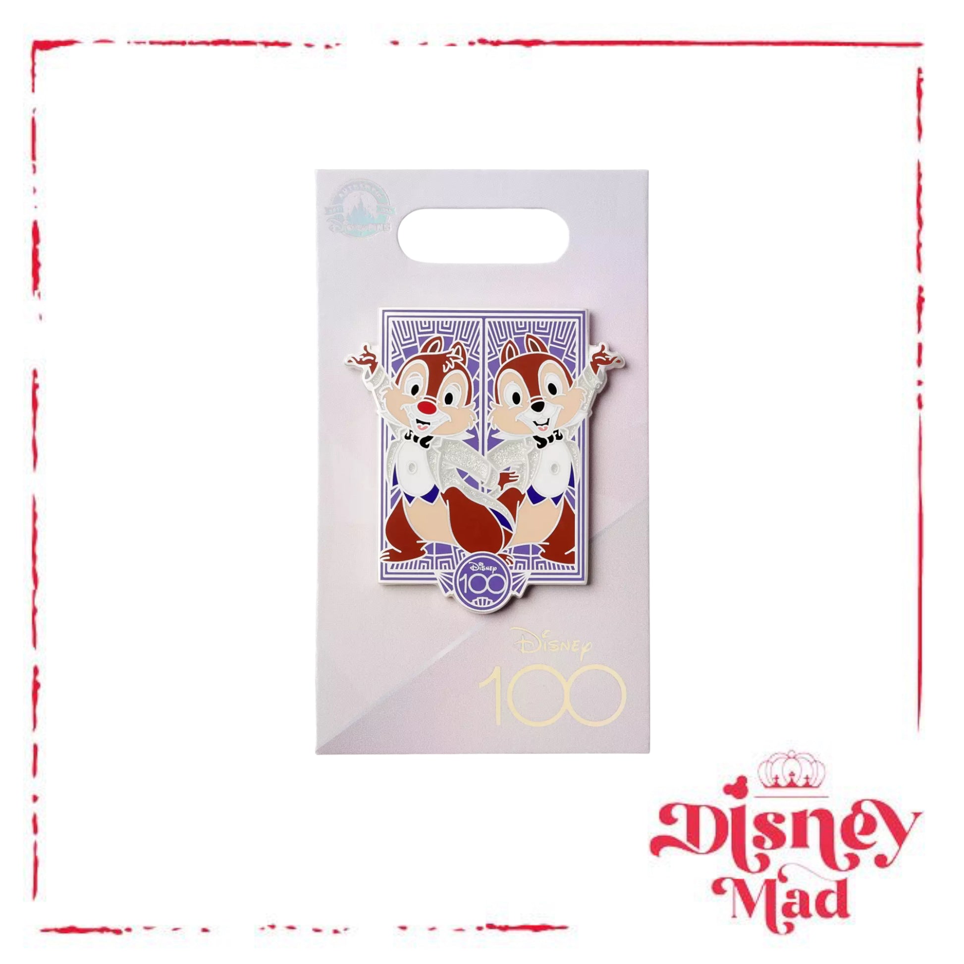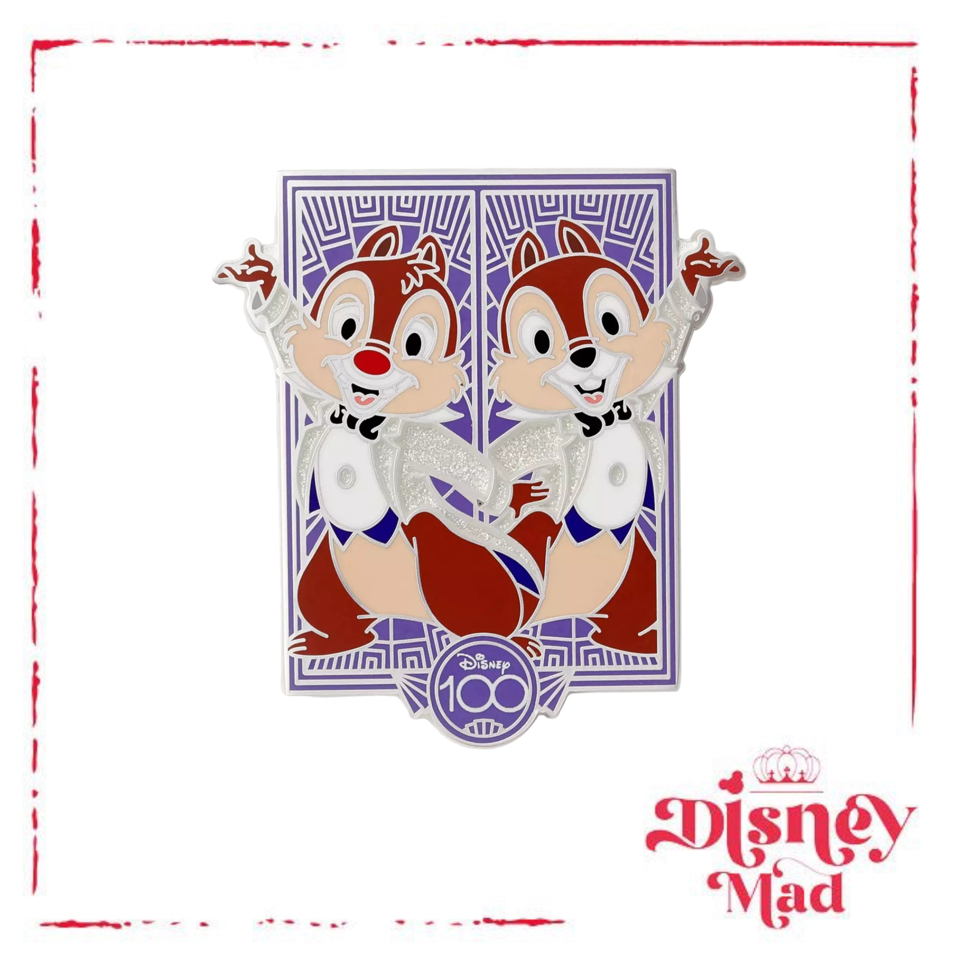 Those adorable rascals Chip 'n Dale are ready to party all year long on this art deco-styled cloisonné pin celebrating Disney's 100th anniversary.