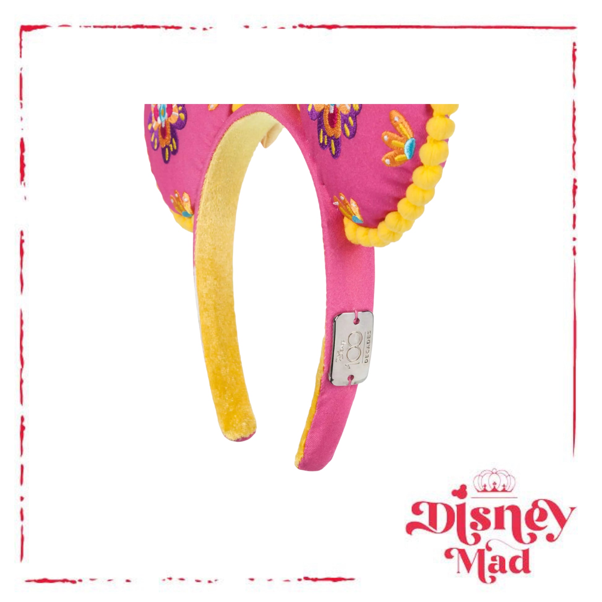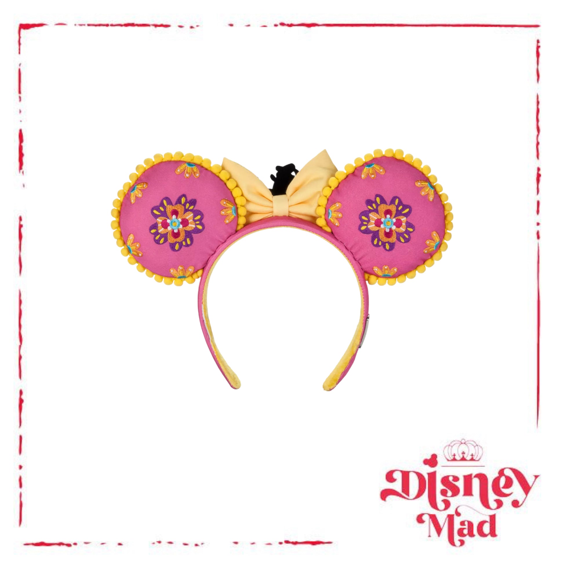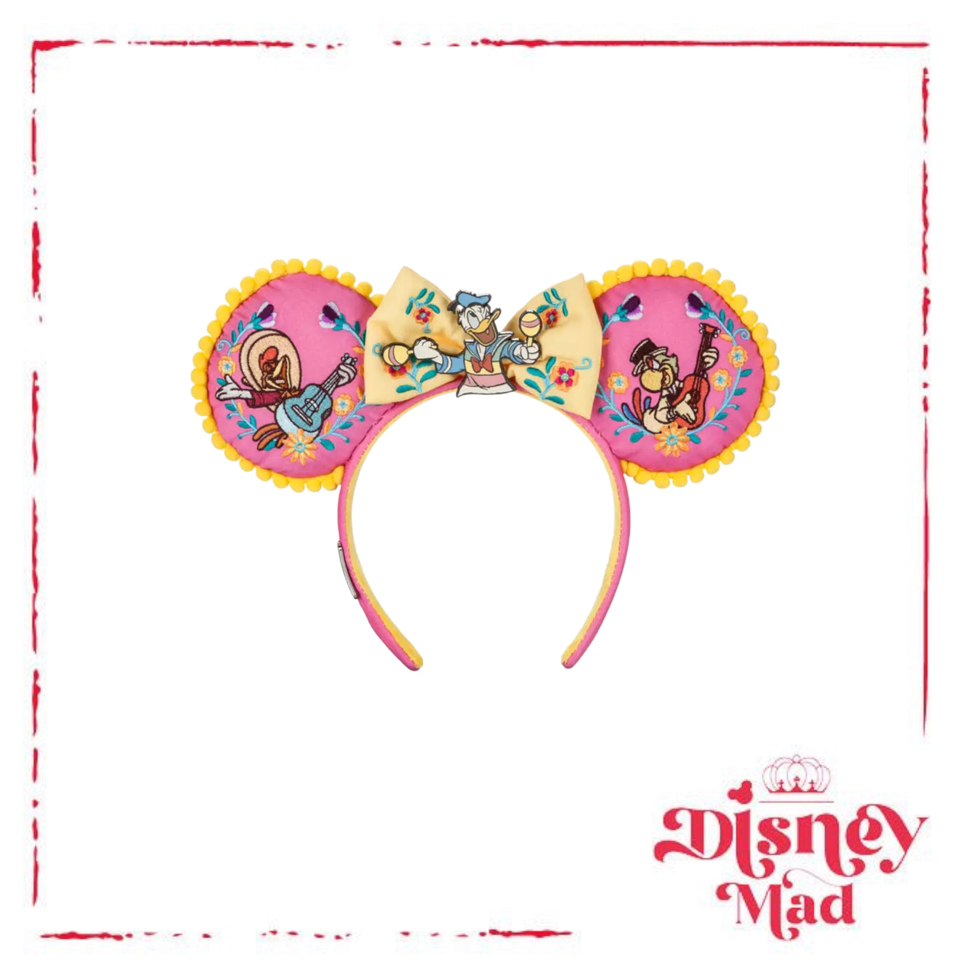 Who needs a sombrero or snappy serape when you can stand under this festive headband with embroidered mouse ears showcasing José Carioca and Panchito amidst floral decoration? Let's not forget Donald Duck, who accents the bow with a glttering centerpiece in celebration of Walt Disney's animated classic The Three Caballeros.