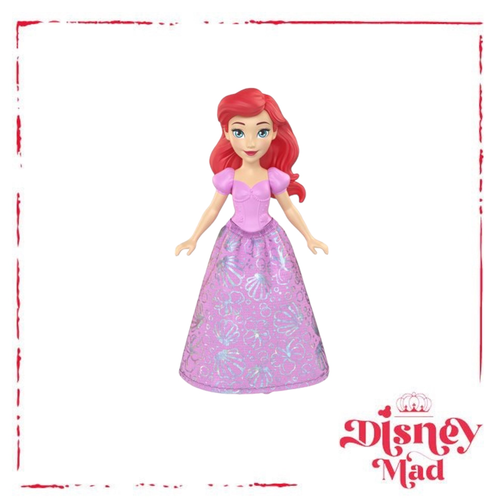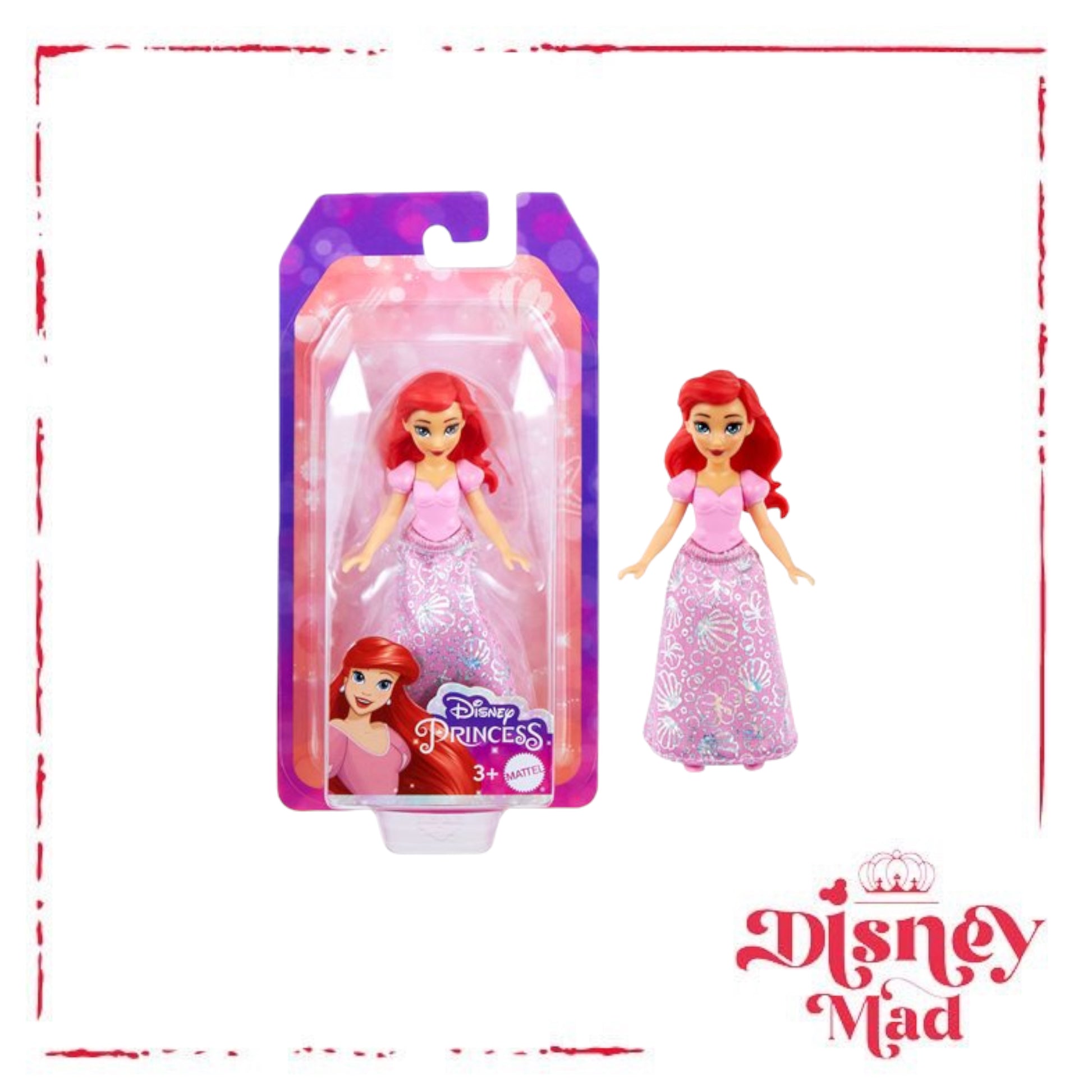 Meet this Ariel doll, inspired by the determined and free-spirited princess from Disney's The Little Mermaid, in a charming scale with movable joints! This posable small doll sparkles in her signature look, featuring a removable soft skirt with metallic details. Doll is approximately 3 1/2-inches tall. Ages 3 and up.