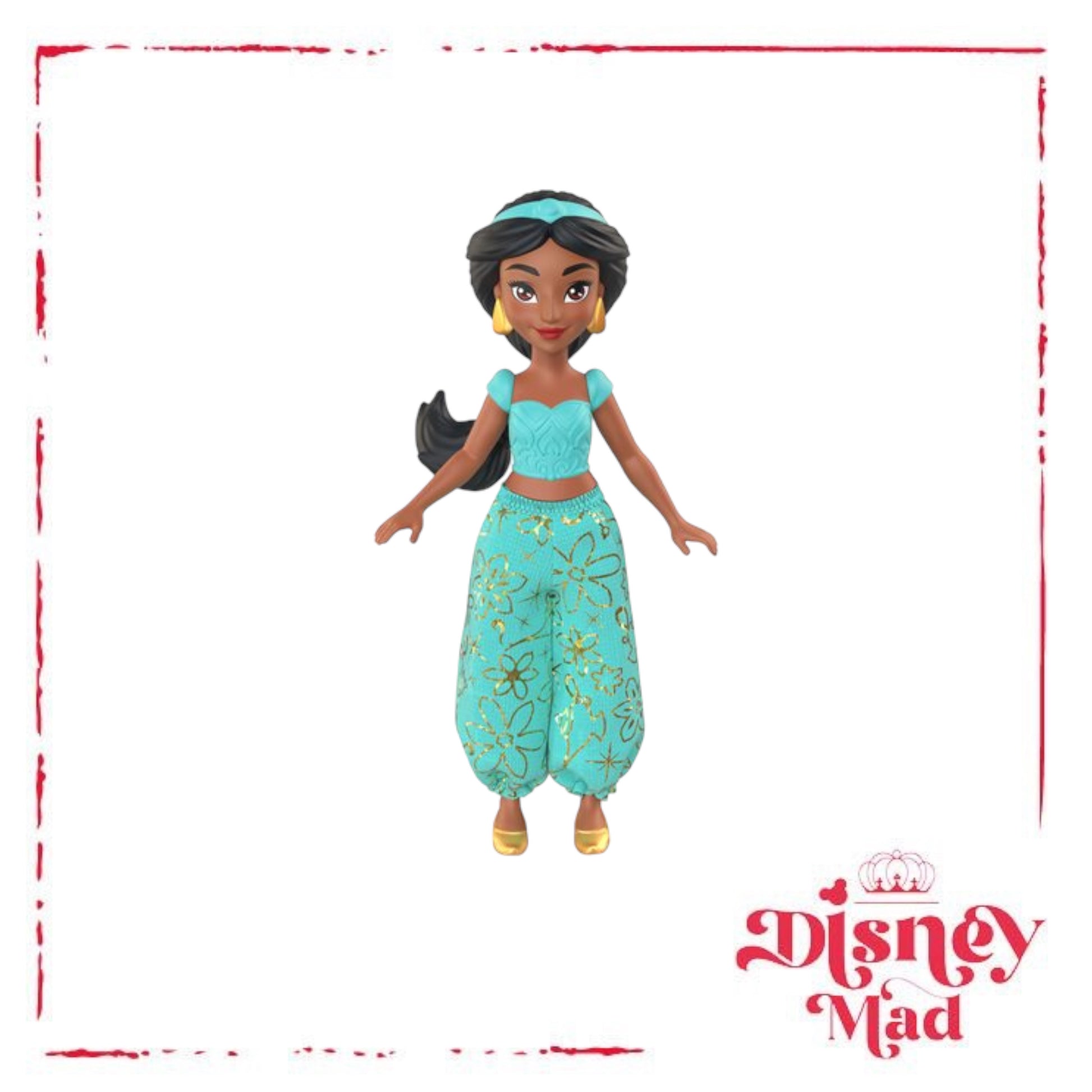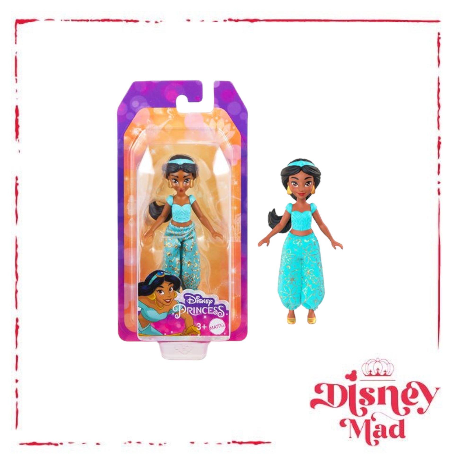 Meet this Princess Jasmine doll, inspired by the generous and daring heroine from Disney's Aladdin, in a charming scale with movable joints! This posable small doll sparkles in her signature fashion, featuring removable soft pants with metallic details. Doll is approximately 3 1/2-inches tall. Ages 3 and up.
