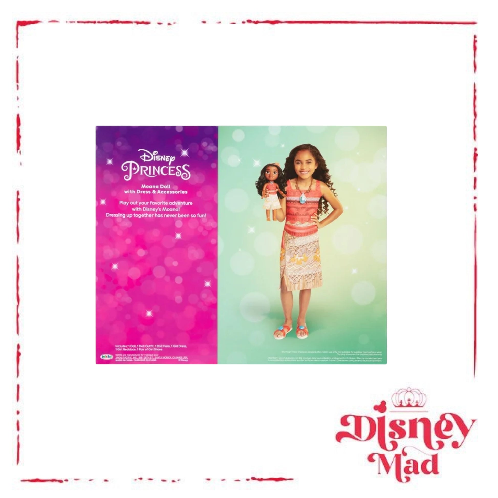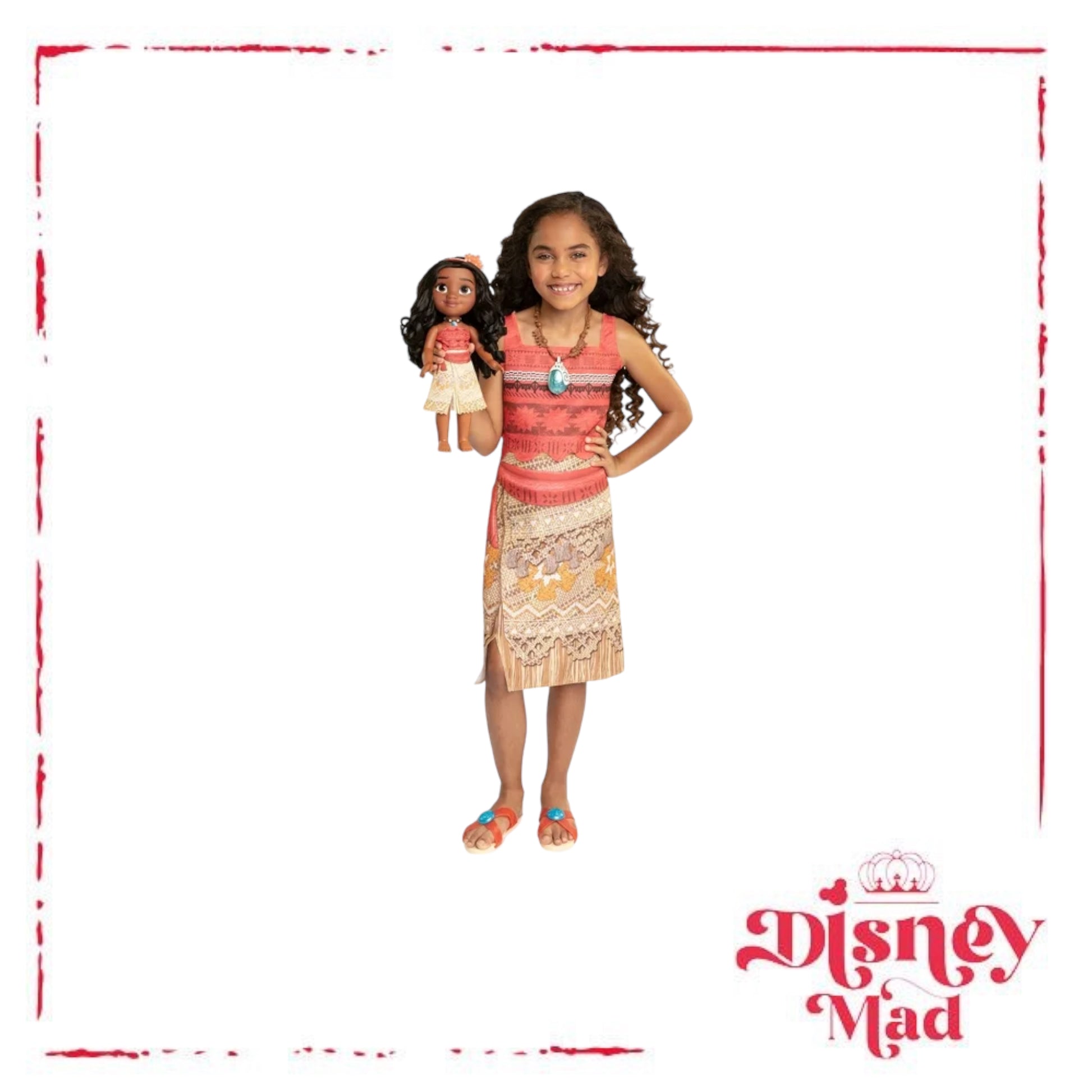 - Includes: 1 Moana Doll, 1 Moana Doll Dress, 1 Pair of Moana Doll Shoes, 1 Moana Child Dress, 1 Pair of Moana Child Shoes, 1 Moana Child Blue Shell Heart of Te Fiti necklace.