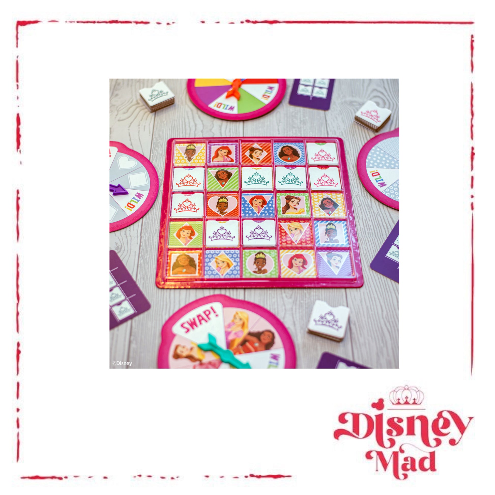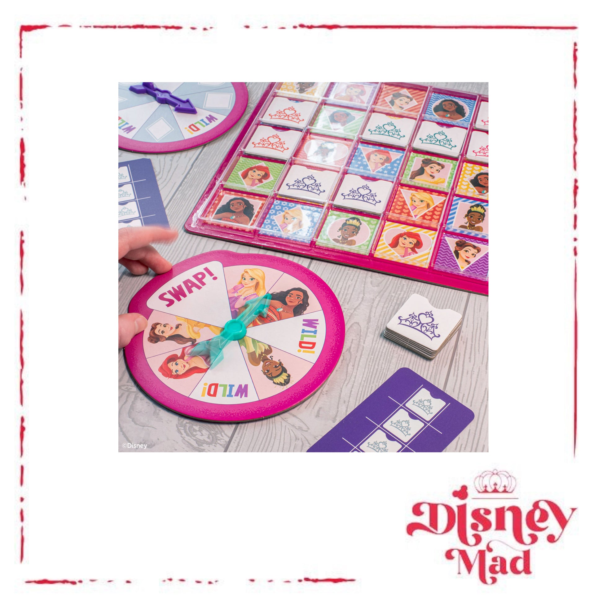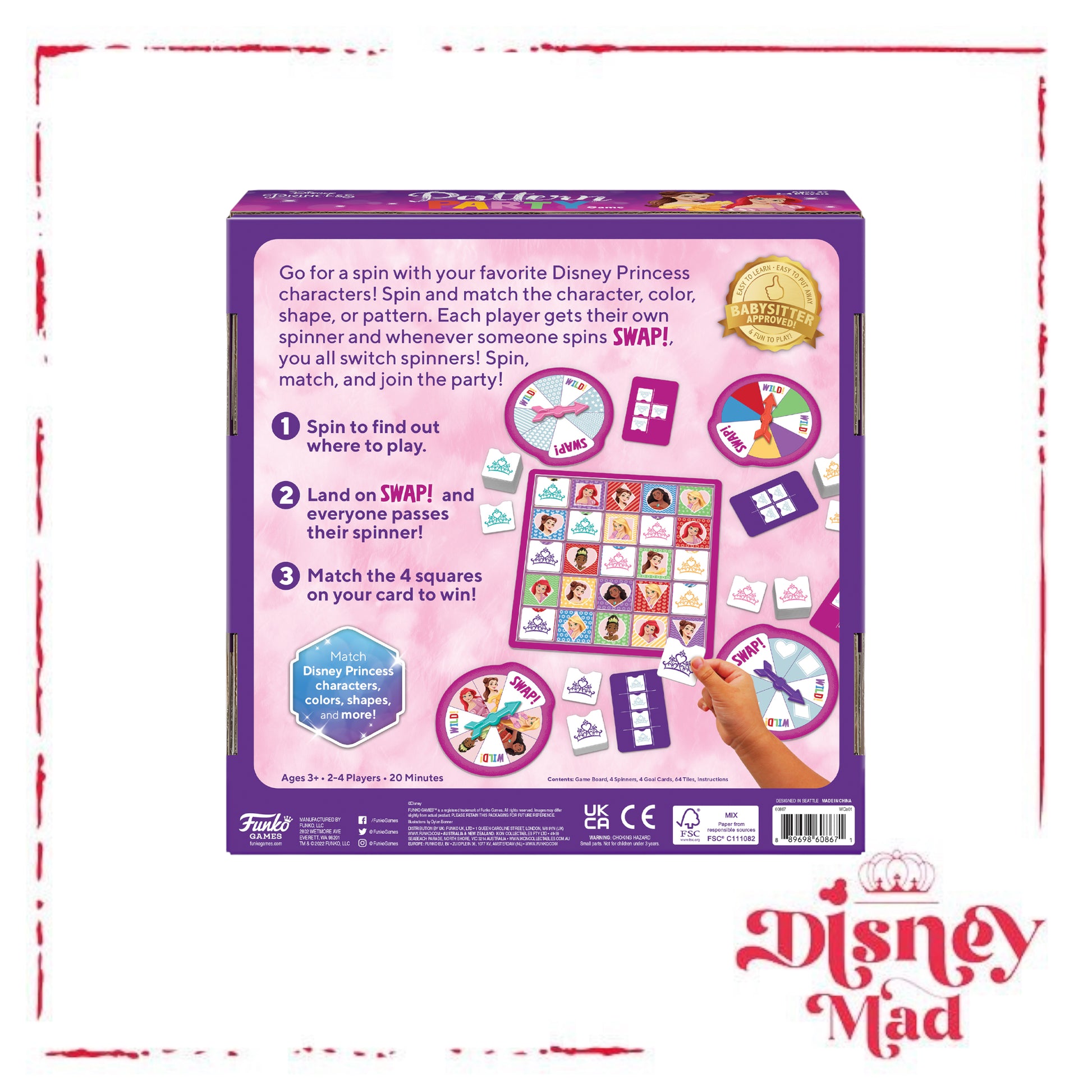 Go for a spin with five of your favorite Disney Princess characters! Spin and match the character, color, shape, or pattern. Each player gets their own spinner and whenever someone spins SWAP! you all switch spinners. Match the four squares on your goal card to win. Spin, match, and join the party!