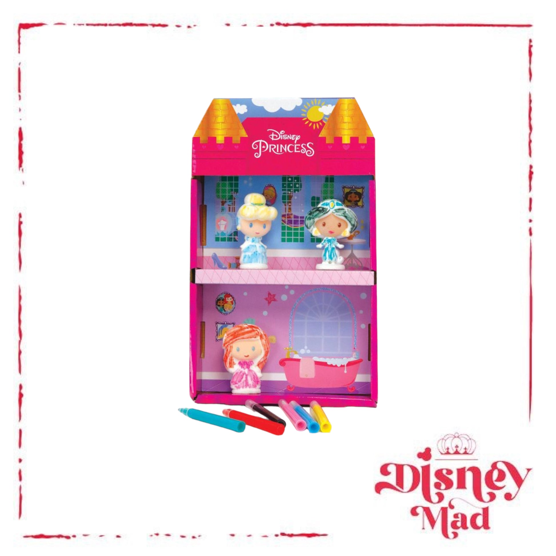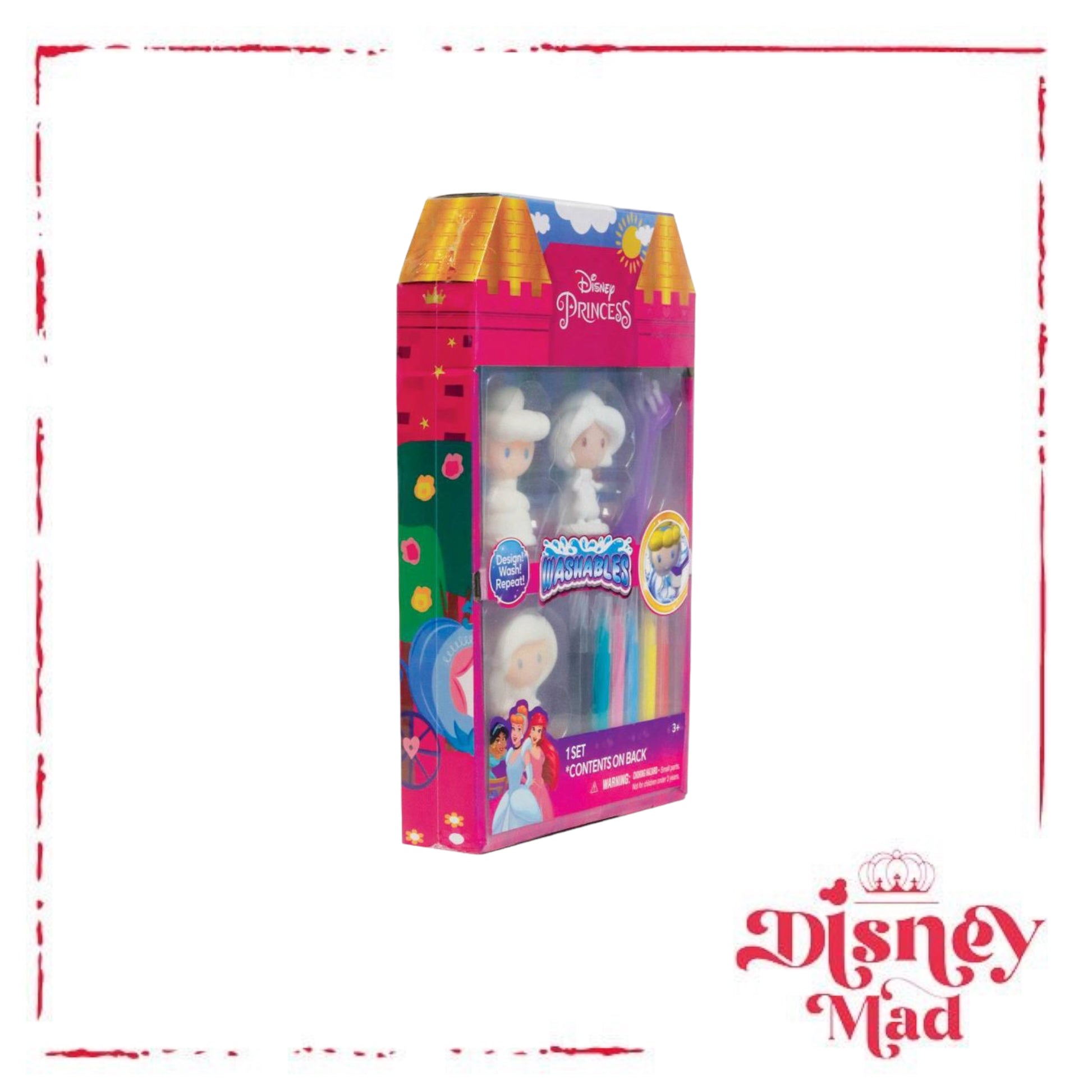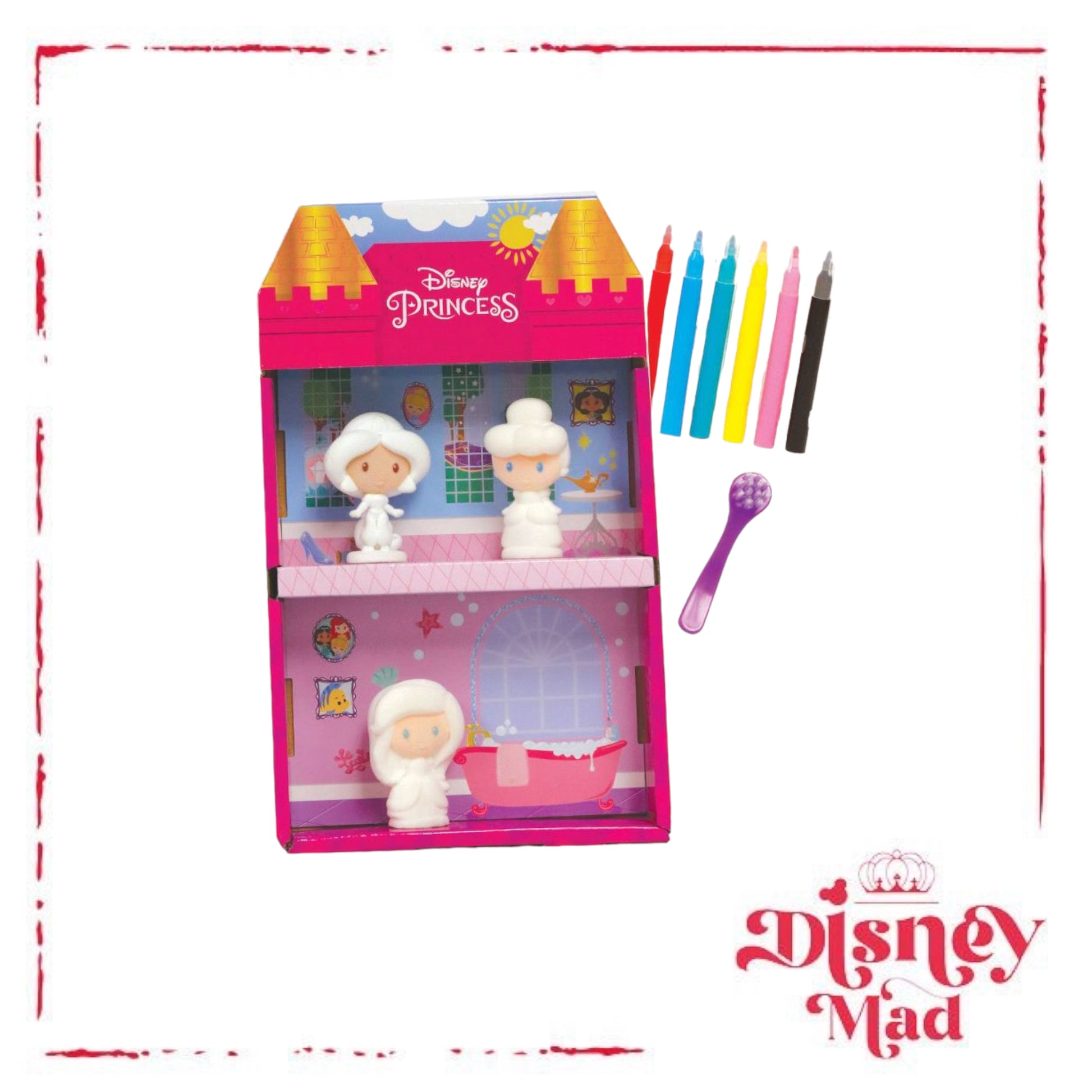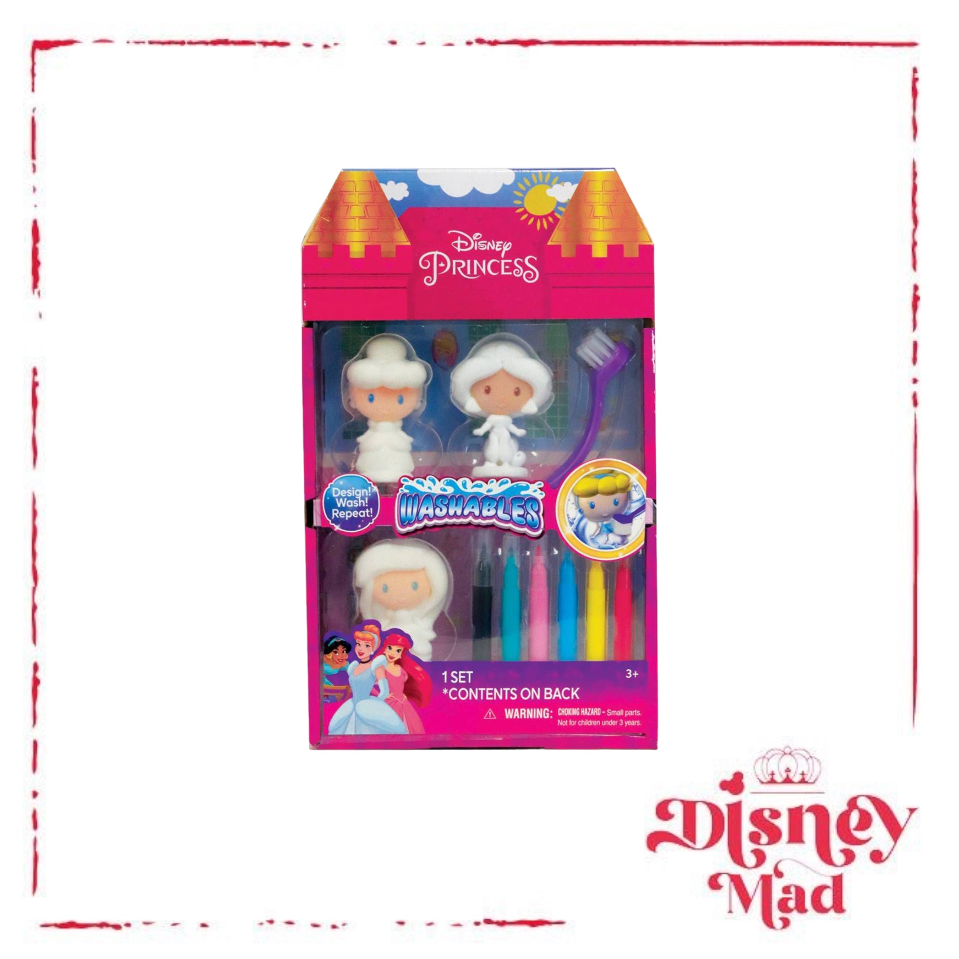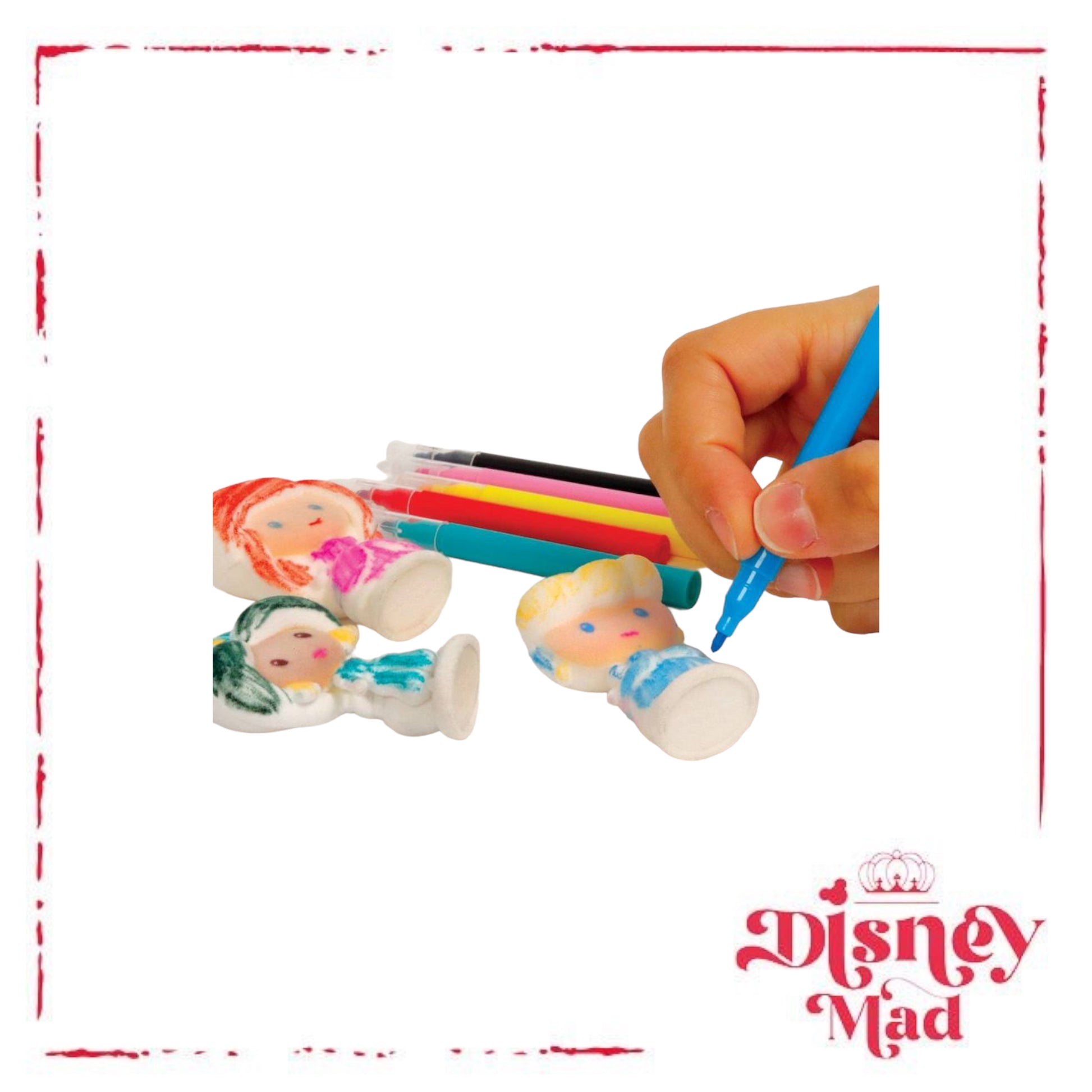 Color and customize these collectible Princess characters that can be decorated over and over again. Pick from the markers included to add unique designs to each fuzzy figure. When you're ready, run some water over them and use the brush included to clean them up and then color again. Includes 3 flocked characters, 1 washing brush, 6 washable makers.