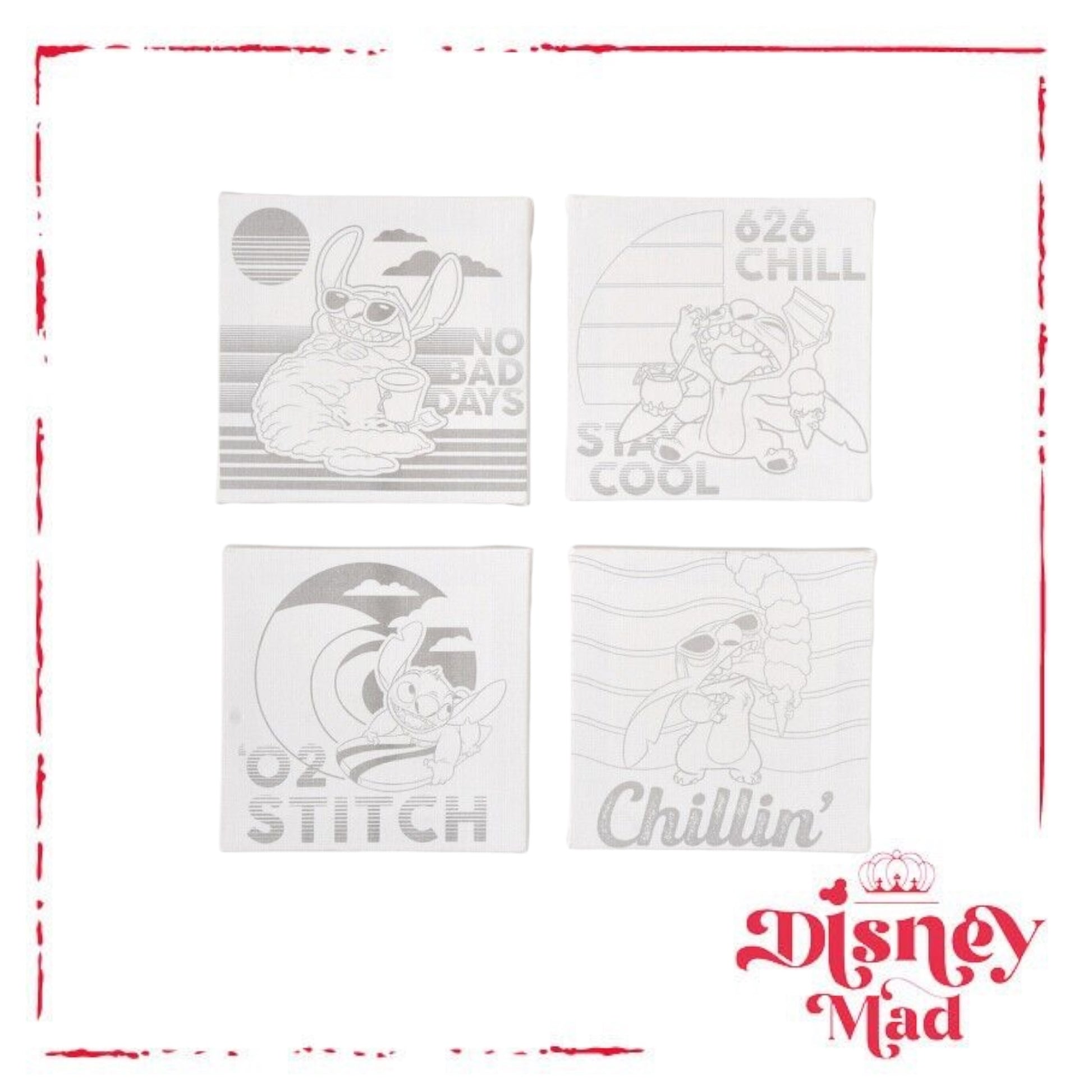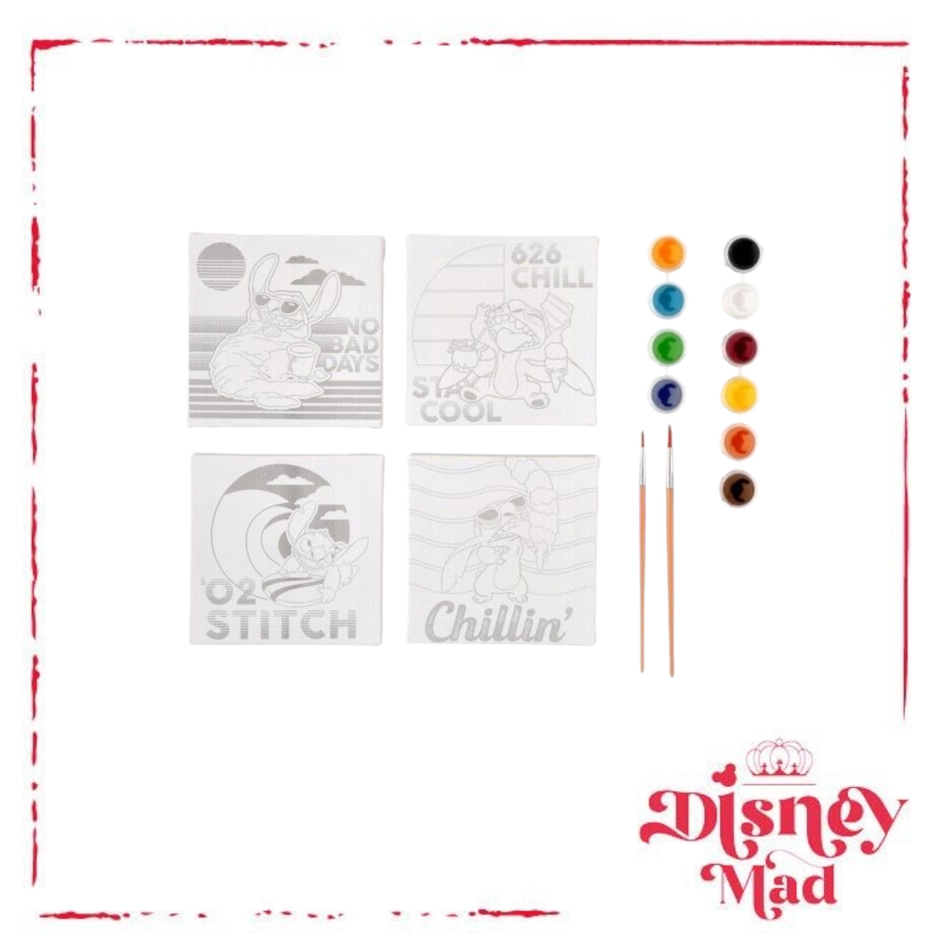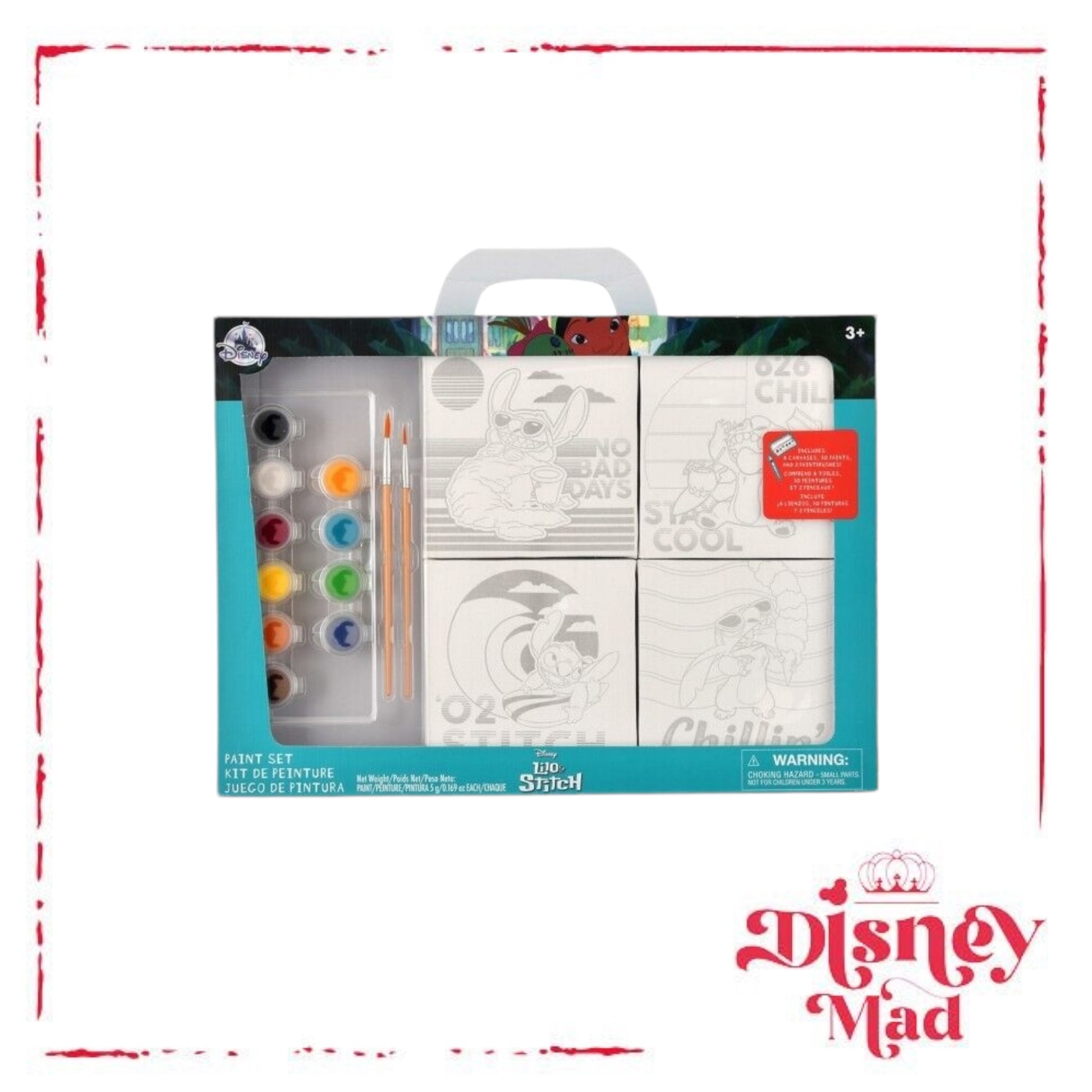 Eating a big ice cream and riding a surfboard. A set of 4 canvases with a cute sketch of Stitch enjoying the Hawaiian sea, 10 colors of paint, and 2 paintbrushes. The nice point is that the lid of the paint case is also a stitch design.