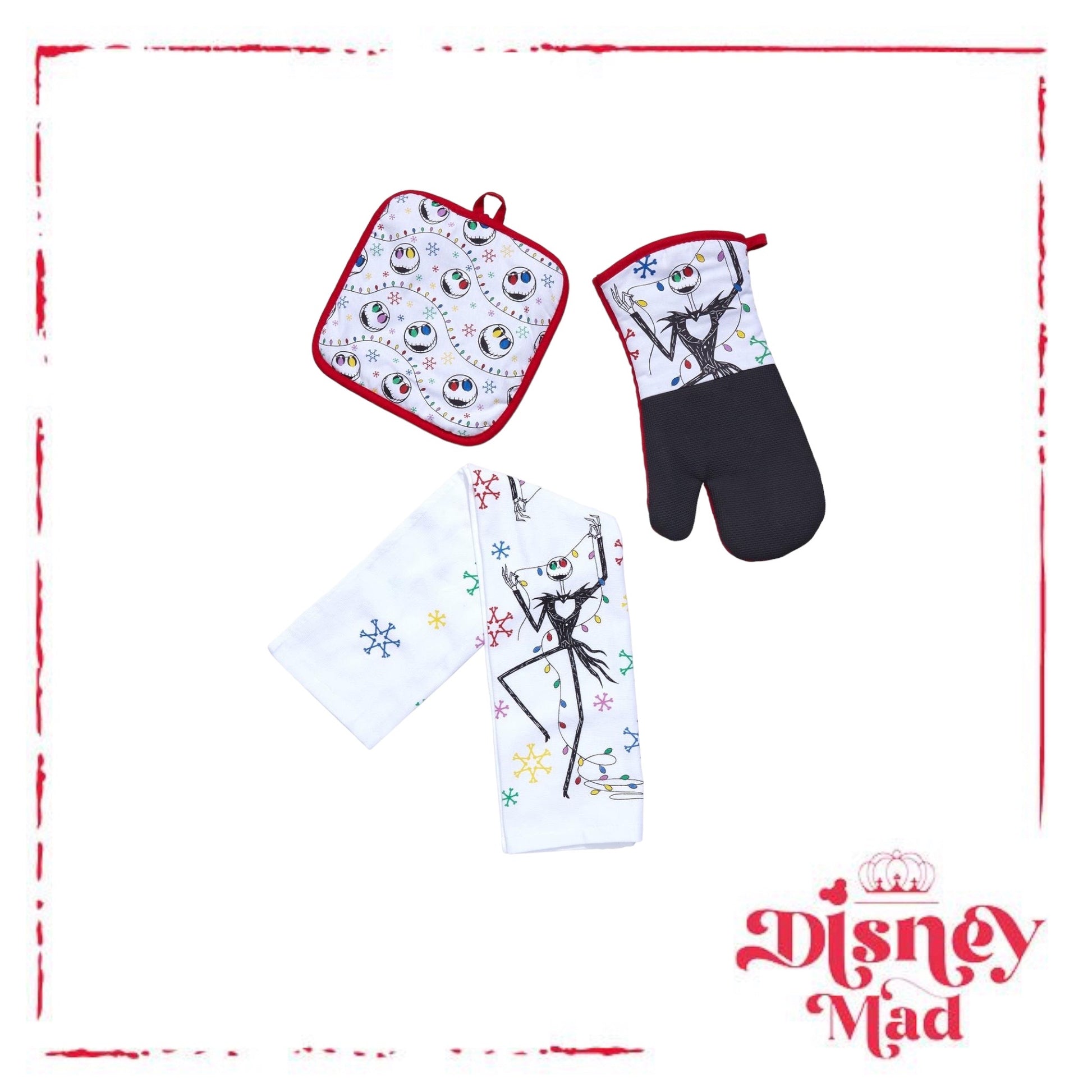 Add a festive touch of spooky to your kitchenware with this Nightmare Before Christmas kitchen set! Jack Skellington is seen with colorful lights and snowflakes on the included oven mitt, pot holder, and kitchen towel. The Pumpkin King is ready to channel his inner-Sandy Claws while he helps you on your next cooking adventure.