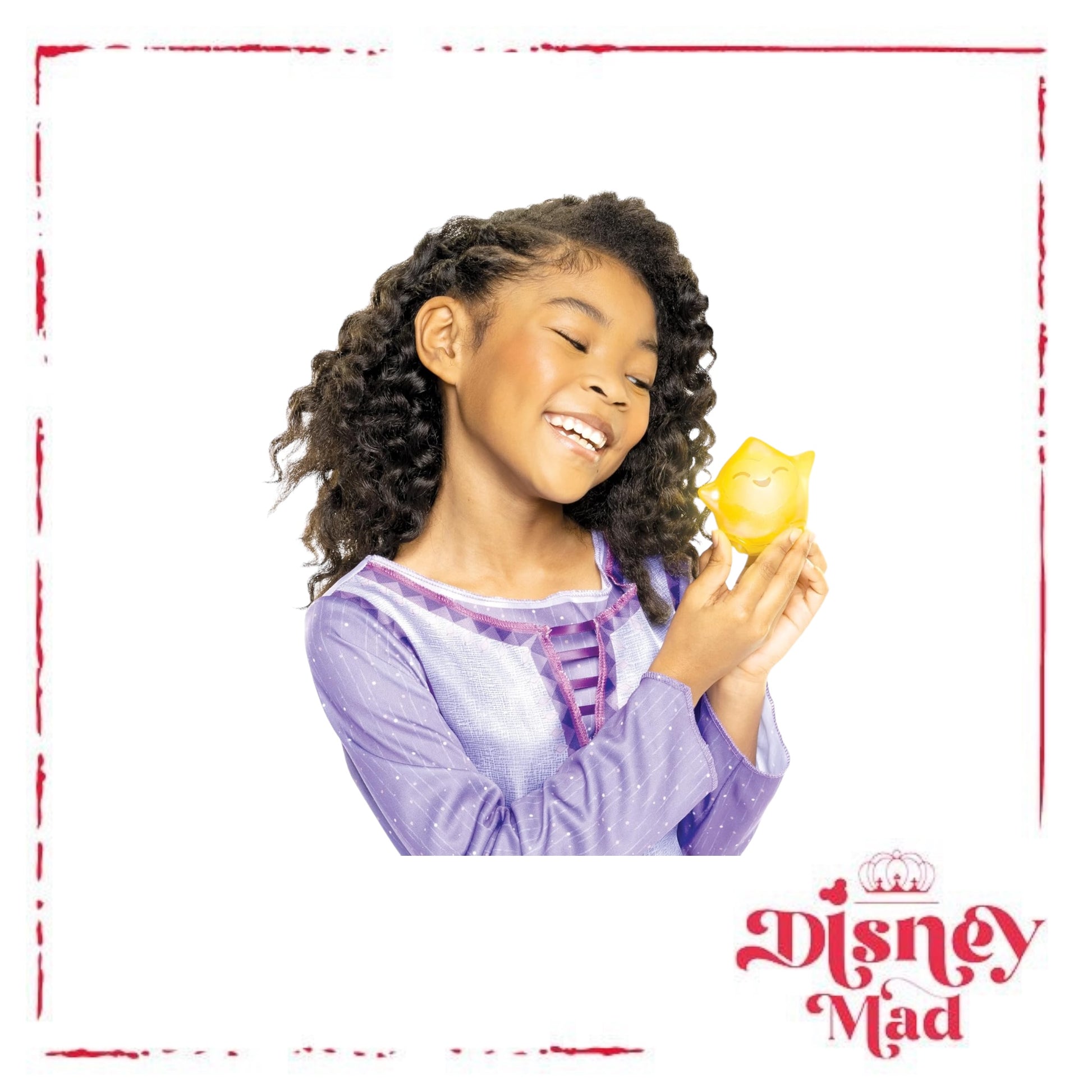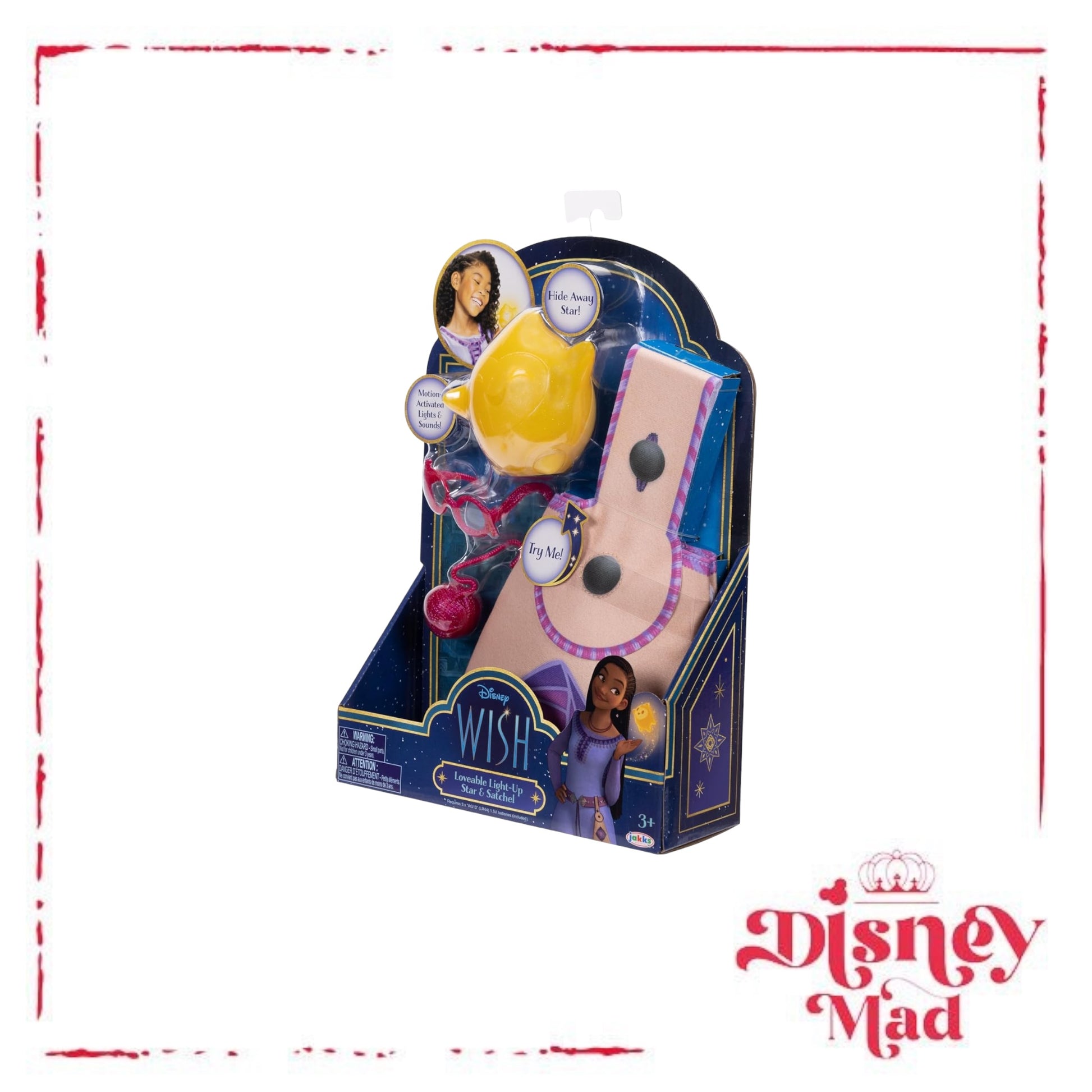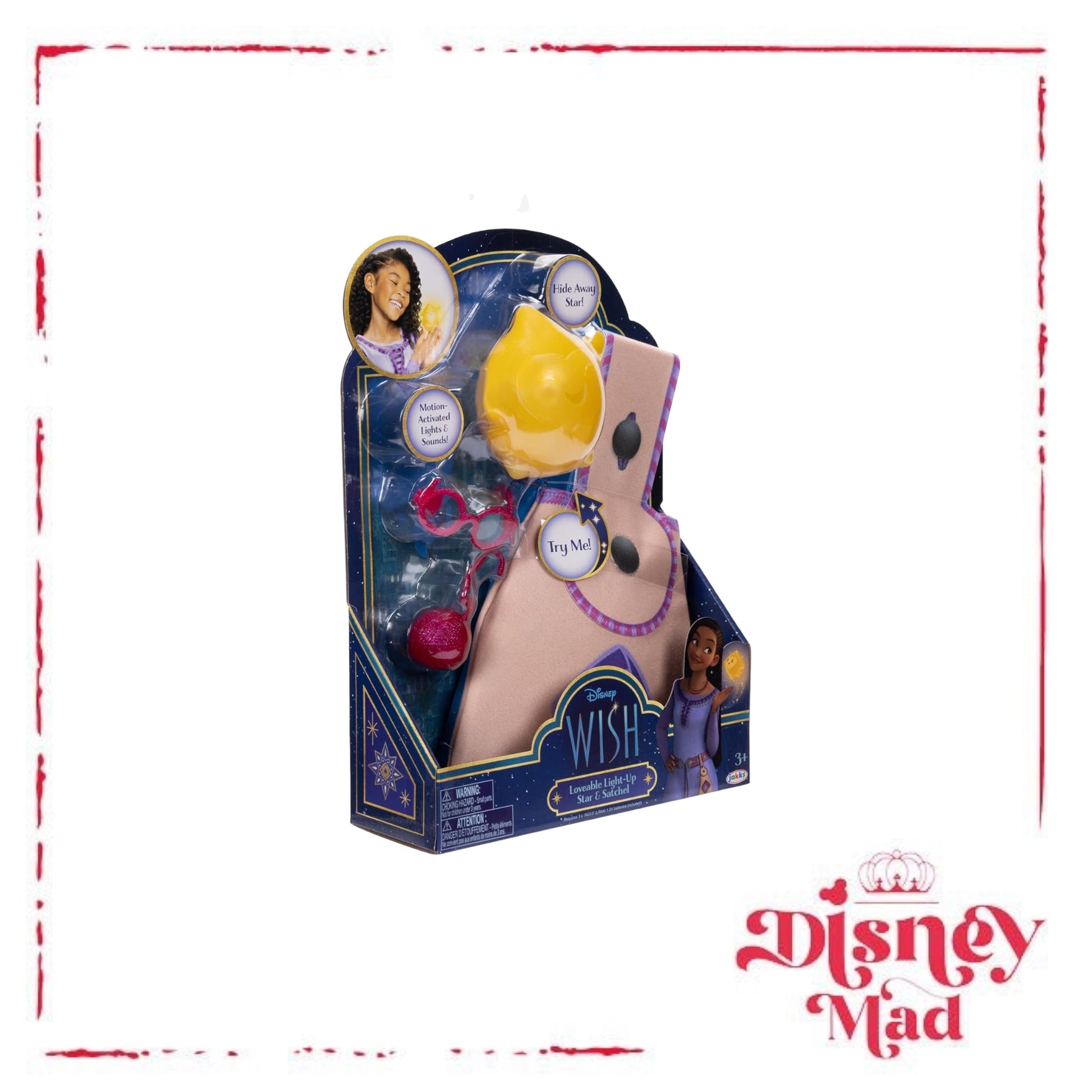 Every day is a magical adventure with your very own Loveable Light-Up Star & Satchel. Imagine that you’re on a journey to free the wishes of the people of Rosas, just like Asha from Disney’s new animated musical movie Wish. Handheld Star makes adorable sounds and lights up. Embedded with glitter, Star’s soft squishy body sparkles like magic. Includes play yarn, yarn glasses for Star to wear and a satchel to hide Star away.- Warning Message: Warning: Adult supervision at all times. Not suitable for children under 3 years