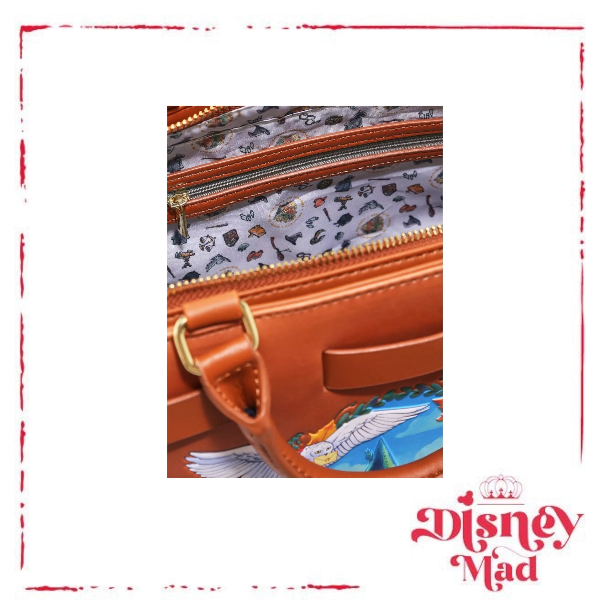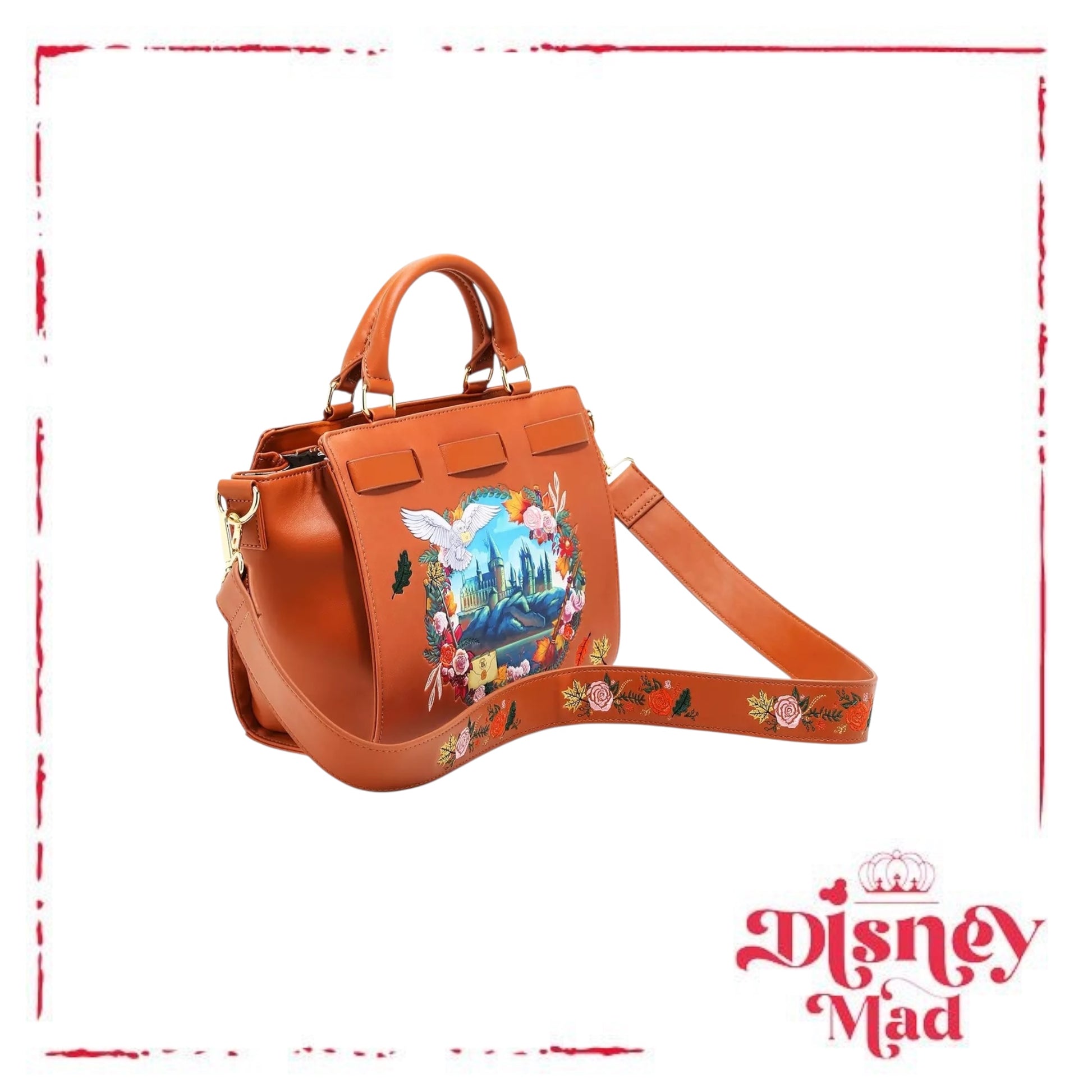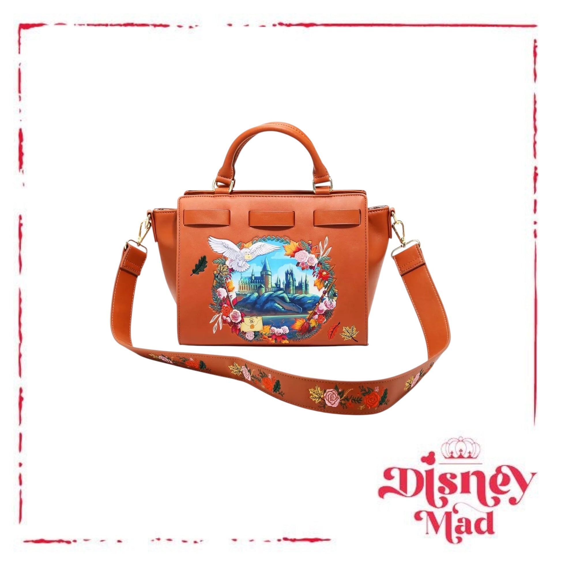 Take the magic of the Wizarding World with you on all your adventures with this Harry Potter-inspired handbag! Take in the vivid scenery of Hogwarts with the front outside graphic. An embroidered and embossed wreath featuring Hedwig holding your acceptance letter encases the scene, giving you a front row seat to the beauty of your new school of witchcraft and wizardry! Also features gold-toned hardware, interior zippered pocket, removable embroidered floral strap to wear as a crossbody bag, and watercolor-style Harry Potter icons interior lining.