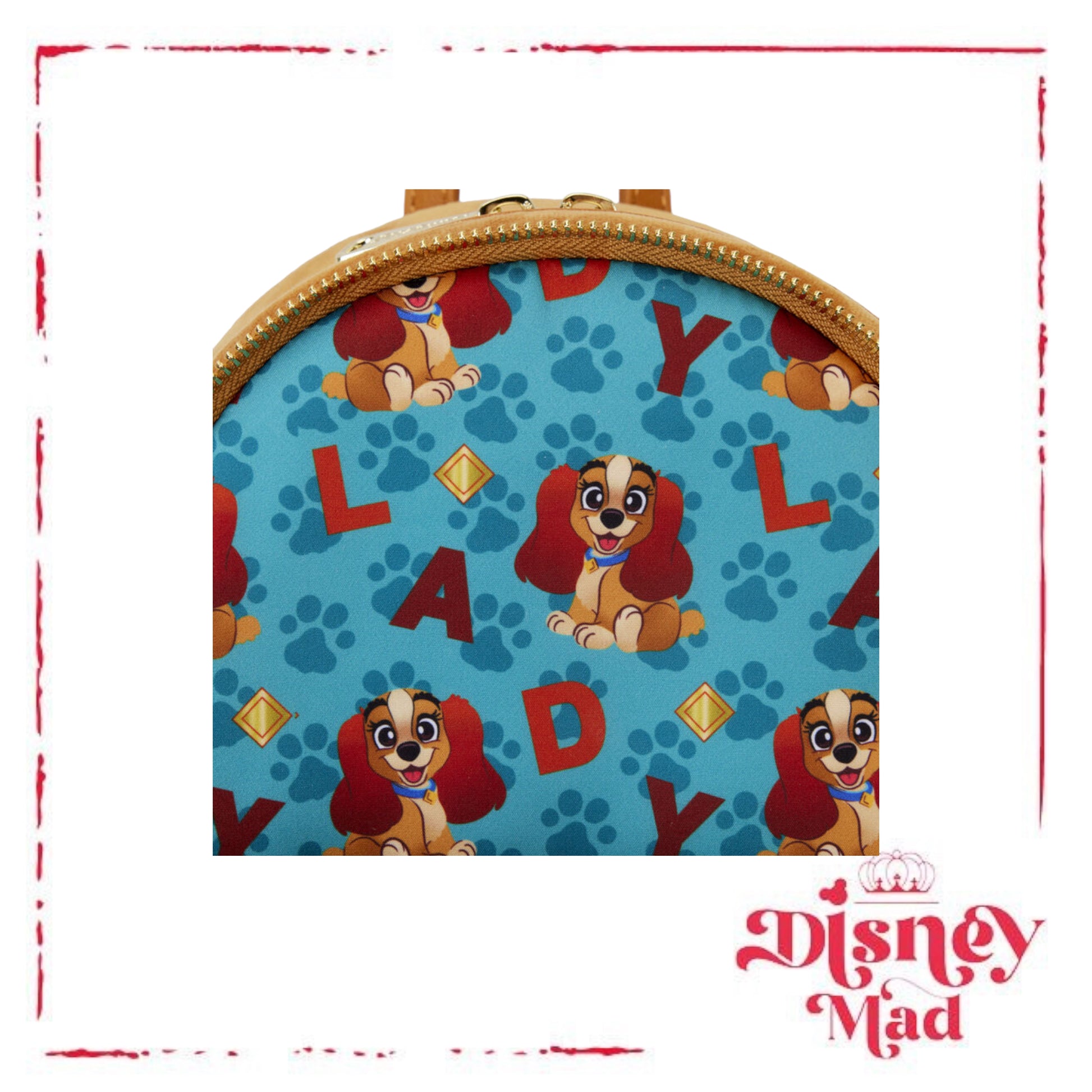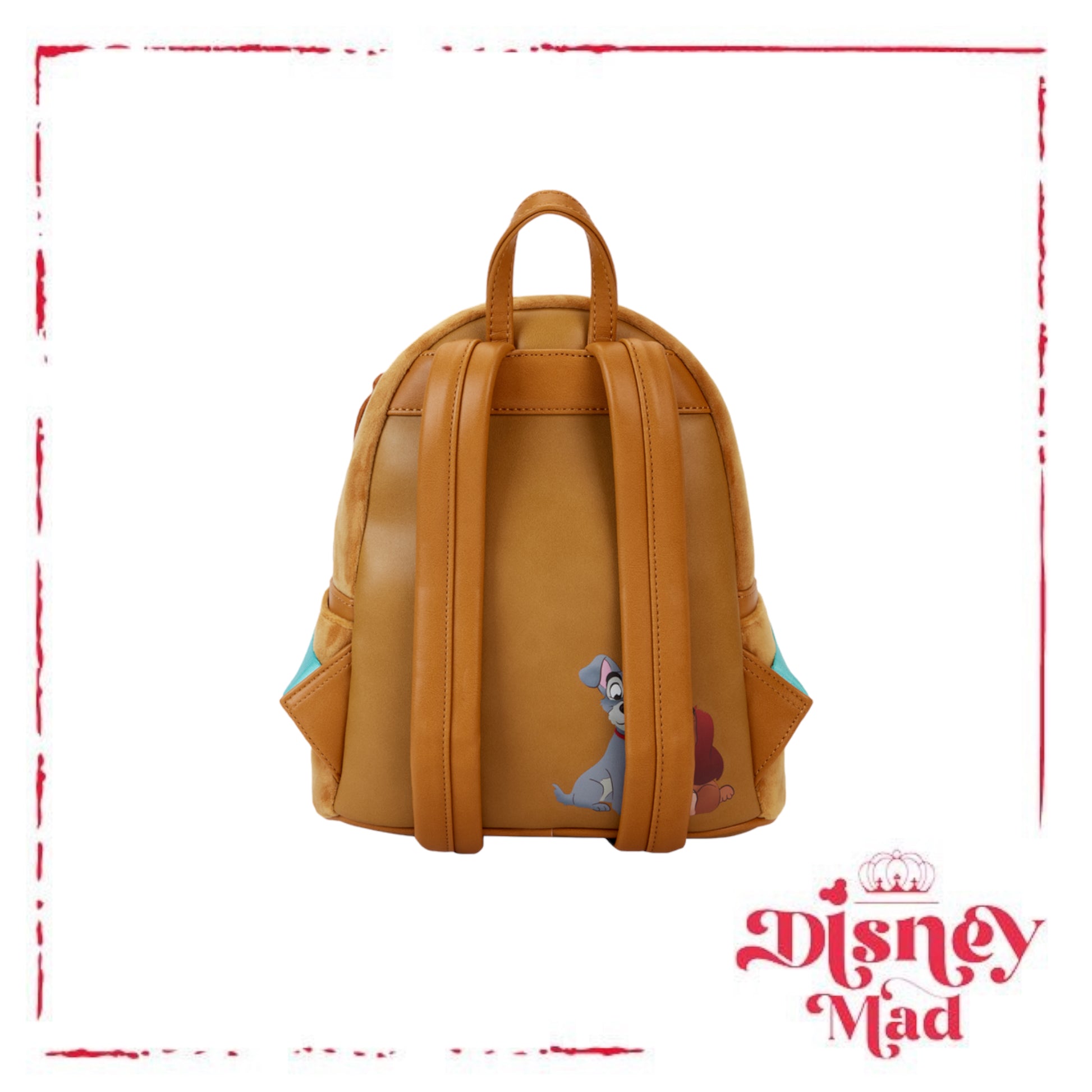 The exclusive Loungefly Disney Lady and The TrampCosplay Plush Mini Backpack is made of vegan leather (polyurethane). Bag has adjustable shoulder straps, side pockets, and gold-colored metal hardware. Additional features include a gold-metal molded charm, applique, printed, embroidered, and plush details. Take note of the coordinating inside lining.