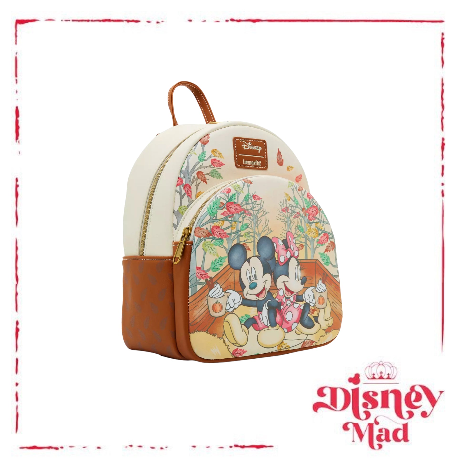 Mickey Mouse and Minnie Mouse are ready for fall! Bring along your favorite couple on your next pumpkin spice latte run with this mini backpack. Featuring the duo enjoying some pumpkin-flavored beverages surrounded by autumn leaves on the front zipper pocket. Comes adjustable straps, interior drop pocket and top carrying handle.