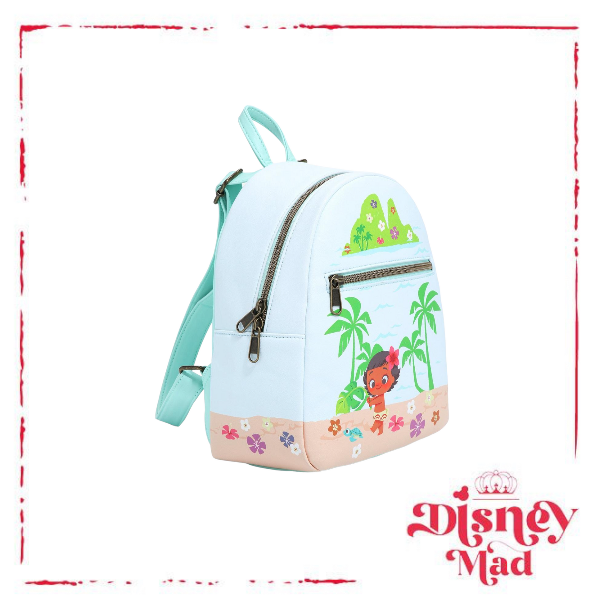 Collecting seashells along the beach shore with Moana? Keep your hands free for playing with turtles by storing them in this cute mini backpack! From Moana, this backpack has a print that mimics the ocean and shoreline. The island of Te Fiti is featured above the front zipper pocket, with a print of baby Moana playing with a turtle among the palm trees below. Comes with adjustable straps, top carrying handle, interior drop pocket and top zipper closure.