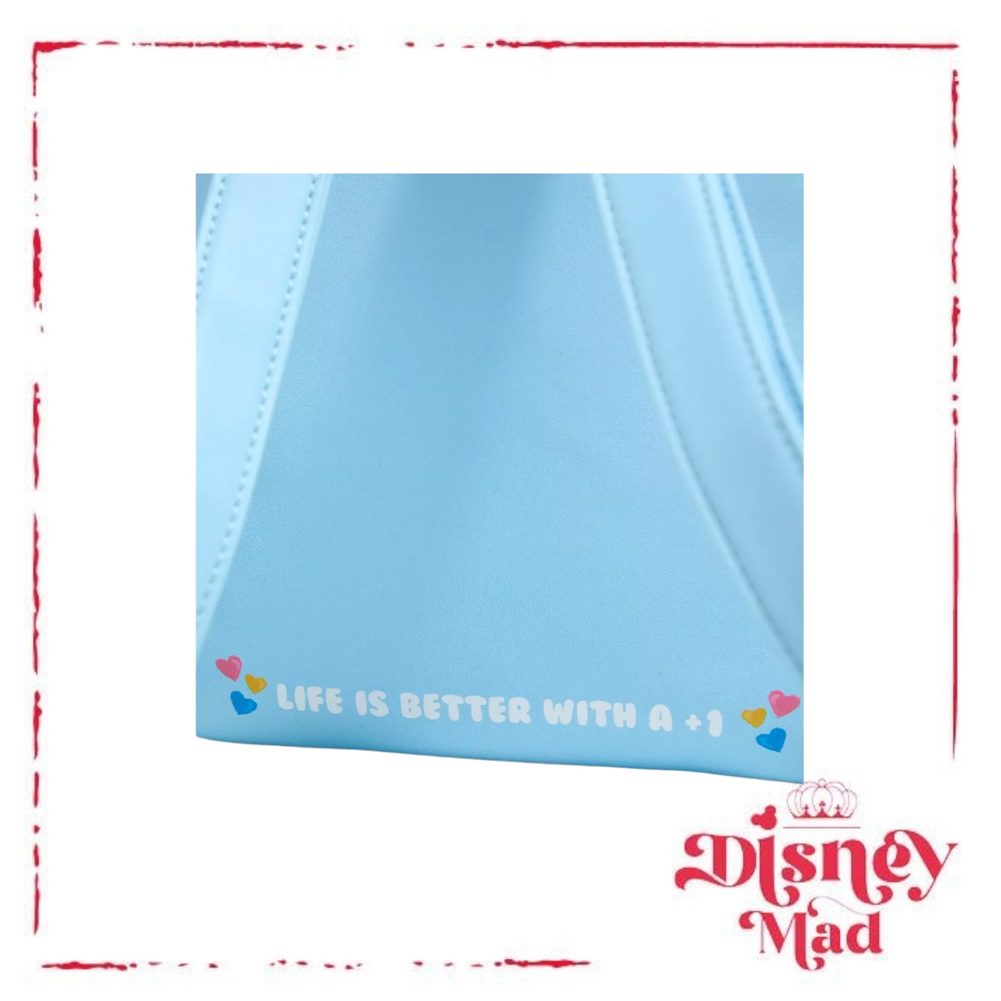 Pack up your essentials for your next adventure with this Up mini backpack! Featuring a drawing of older Carl and Ellie surrounded by hearts. "Life is better with a +1" is highlighted on the back with more hearts. Comes with adjustable straps, front zipper pocket, interior drop pocket and top carrying handle.