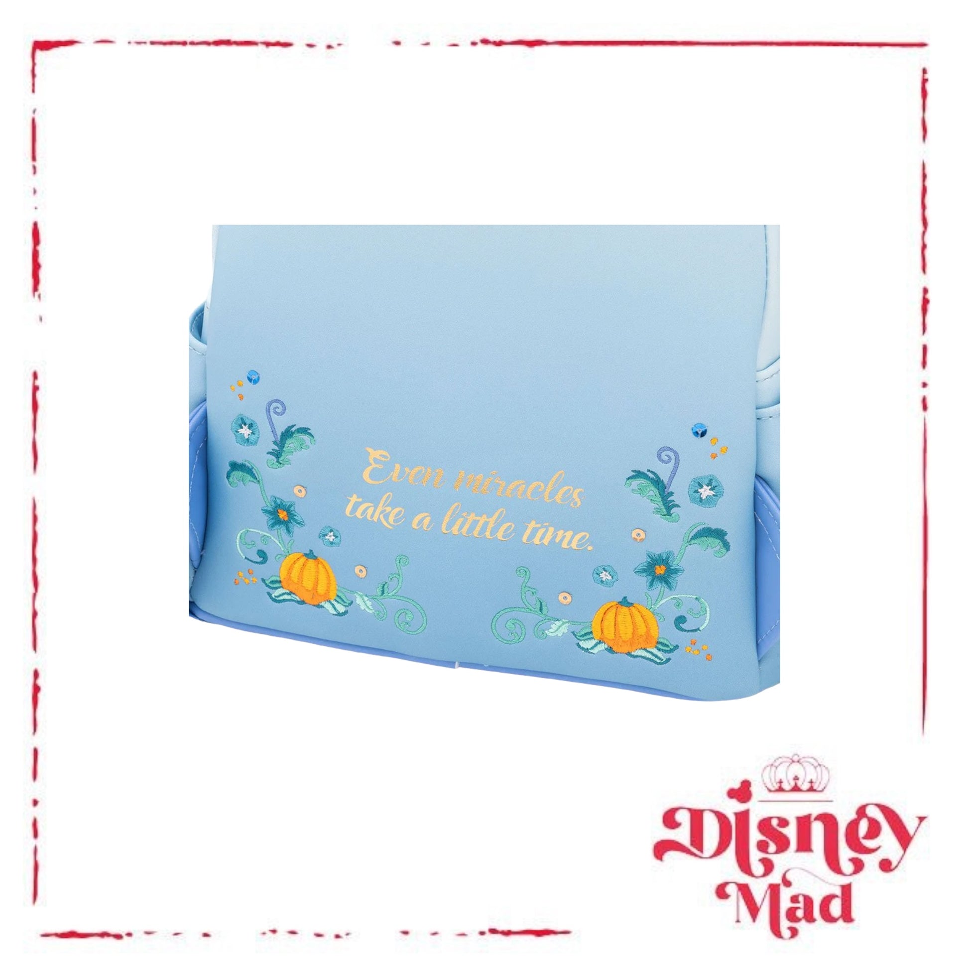 A dream is a wish your heart makes, and the 707 Street Exclusive - Disney Princess Dreams Series Cinderella Mini Backpack is what dreams are made of! This faux leather Loungefly mini backpack features a floral and pumpkin print adored in embroidery and sequin details. On the front pocket, you'll find a print of the scene when the Fairy Godmother transformed a pumpkin into her magic carriage surrounded by an applique window. It wouldn't be a Cinderella bag without a glass slipper, which you can spot as the zipper pull! On the back, the floral pattern shows up once more surrounding the quote "Even miracles take a little time". Bippity Boppity Boo, this is the bag for you!