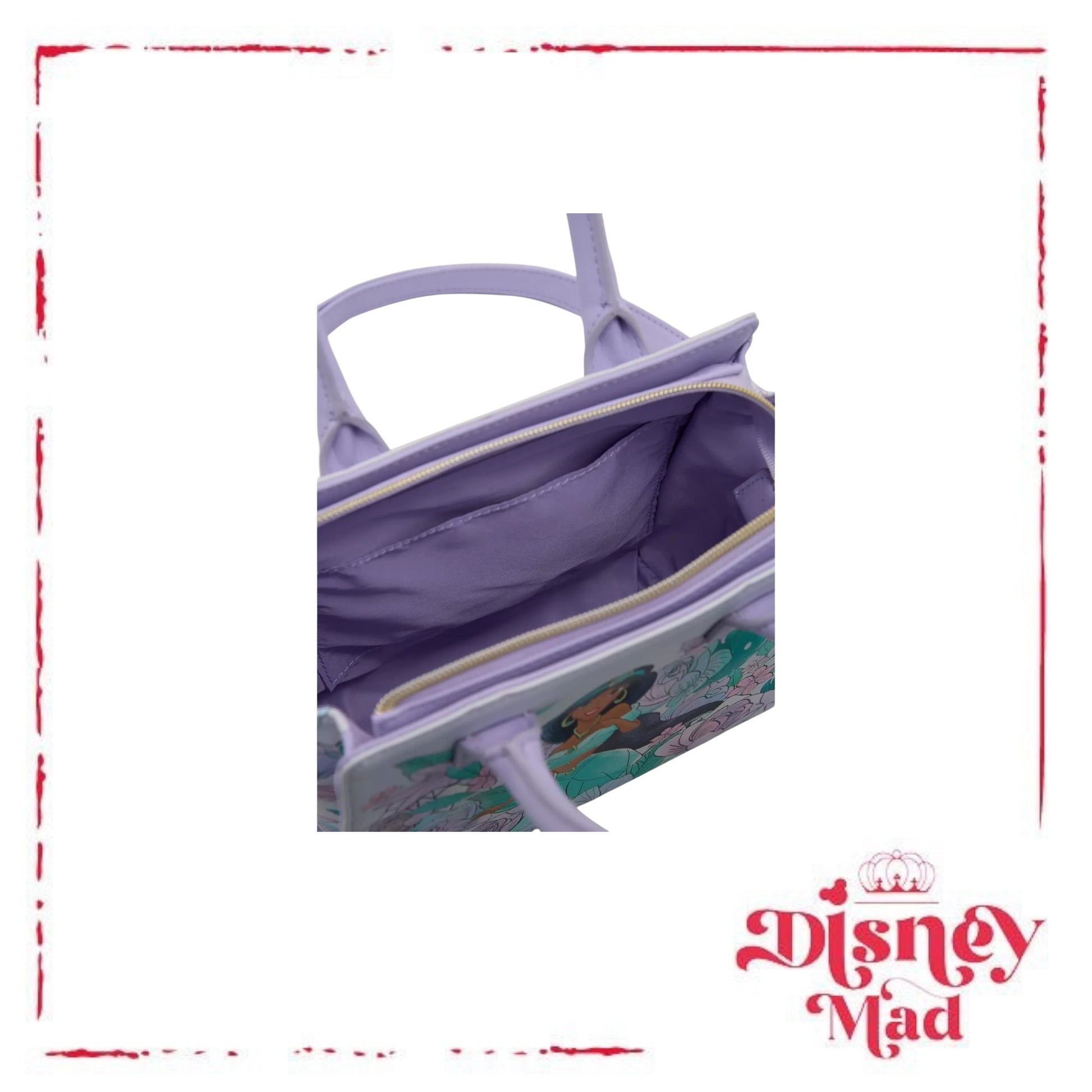 This pretty lavender mini satchel bag is decorated with a portrait of Princess Jasmine from Aladdin, surrounded by soft-hued flowers and foliage, across the sides and back as well. Top carrying handle, interior drop pocket and removable, adjustable shoulder strap.
