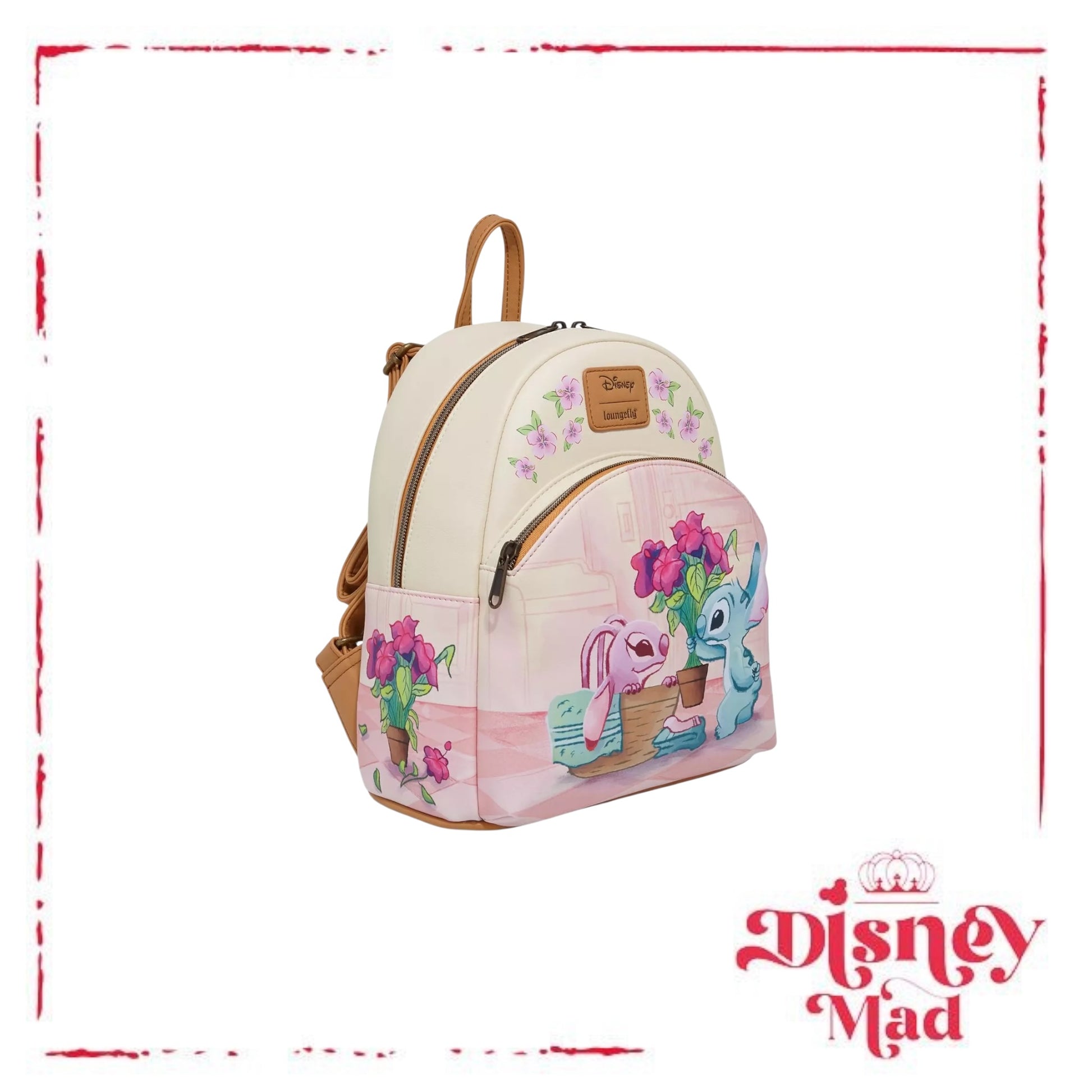 Laundry date? Pack your essentials into this Stitch mini backpack! It features an adorable scene of Stitch giving Angel flowers during their laundry time. Comes with interior drop pocket, front zipper pocket, top carrying handle and adjustable straps.