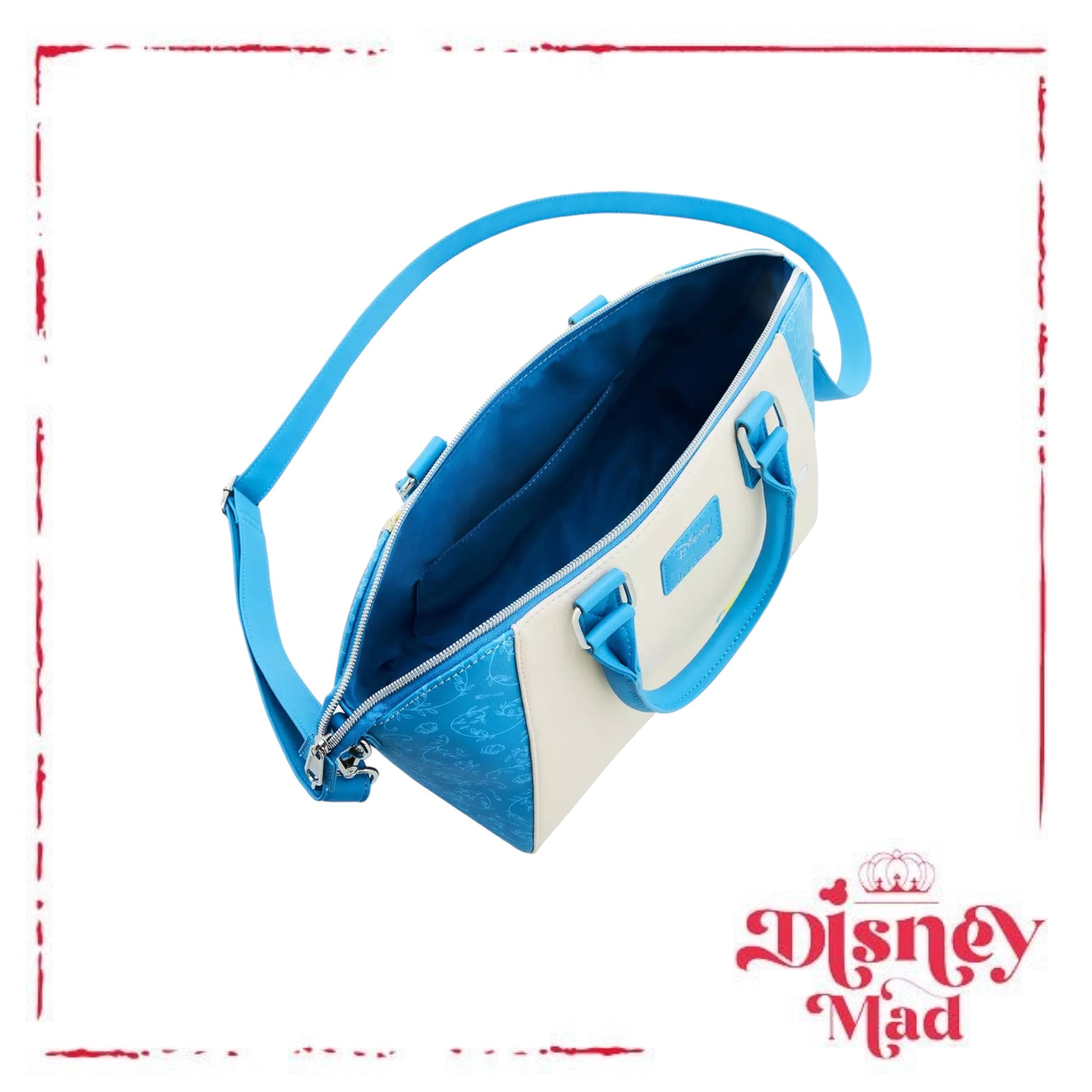 Watch the love story of Ariel and Prince Eric unfold on this satchel bag! One panel shows the two dancing romantically, and the other panel shows Flounder and Sebastian. There is an interior pocket, top carrying handles and removable, adjustable shoulder strap.