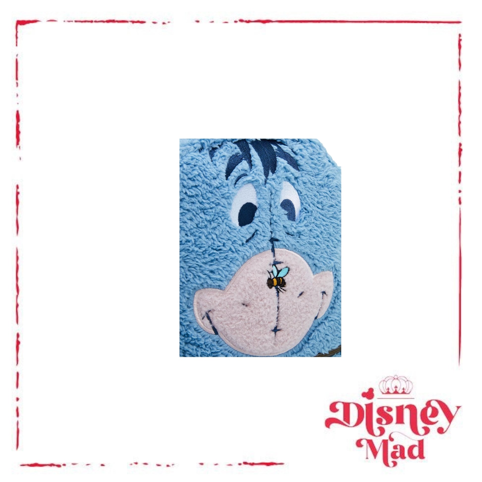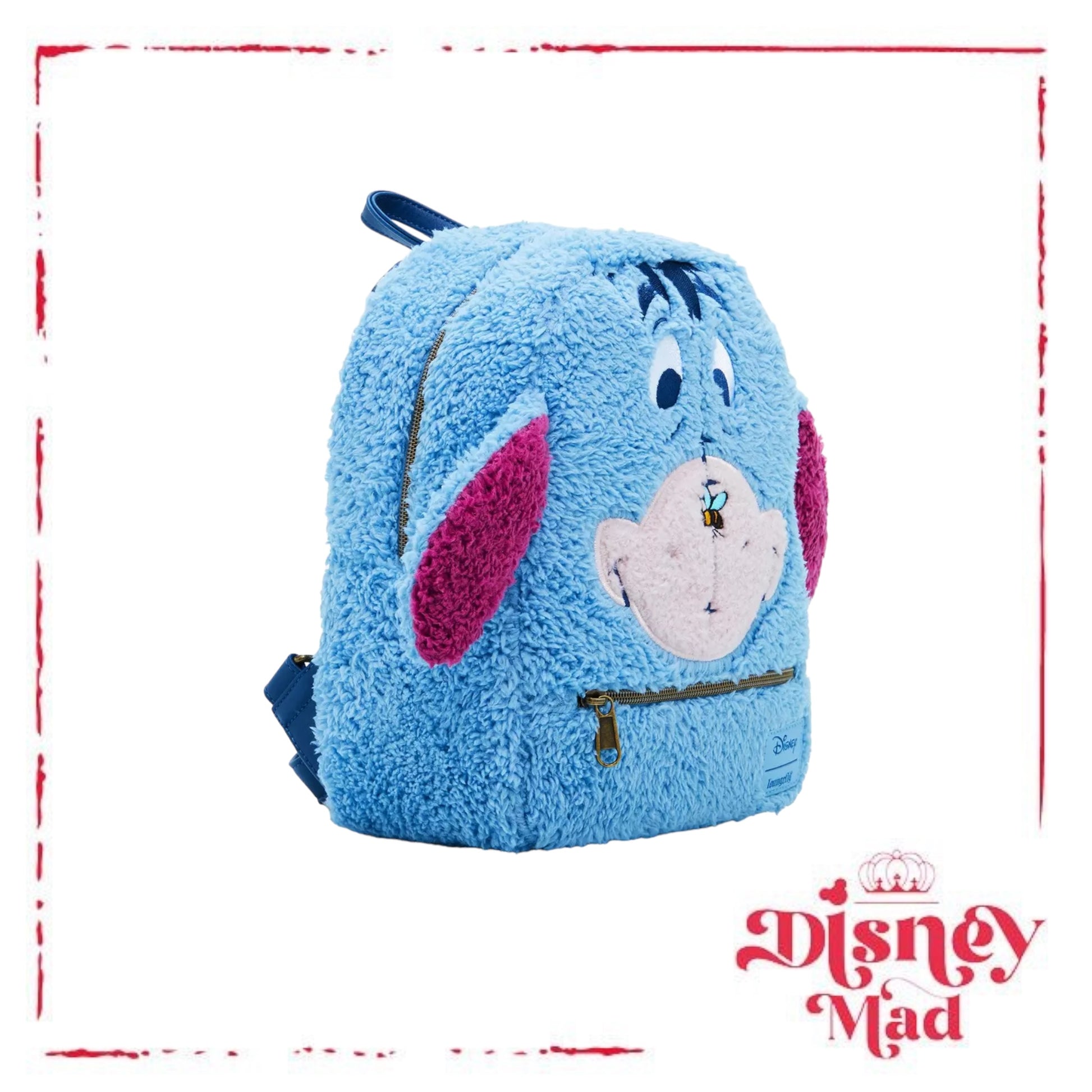 Let the melancholy donkey known as Eeyore join you on adventures with this fuzzy figural mini backpack! It's made to look like Eeyore'es face with a hunny bee perched on his nose. Features 3D ears appliquéd and embroidered details, a front pocket, interior pocket and adjustable straps.
