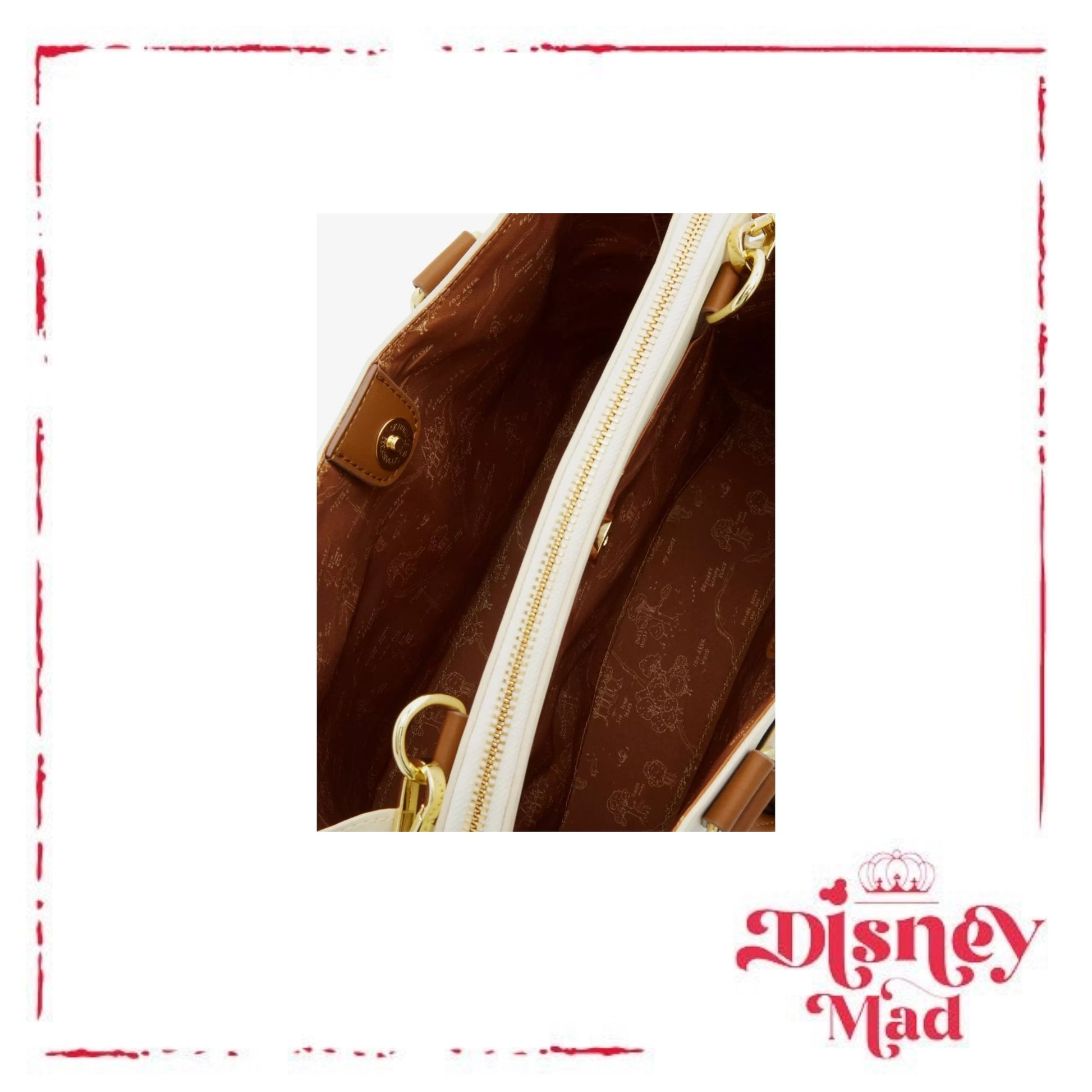 Get ready to travel with this Winnie the Pooh-inspired handbag! Featuring an applique of Christopher Robin, Pooh Bear, Piglet, Eeyore, and Tigger in a hot air balloon, this bag includes a design of the Hundred Acre Wood across the front. With a portrait of Rabbit on the back, this bag includes two large pockets with magnetic closures, a center pocket with a zippered closure, top handles, and a removable crossbody strap, perfect for bringing along on your next adventure.