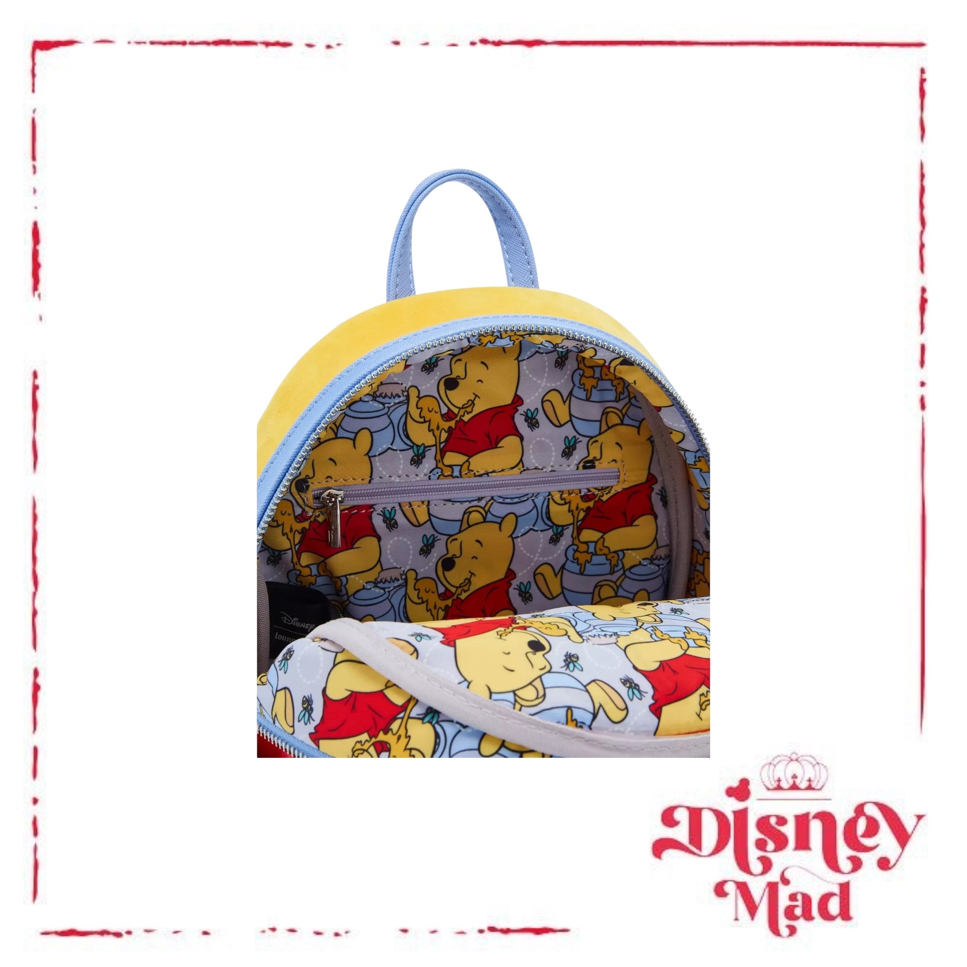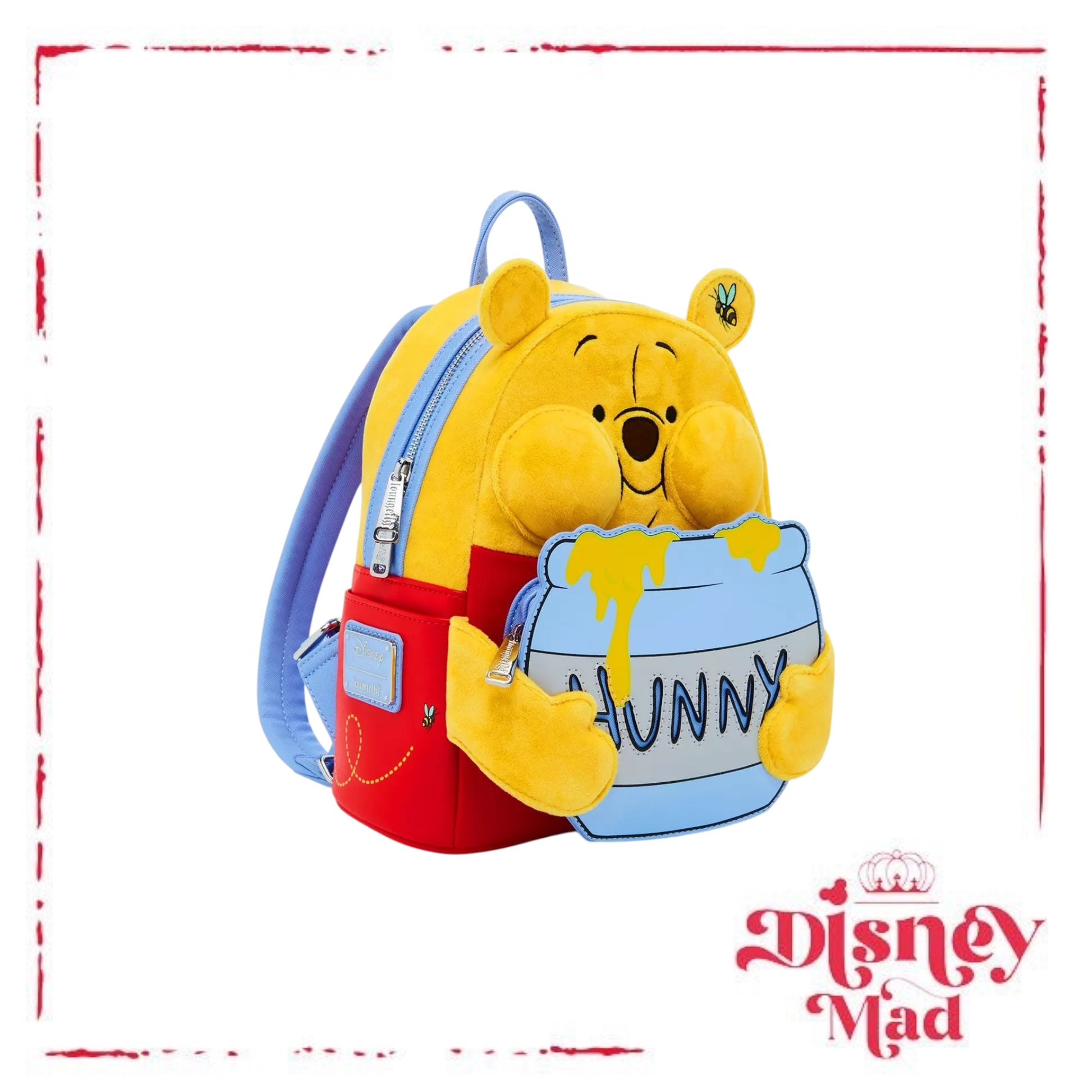 Head to the Hundred Acre Wood in style with this Winnie the Pooh-inspired mini backpack! Featuring a plush body, the front of this bag includes applique details of Pooh Bear's face, arms, and ears. With an applique of a "hunny" jar on the front pocket and a matching design on the back, this backpack is perfect for your next trip to the Disney Parks. Don't forget to pair with the matching cardholder sold separately!