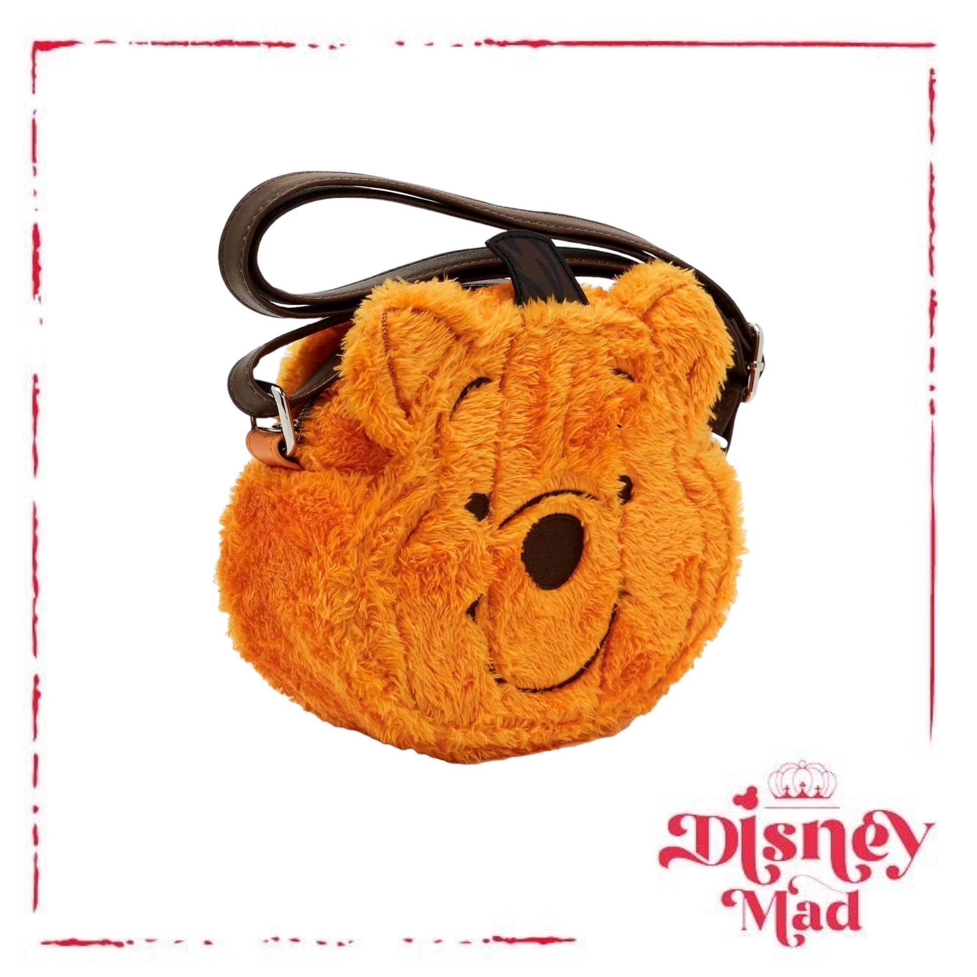 No Halloween costume? Take inspiration from Winnie the Pooh! This fuzzy, figural crossbody bag is shaped like Pooh Bear's head as a pumpkin, with embroidered detail. Interior pocket and adjustable shoulder strap.