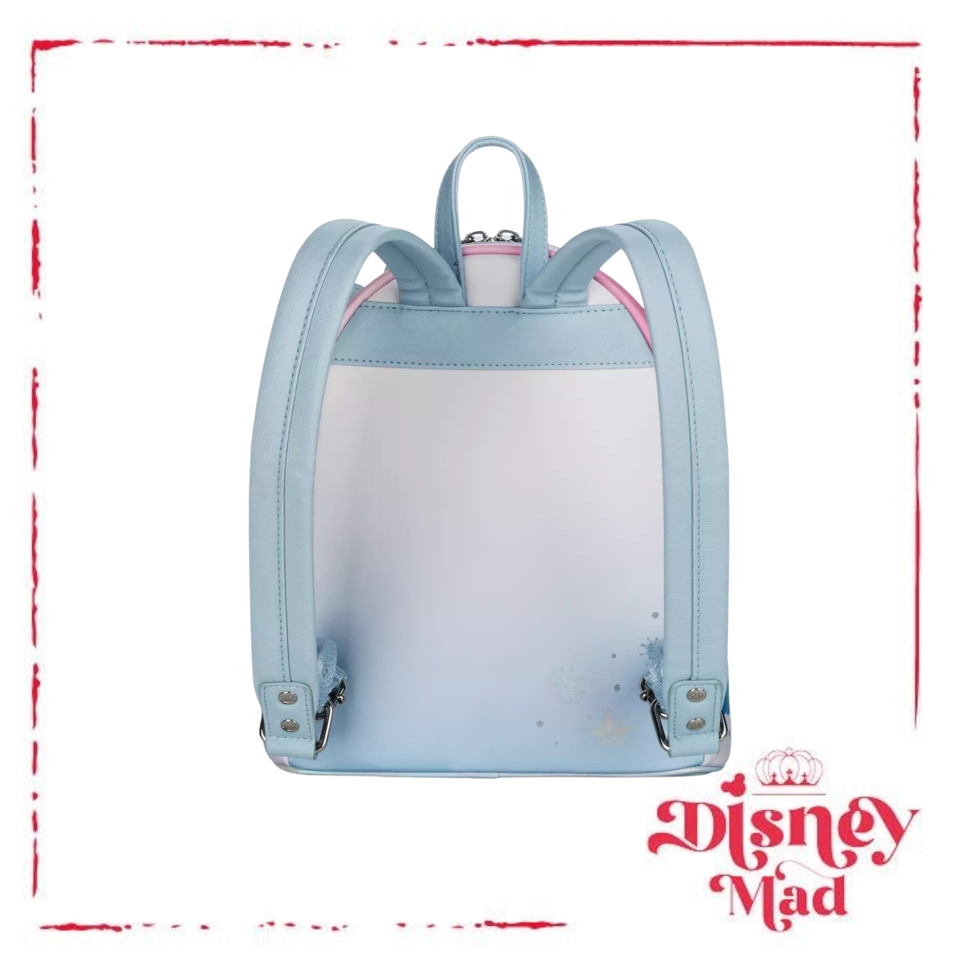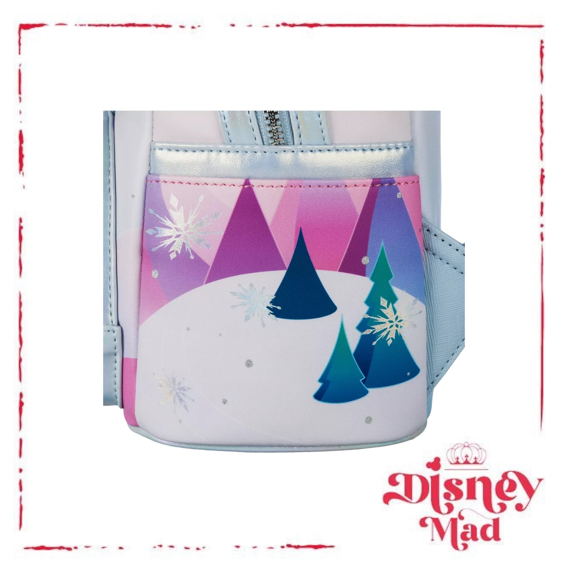 Stylised Anna and Elsa designs feature prominently on this Loungefly mini backpack. Screen art appliqués for the front plus matching patterns on the sides lets admirers of the animated favourite carry their everyday essentials away to new adventures in the Frozen fantasy world and beyond.