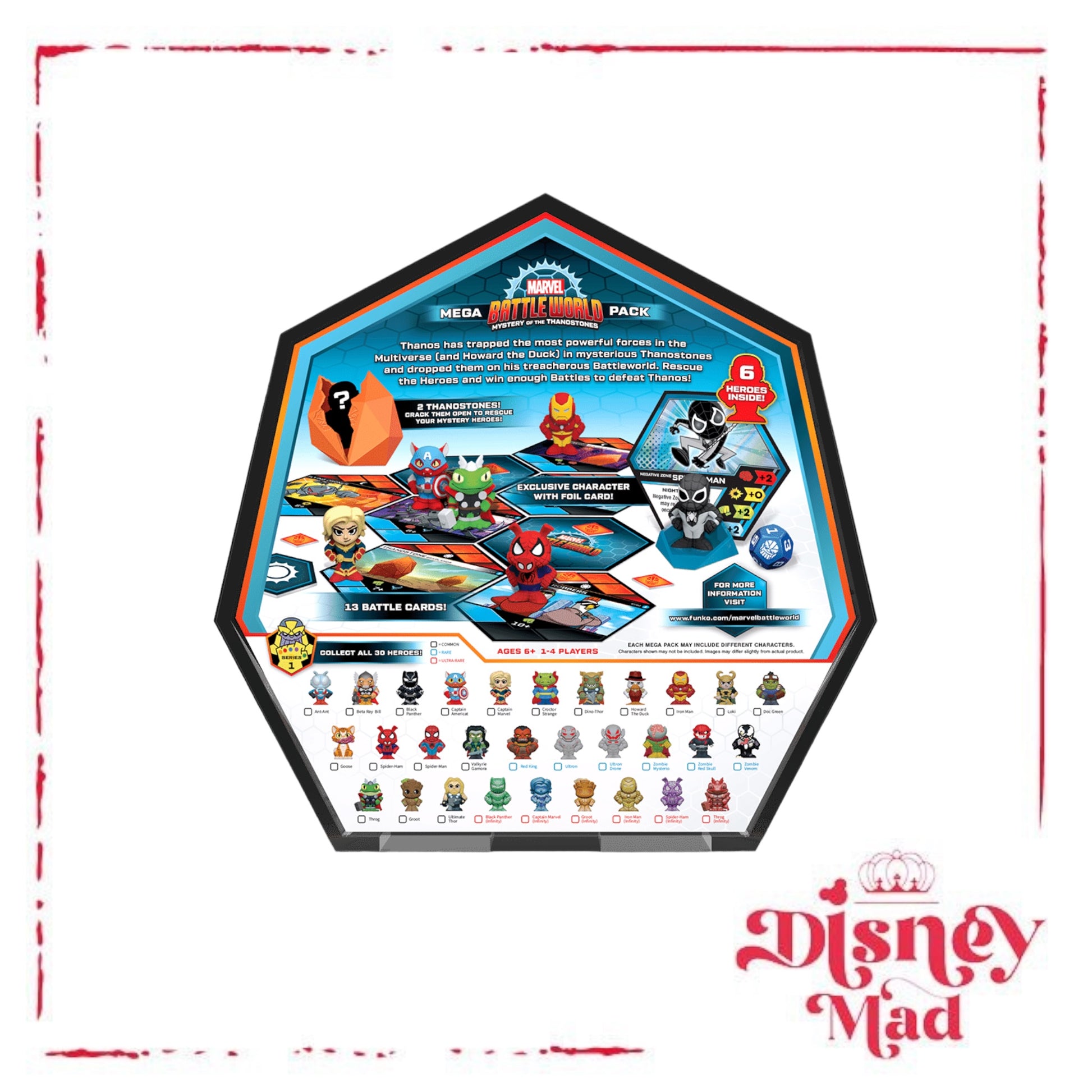 Mega Packs let you jumpstart your collection with six characters: four starting Heroes (including an exclusive Spider-Man (Negative Zone) variant) and two more trapped in Thanostones! Unique team-based or solo gameplay allows players to jump in to Battleworld right away!