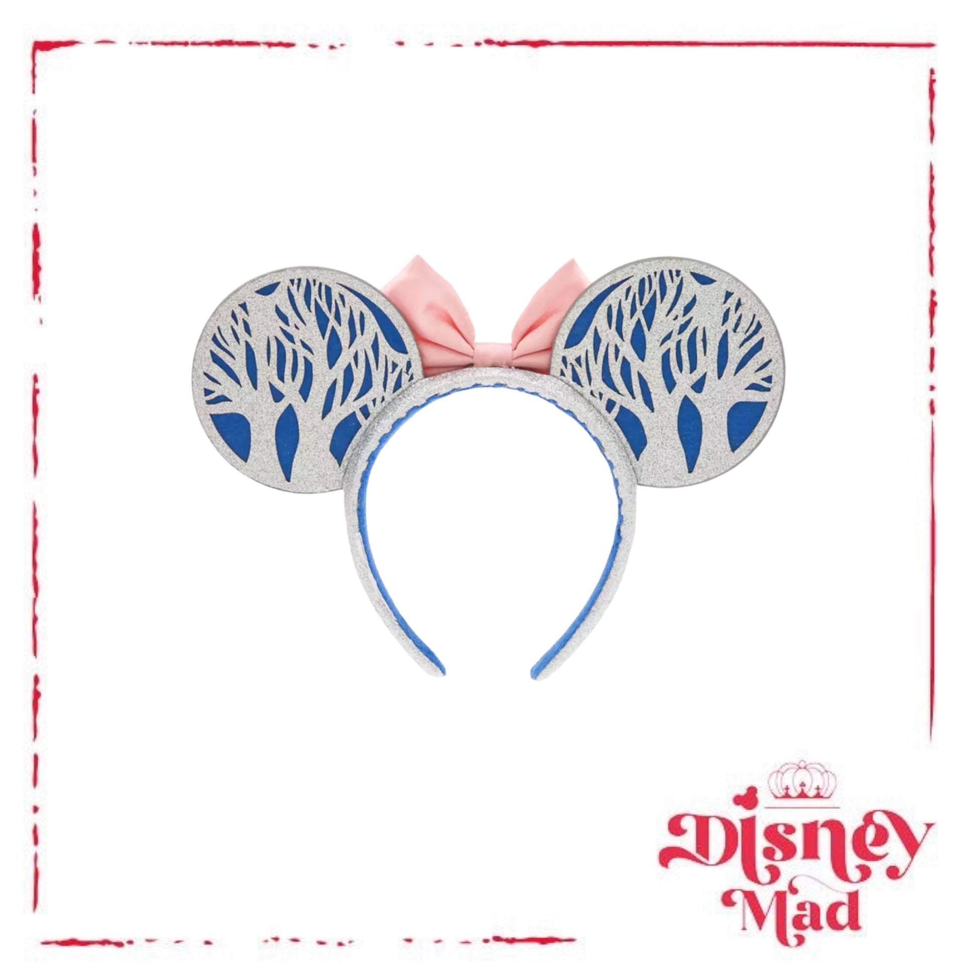 Mickey shakes the hand of a smiling snowman while Minnie enjoys ice skating in the wintry setting pictured on the ears of this holiday headband. Glittering silver trees are sprinkled with 3D snowflakes and sprout from the sparkling silver headband that's topped with a pretty pink satin bow.