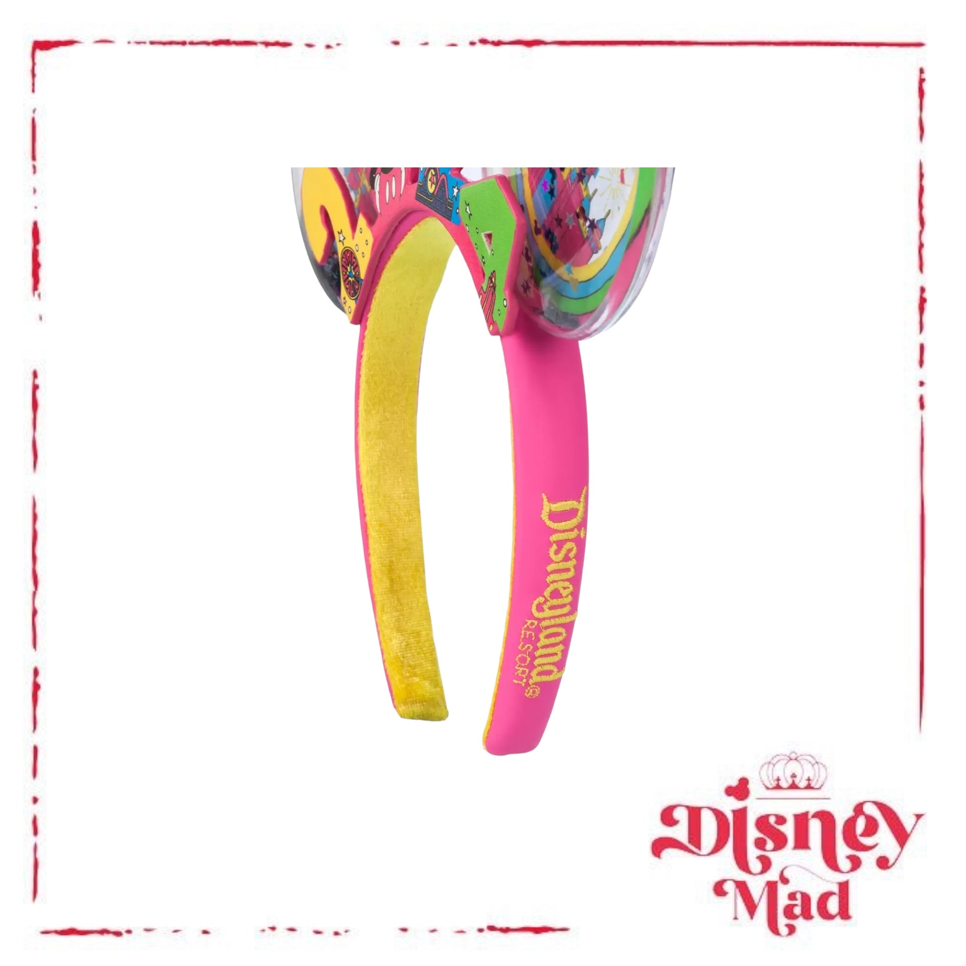 You'll be all ears for fun times in 2024 when wearing this Mickey Mouse headband with glitter filled ears surrounding Sleeping Beauty Castle, plus embroidered Disneyland logo on band.