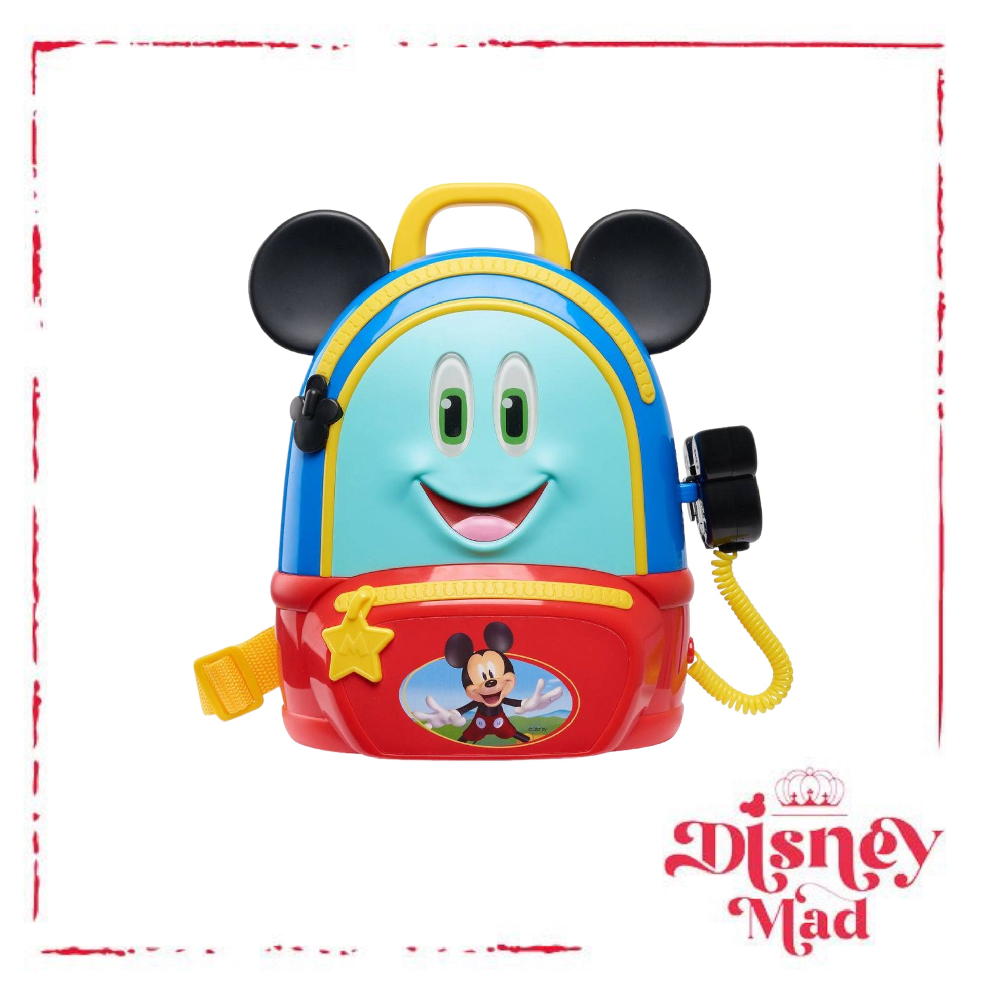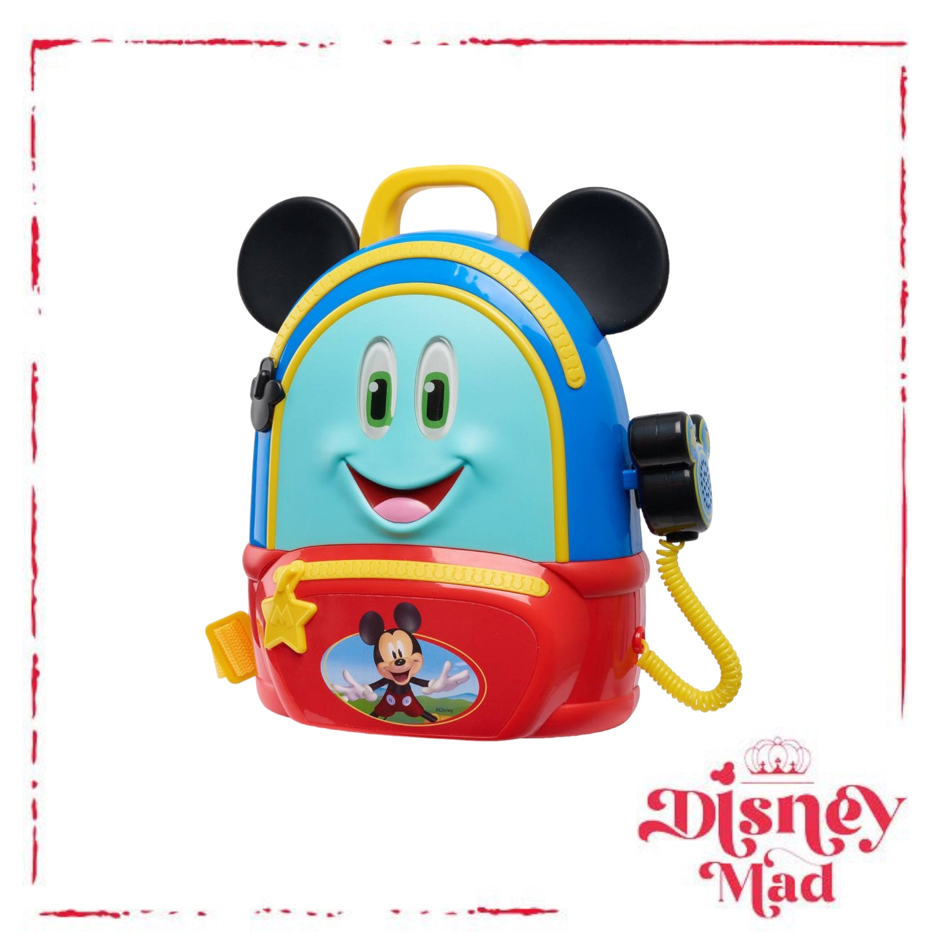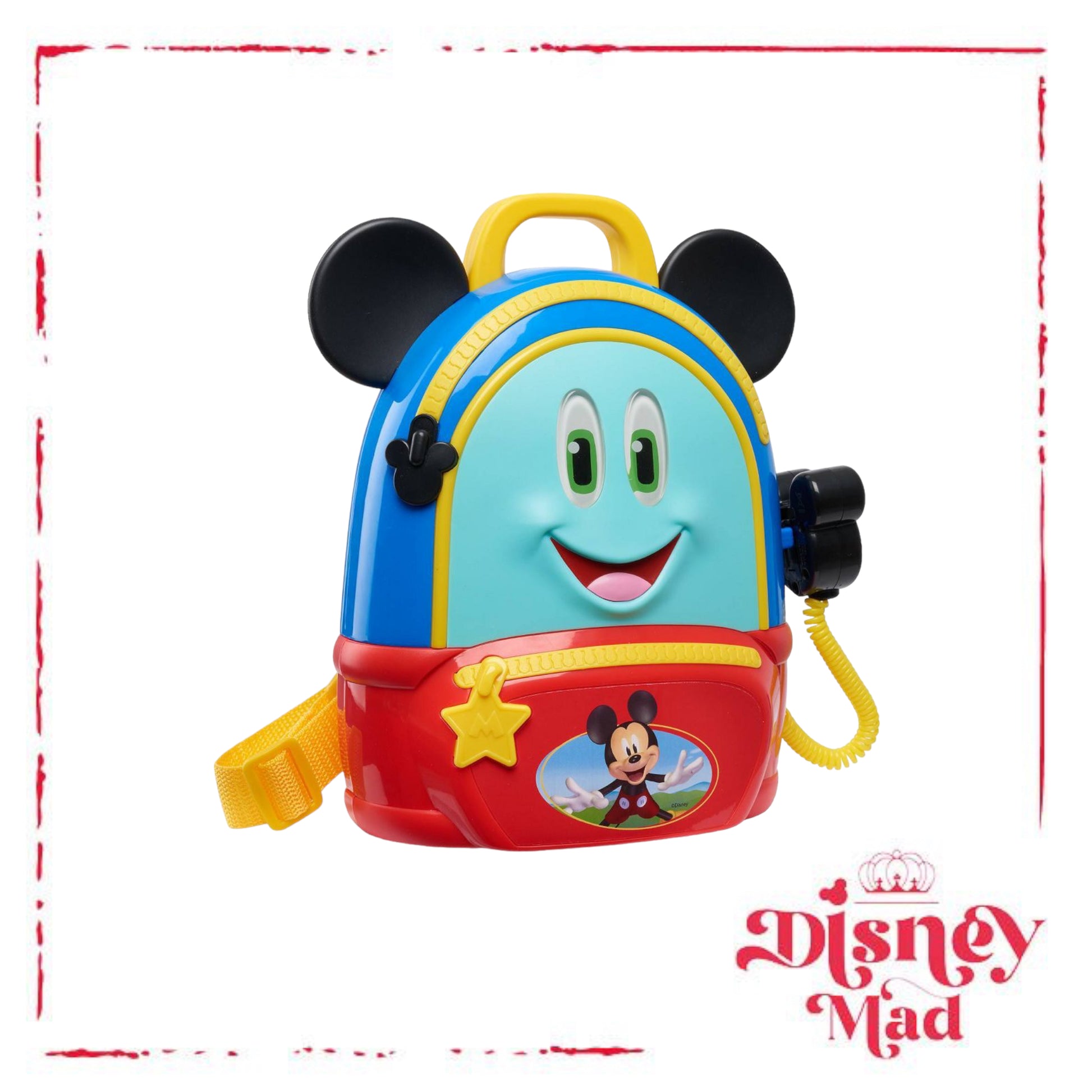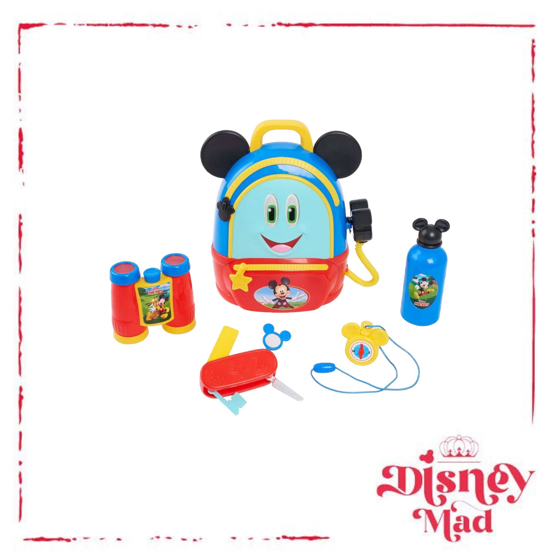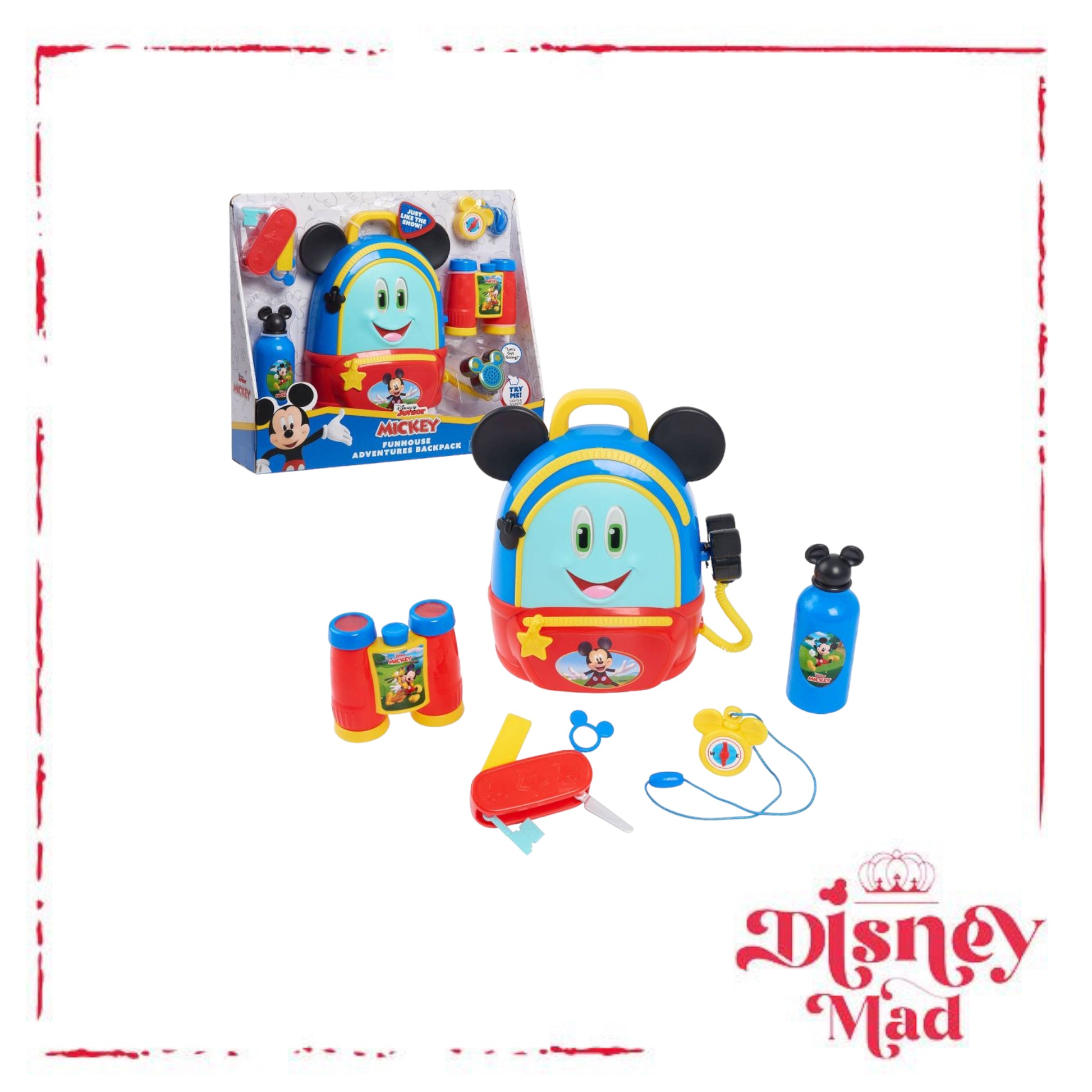 No adventure is too big with the Mickey Mouse Funhouse Adventures Backpack. Featuring Mickey Mouse’s signature ears and communicator attachment, this backpack looks just like the one from the Disney Junior series and has everything preschoolers need for a fun adventure! Kids will love using the play compass and binoculars to lead them on their fantastical journey! This adventurous role play set also comes with a multi-tool with four sliding attachments, including a pretend knife, pretend magnifying glass, ruler, and key. Press the button on the communicator for lights, sounds, and fun Mickey Mouse phrases! When the adventure is over, kids can open the backpack to store all the accessories. Designed with a carry strap and handle, this backpack is great for little adventurers to take on the go! The Mickey Mouse Funhouse Adventures Backpack includes a backpack, play compass, play binoculars, play multi-tool, play canteen, and play communicator. Requires 3 x AG13 batteries (included). Ages 3+