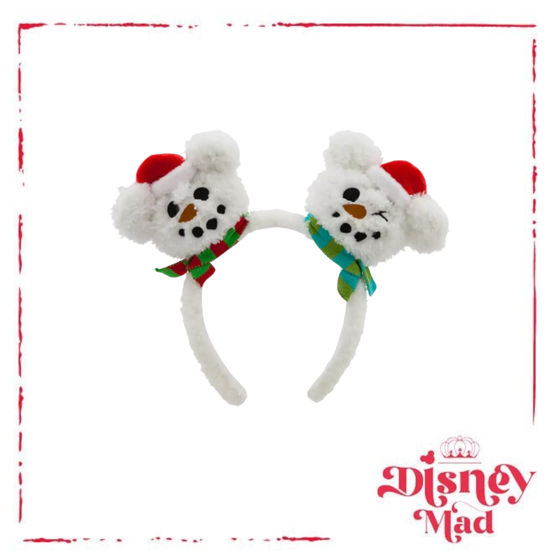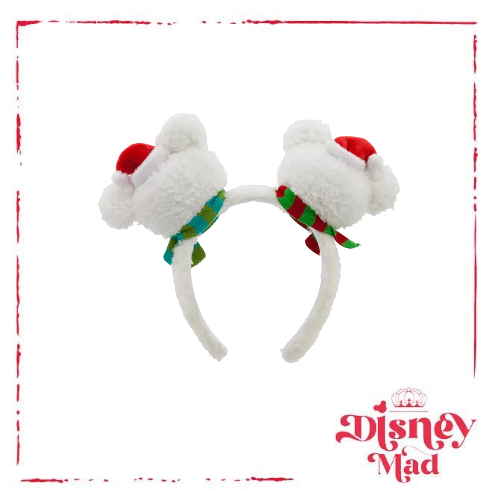 There's no business like snow business as Mickey is featured as a snowman on this happy holiday headband. Two soft plush Mickey heads are topped with Santa hats and accented with colorful scarves. They sit on a soft snowy white headband so you'll show plenty of holiday ch-ear everywhere you go!