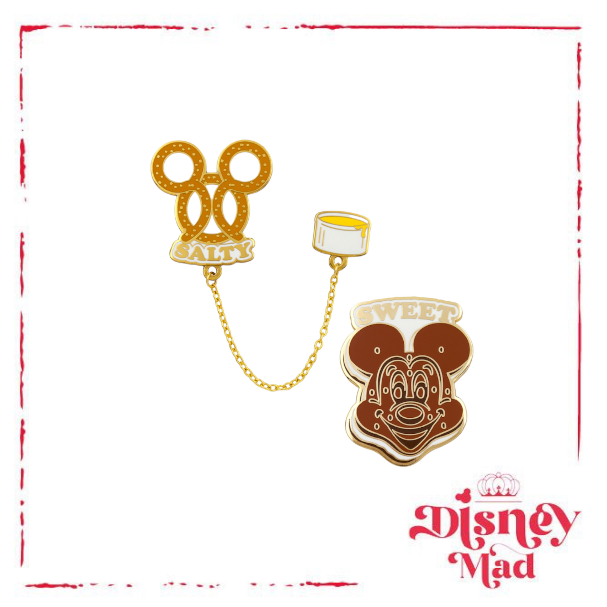 Features a Mickey pretzel and it reads, “SALTY”! Attached to the pretzel is a gold chain with a cup of cheese on the other end. The other pin features a Mickey Mouse ice cream sandwich and it reads, “SWEET” in gold lettering.