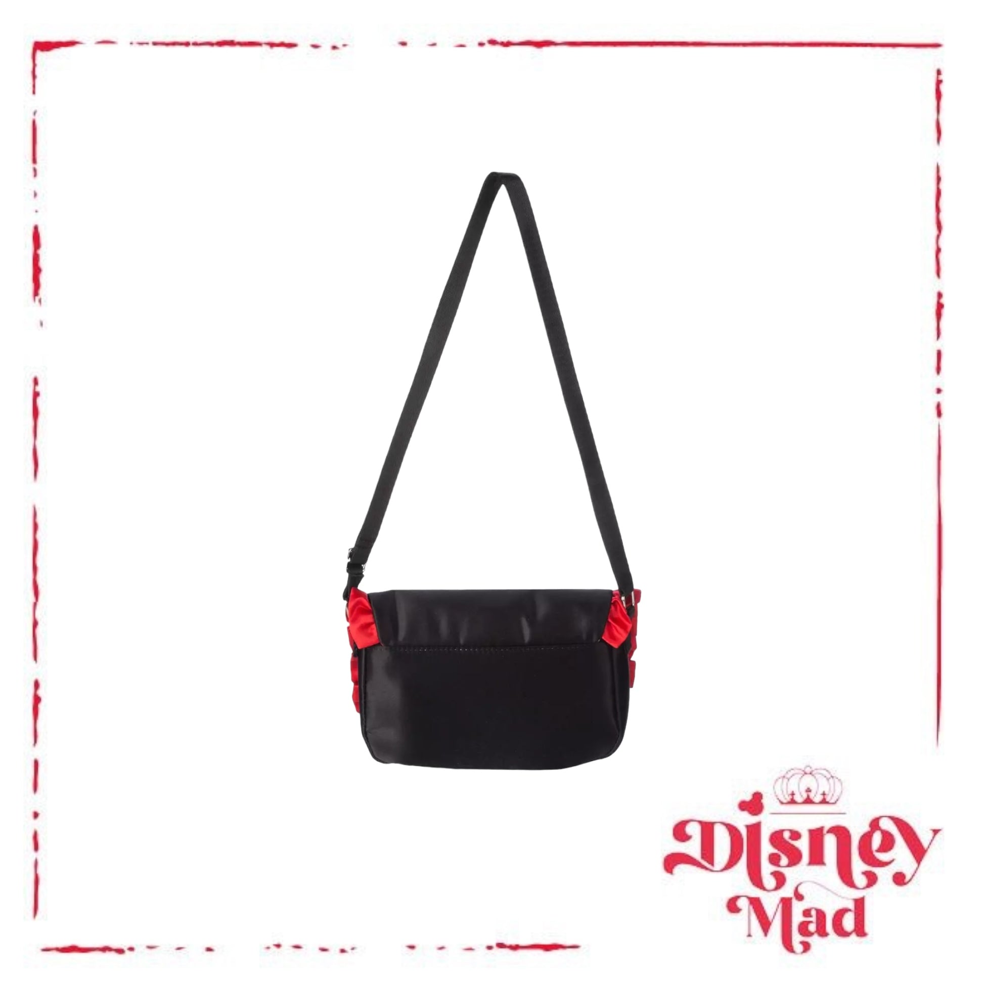 You'll be simply frilled with this adorably cute satin Minnie Mouse crossbody bag. Her iconic outline is silhouetted with silver sequins and topped with a red satin bow on the front flap which is edged in red ruffled satin. Her ''signature'' is embroidered on the front while the interior lining features her signature polka dot pattern.